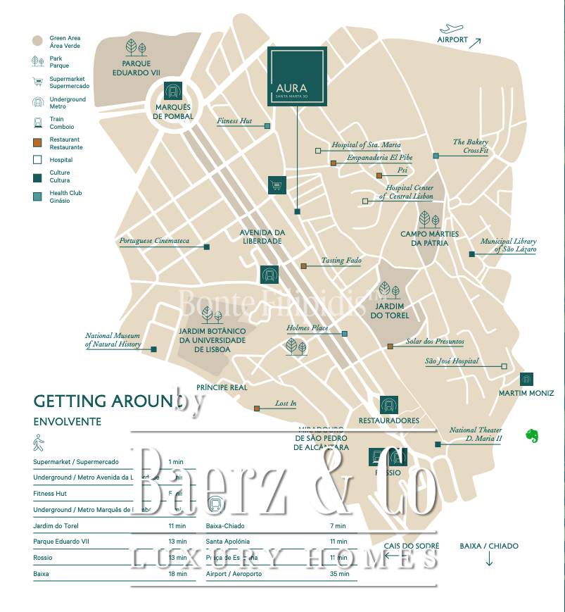 Situated in one of Lisbons most notable districts, Aura Residences balance modern living with traditional elements and nature. To the north lies the Marquês de Pombal roundabout and business centers, while the south leads to Rossio, known for its theaters, churches, and downtown cafés.