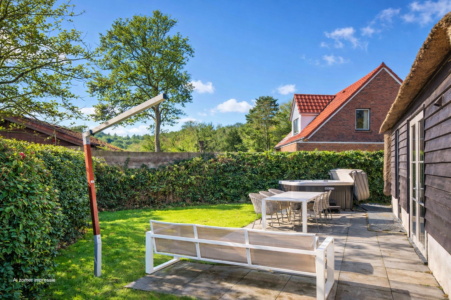 De tuin is heerlijk groen en biedt veel privacy. Hier vindt u een jacuzzi en zowel aan de voor- als achterzijde een terras. Daarnaast is er een eigen parkeerplaats met een laadpaal.