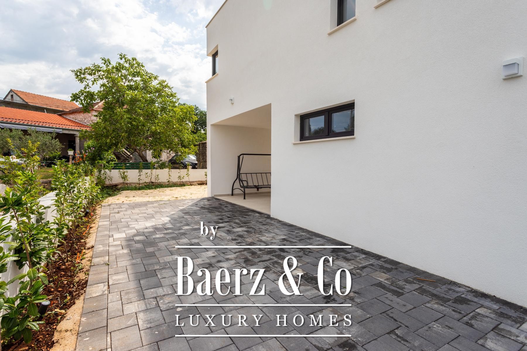 The flow of the interiors unfolds around a considered kitchen and living area on the ground floor, with storage spaces, technical amenities, and a guest bedroom. Light is amplified by full-height glazing, blending the living spaces with a broad yard. Outside, a covered summer kitchen with chimney, a private pool, sun area, and both covered and open parking complete the grounds. Six air-conditioning units, floor heating, and integrated solar systems ensure year-round comfort. The villa is presented fully furnished, curated by an interior designer to offer clarity and subtlety. This villa for sale in Šibenik - Okolica stands first row to the sea, offering immediate access to the beach and essential amenities, making it suitable as a private residence or a discreet investment opportunity.