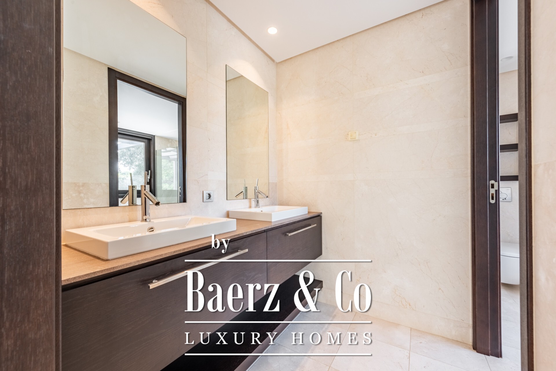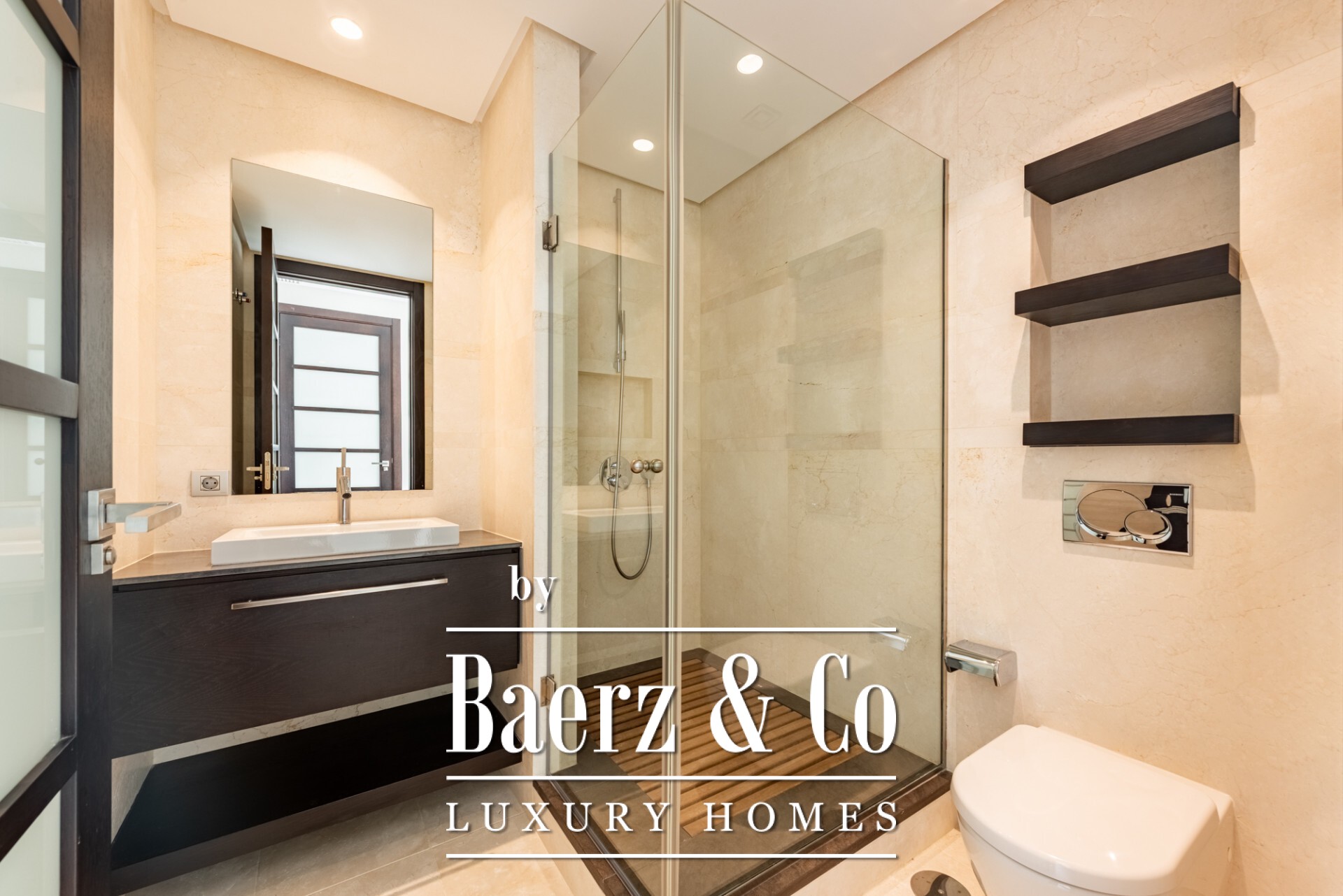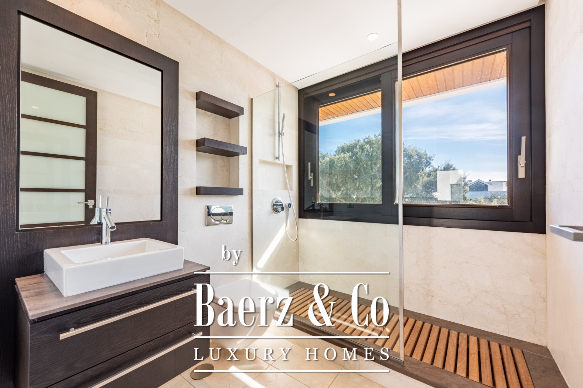 The main floor presents three bedroom suites, each benefitting from considered orientation and quiet outlooks, while the living and dining areas connect seamlessly to a fully fitted kitchen and utility room. The staircase rises to a master suite of presence and calm, framed by panoramic and partial sea views from its private terrace. Marble floors, underfloor heating, a smart home system, and double glazing offer comfort and control throughout.