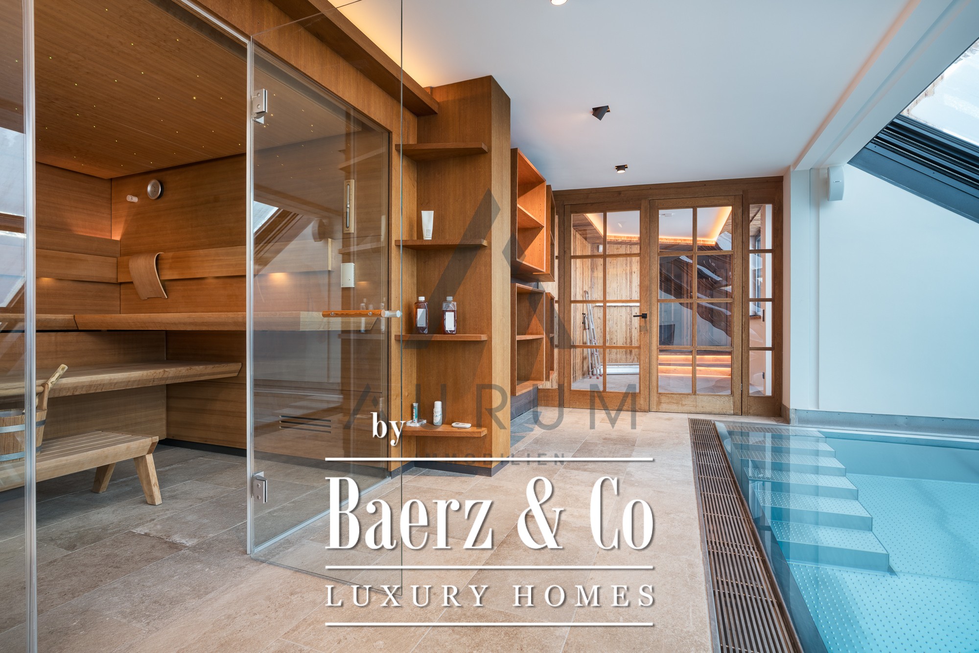 The private wellness area unfolds with an indoor pool, flexible glazing, and a sauna—inviting year-round retreat with views of the mountains. Security and comfort are quietly assured by an alarm system, video surveillance, floor heating, three carports, and additional parking.