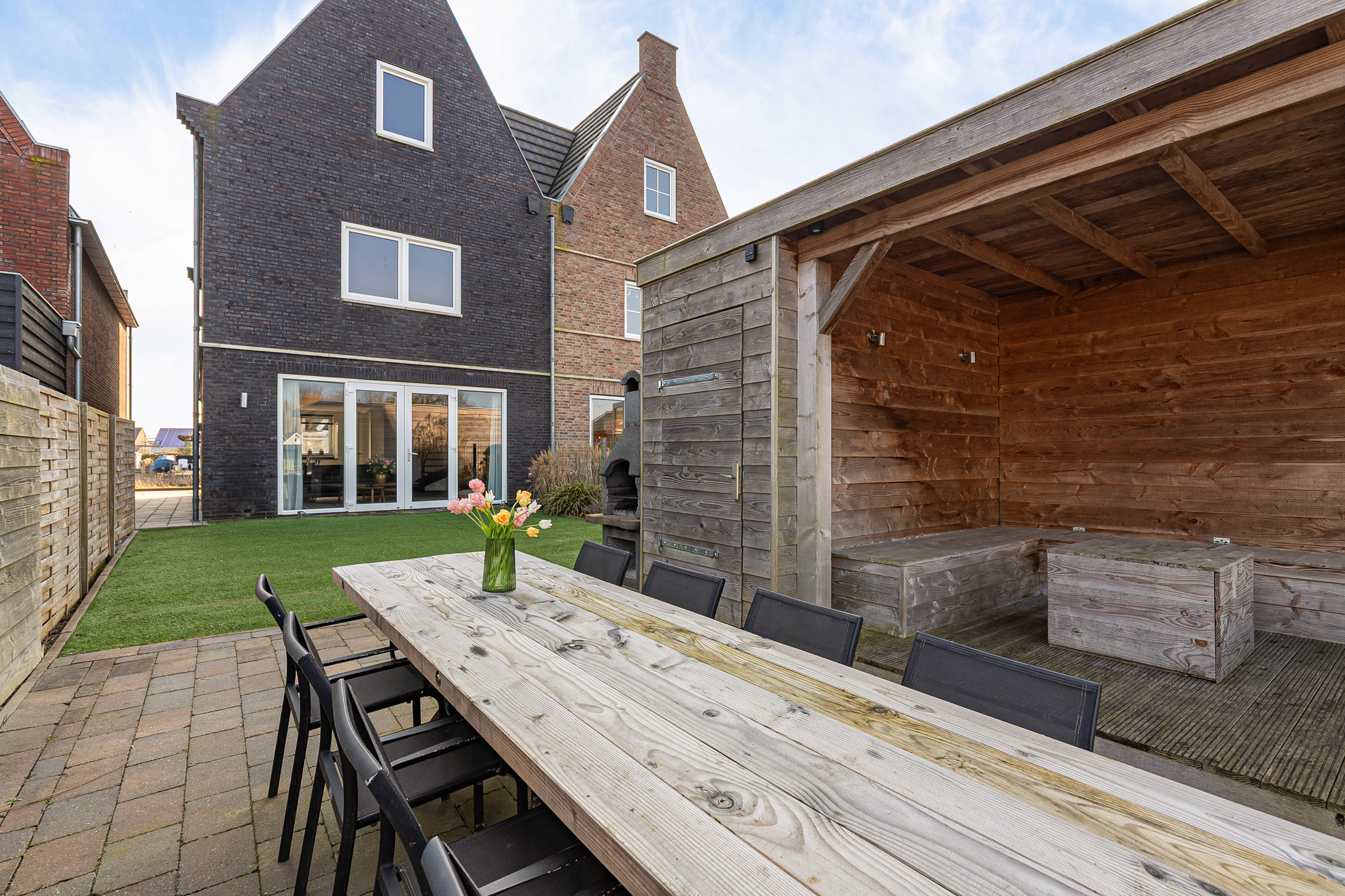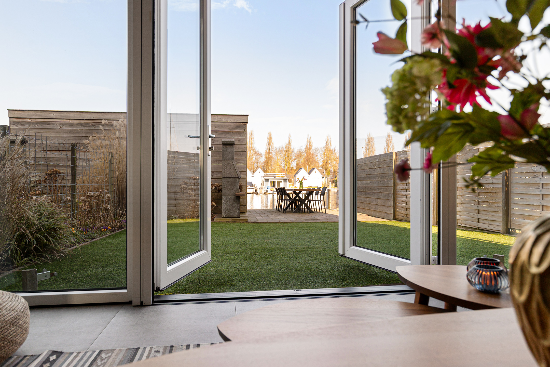 Outdoor living is centred around a northwest-facing garden with protected terrace, a wooden covered area with storage, and a shared jetty with swimming ladder—providing seamless access to Friesland’s extensive waterways and the IJsselmeer. The private mooring measures about 13 by 7 metres, ideal for a sailboat or motorboat. The property benefits from 27 solar panels, a heat pump with boiler, and full insulation for maximum efficiency.