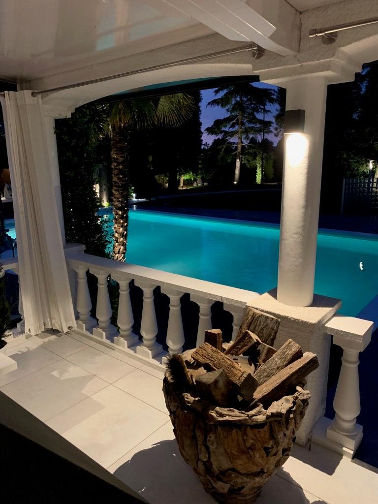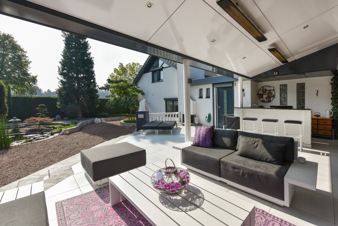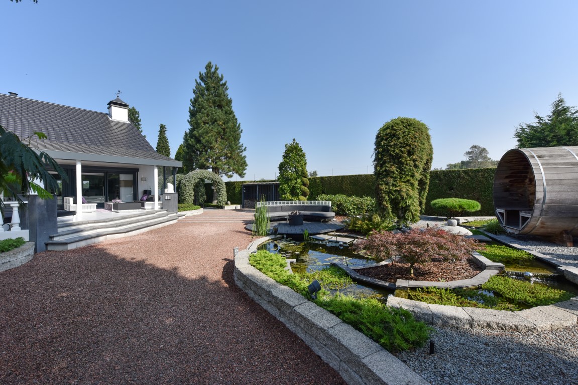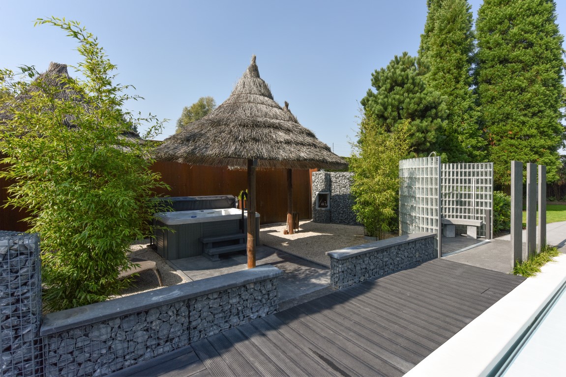 Ook buitenshuis is aan werkelijk ieder detail aandacht besteed en zijn vele luxes aanwezig. Denk hierbij aan het verwarmd zwembad, een jacuzzihoek met buitendouche en buitenhaard, de sfeervolle veranda aan de achterzijde met gastafelhaard, een 2e veranda aan de zonzijde met buitenkeuken, hoogwaardig groen rondom, grondpomp met beregeningsinstallatie (roestvrij water), keramisch straatwerk, een hout gestookte sauna, smaakvolle tuinverlichting, etc.