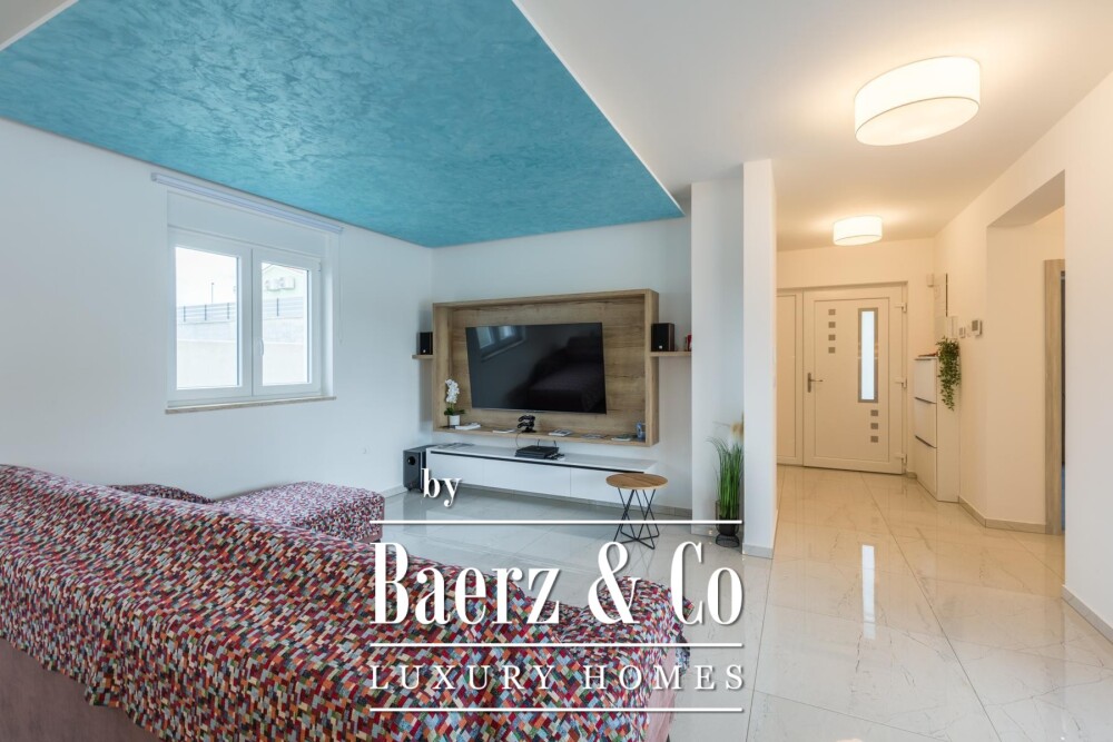 Townhouse Svetvinčenat offers the elegance of contemporary architecture in a peaceful enclave near Štokovci, surrounded by mature greenery. This property encompasses 180 m² of refined living space across a substantial 919 m² plot, presenting a seamless flow between indoors and out. The focus keyword, townhouse Svetvinčenat, is demonstrated in the property's attention to detail and tranquil positioning.