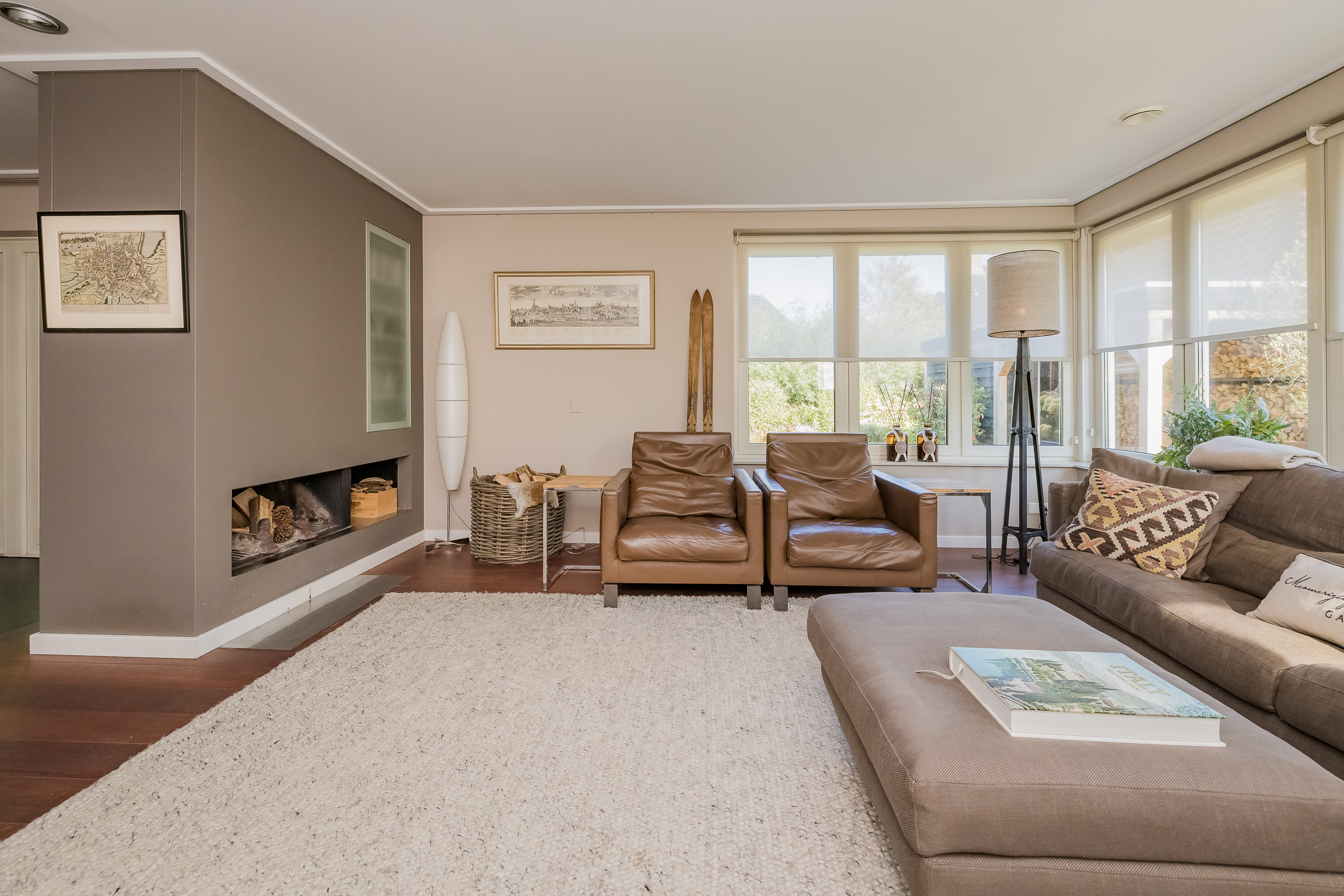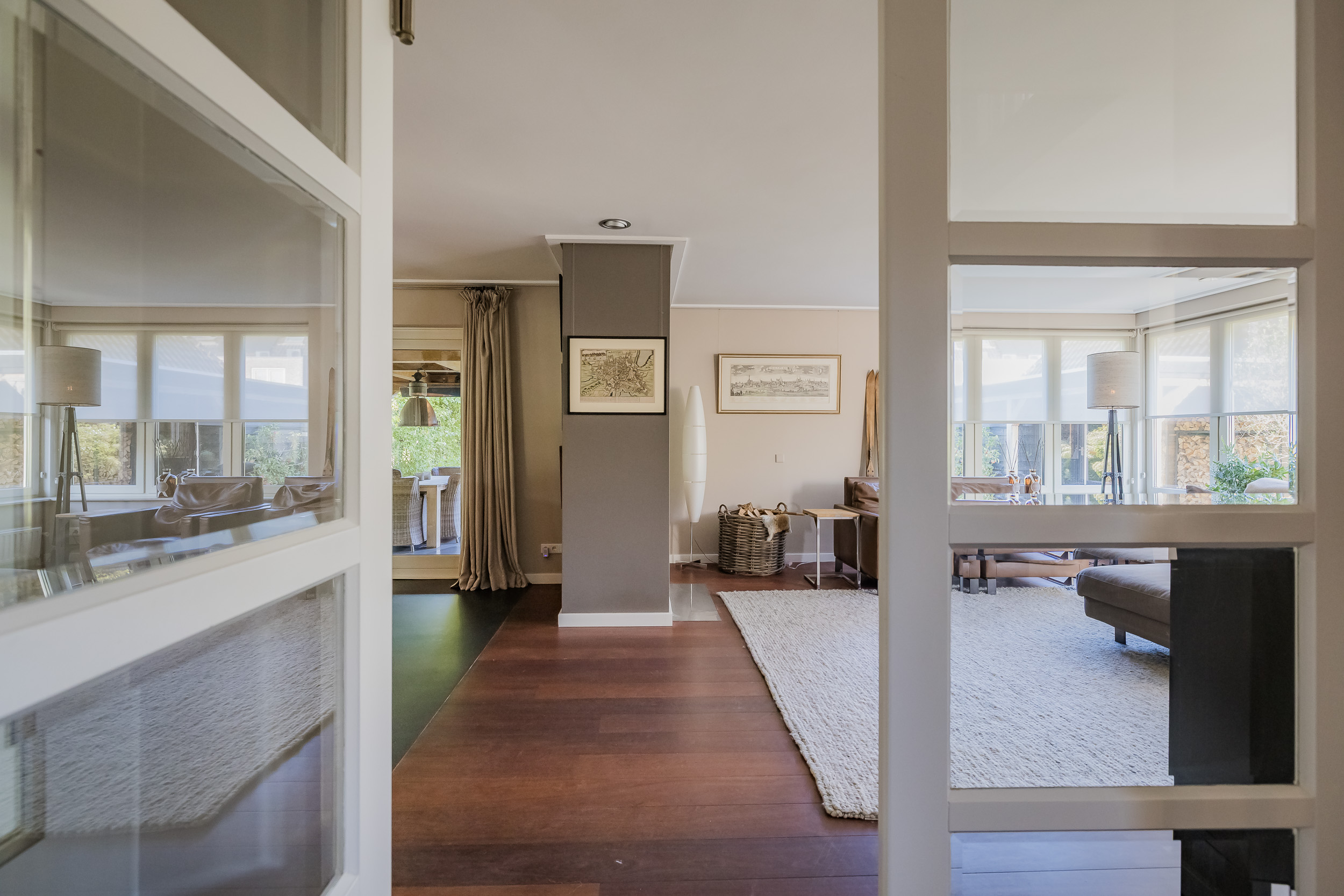 The living room is wonderfully spacious and light thanks to the large bay window and windows in a modern English country house style. At the front, you can enjoy a cozy sitting area where the dark Jatoba wood floor and fireplace create even more atmosphere. At the rear are the kitchen and dining room, which have four French doors leading to the garden and veranda.