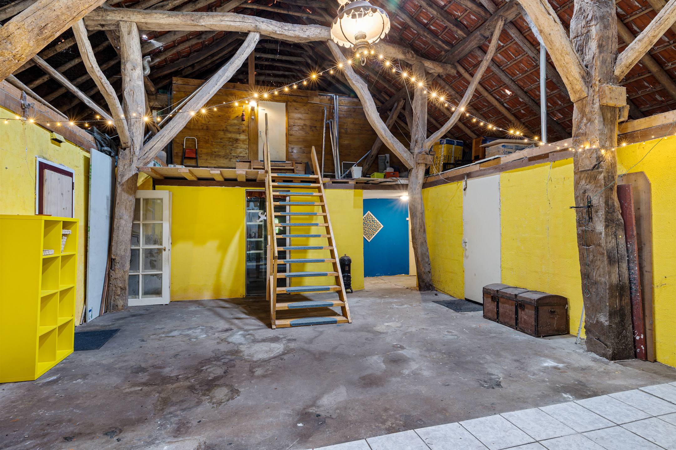 Accessible from both the front and rear houses, the barn is divided into multiple spaces, including a studio with kitchen, bedroom en suite and bathroom, four additional bedrooms and two storage rooms.