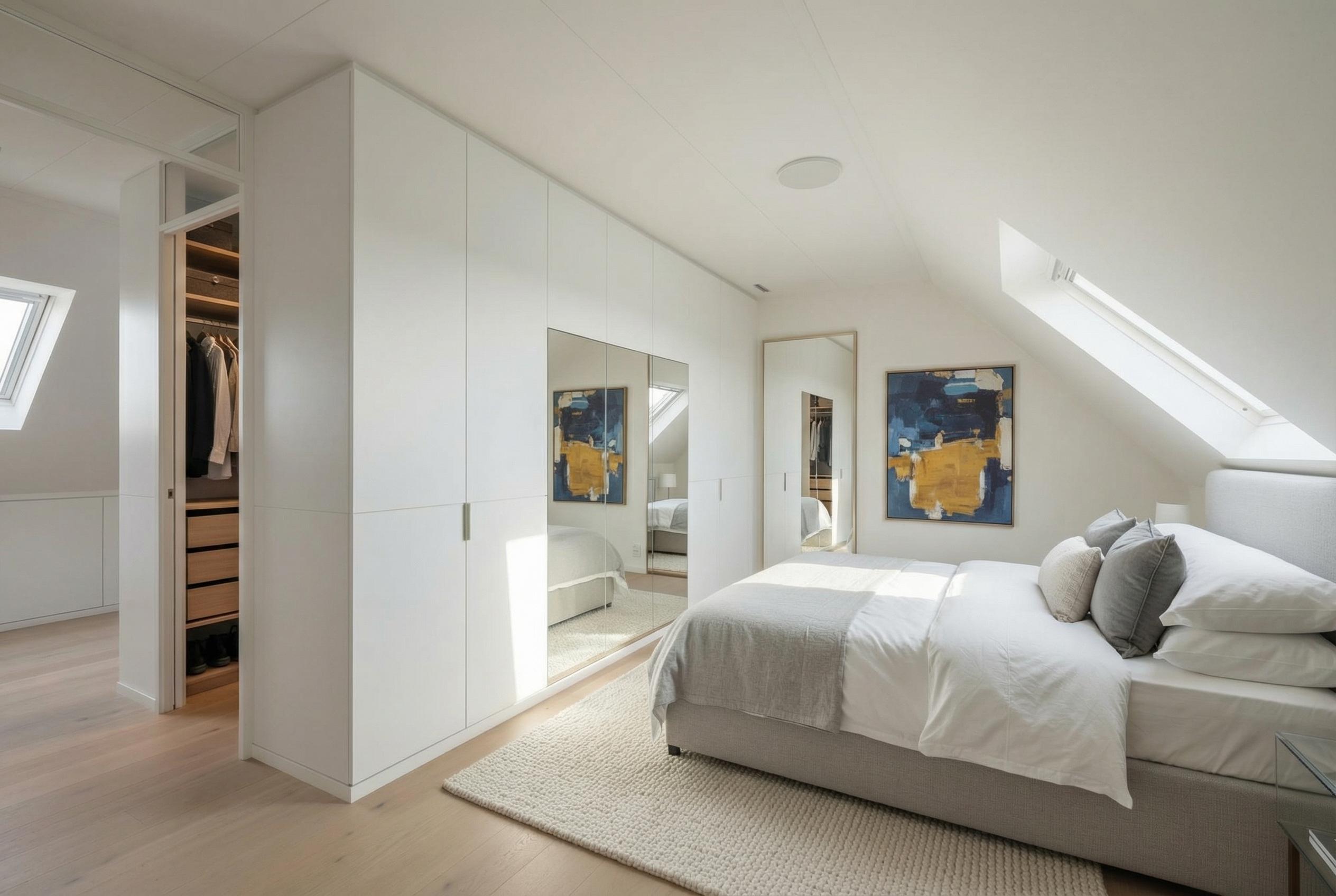 A fixed staircase leads to the insulated attic floor with standing height, roof windows and ample storage space. This level houses the installations for the heat recovery system, warm air heating and heat pump. From the landing, a separate loft storage area can also be accessed.