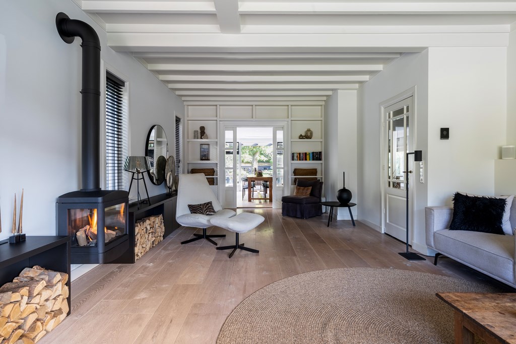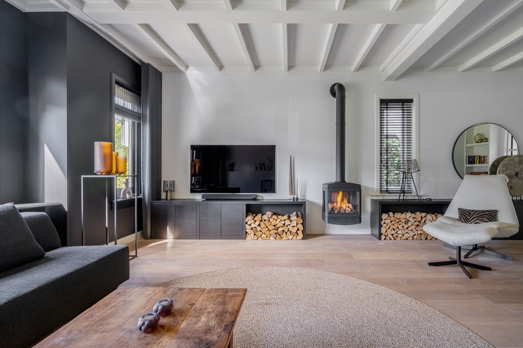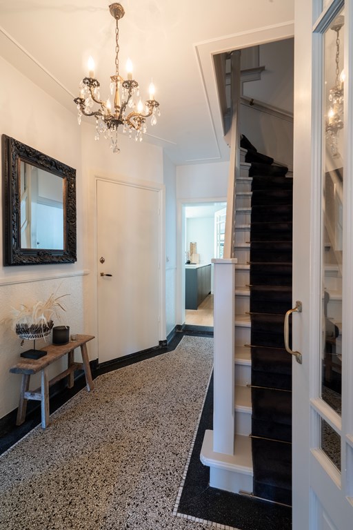 You enter the house through the entrance and hallway, both featuring authentic terrazzo floors. From here, you access the toilet, staircase, and the spacious living room. Large windows allow plenty of natural light to flow in. The stylish gas fireplace is a true eye-catcher and adds a luxurious, cozy atmosphere.