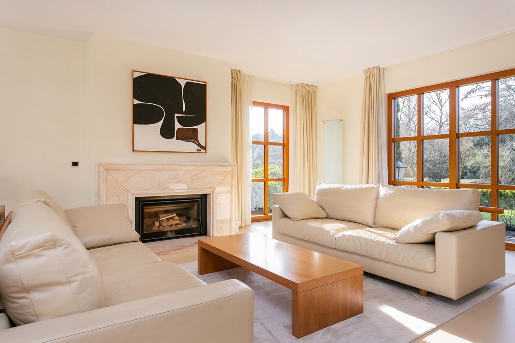 - Living Room: Bright, generous space with symmetrical, full-height windows on three sides, a closed wood-burning fireplace, double doors, and a sliding door to the rear garden.