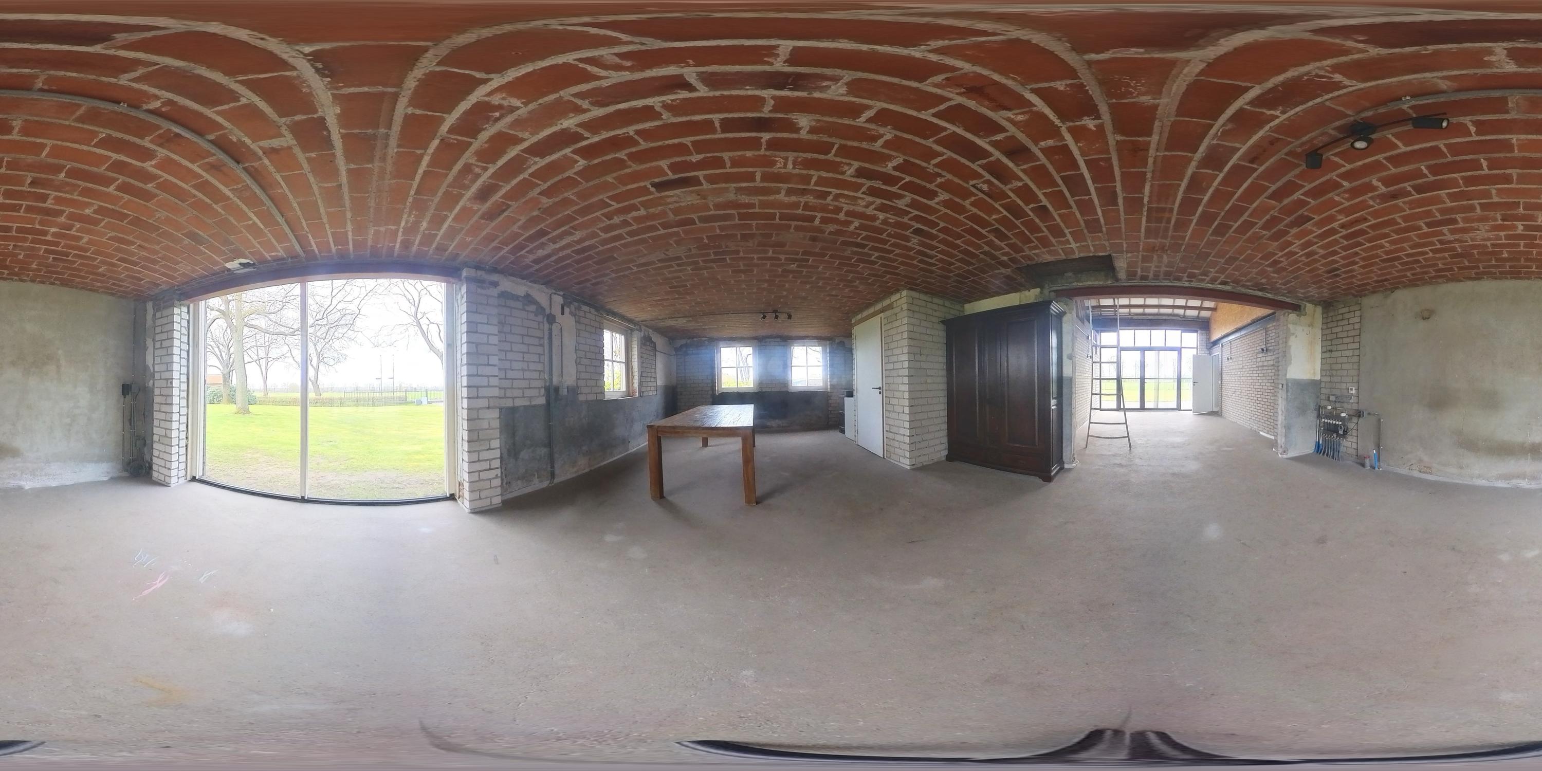 Adjacent to this is the indoor rear annex which, alongside the indoor garage, offers a considerable amount of additional usable space. This forms a solid foundation and was designed with versatility in mind. The rear annex is therefore ideally suited to a variety of uses, such as independent living accommodation (informal care), an office or practice space with meeting facilities, or a comfortable guest house. The space features a refurbished concrete floor with underfloor heating, brick walls and exposed wooden beams that enhance the rustic atmosphere. Part of the space has a mezzanine, and there is plenty of natural light. French doors in the rear façade provide a direct connection to the garden. There is also a separate toilet with a wall-hung toilet and washbasin. The rear annex also provides access to the built-in garage. The garage is accessible from the courtyard via a wide entrance door.
