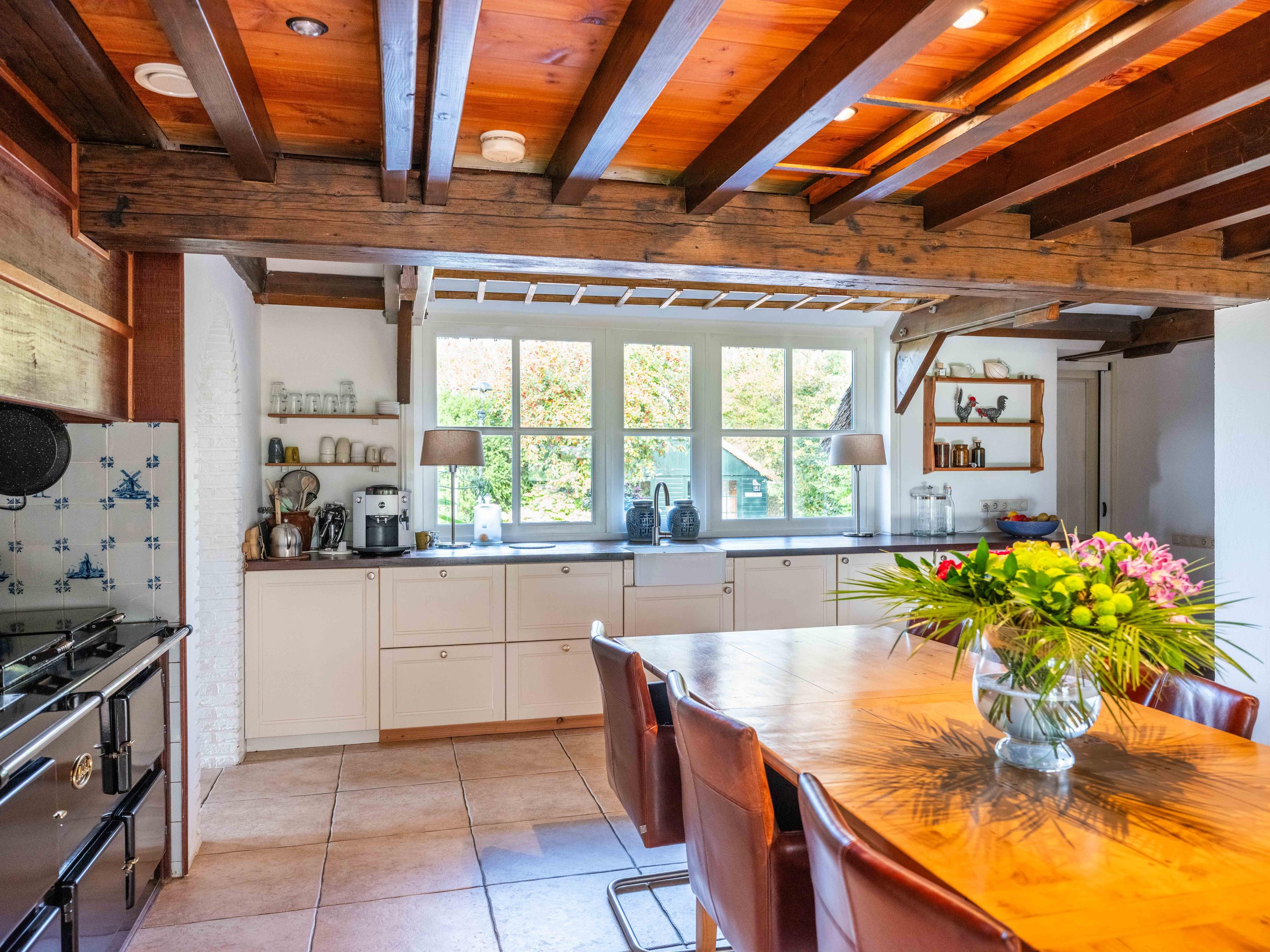 The country-style kitchen is fitted with built-in cabinets and ample storage space. From here, you can also access the spacious cellar, ideal for storage or as a wine cellar. The generous kitchen forms the heart of the home, featuring authentic details such as an English cooker with four ovens and characteristic beamed ceilings. The kitchen flows seamlessly into the inviting living room, where abundant natural light and views over the water immediately draw your attention. This room feels spacious and welcoming, enhanced by the centrally positioned wood-burning stove that adds a warm, homely touch.