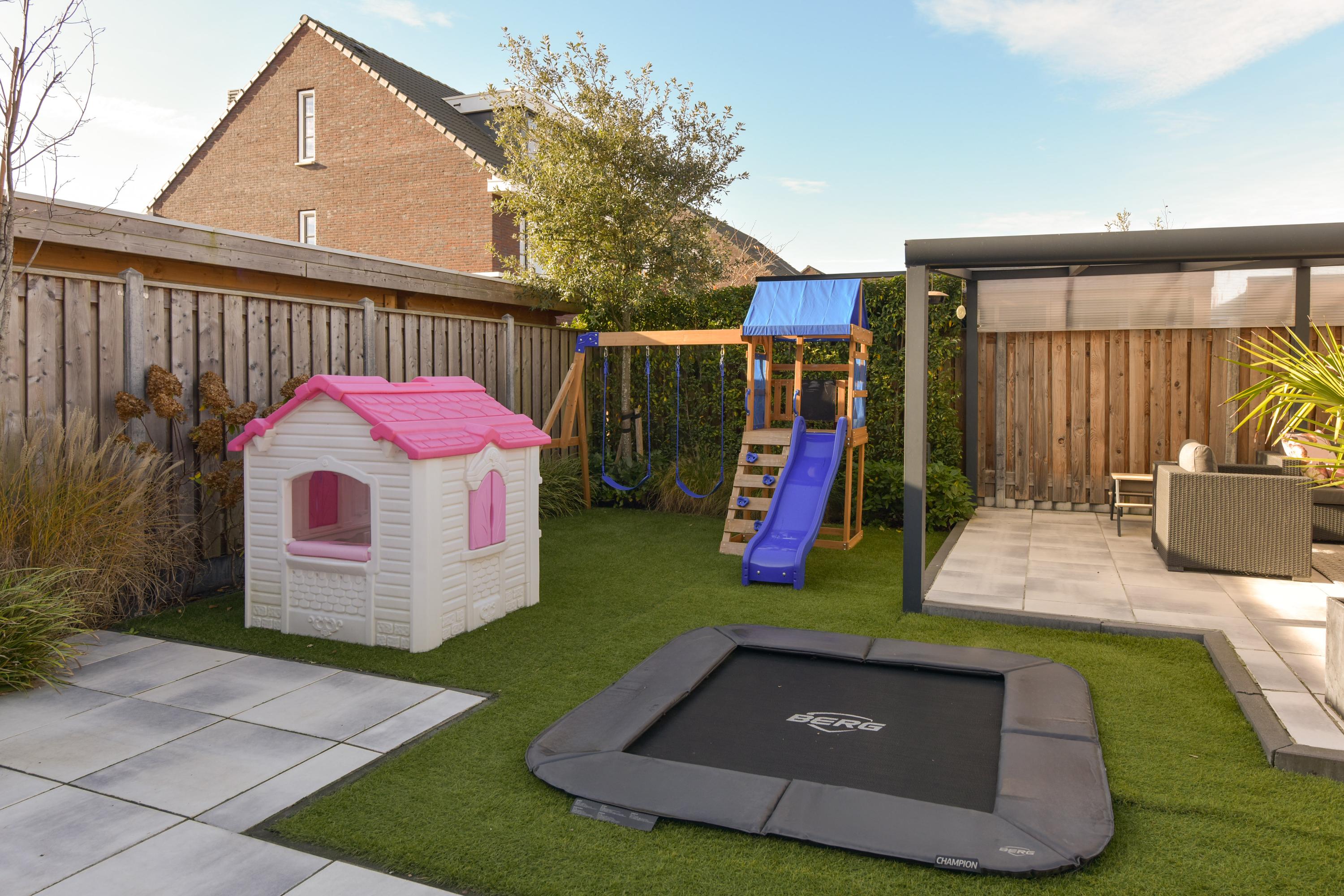 The west-facing backyard extends the living area outdoors, reflecting the same refined style as the interior. Enjoy the sun from afternoon to evening. The garden is thoughtfully designed with multiple terraces, a lawn with a built-in trampoline, and a charming veranda with lighting, a perfect spot for long summer nights. Every detail has been considered: bins are neatly hidden, there is a side gate for rear access, and both front and back gardens have automatic irrigation. At the front of the property, an additional storage room provides space for bicycles, garden tools, or equipment.