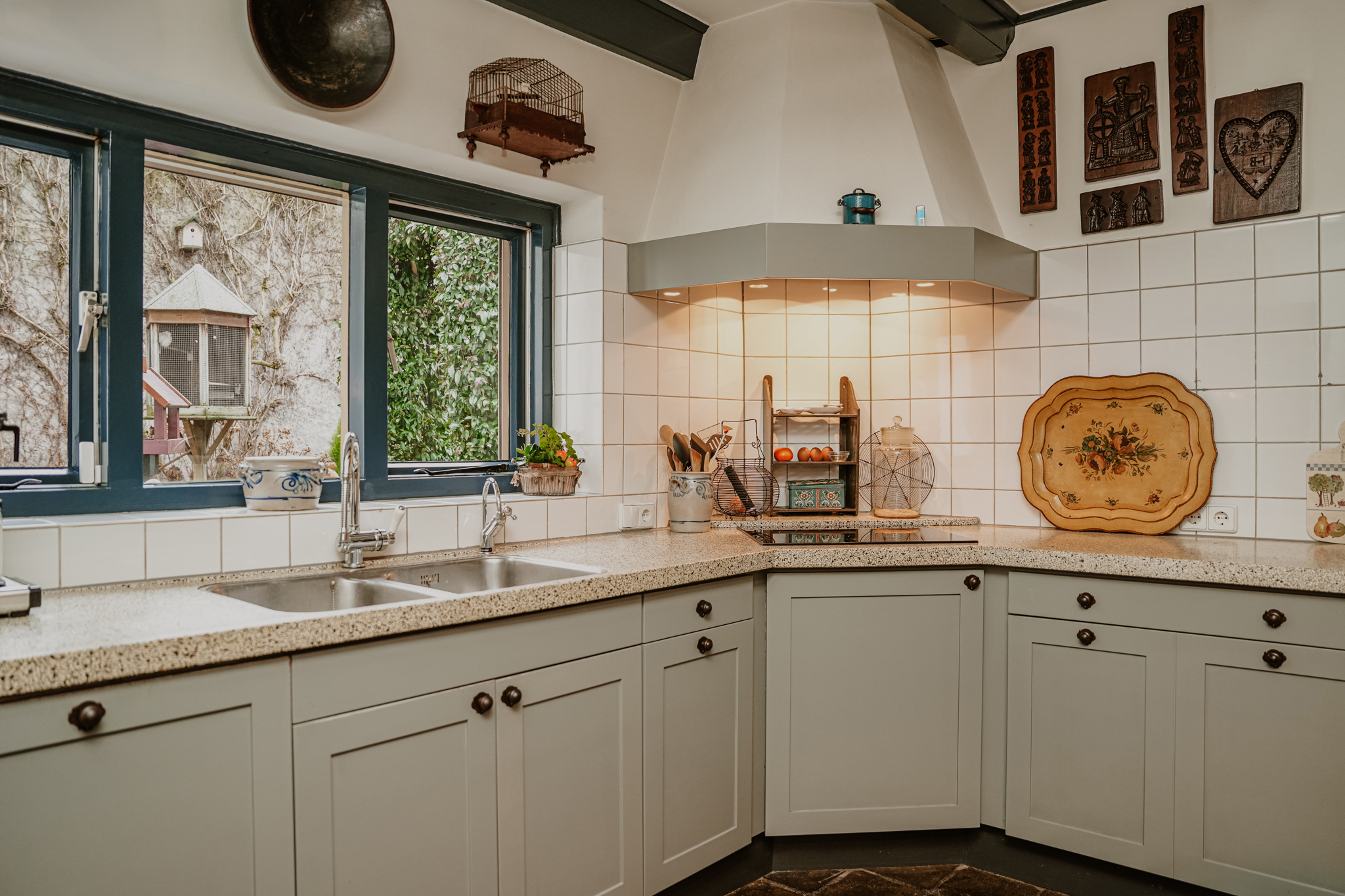 Adjoining the hallway are the cellar, utility room, and dining kitchen. A glass panel in the cellar floor reveals the historic water well below. The utility room occupies the former outdoor space of what was once the western house when the property consisted of two separate homes. The hallway retains the original 18th-century pump with a stone basin and brass taps. The dining kitchen is furnished with a classic kitchen unit featuring built-in appliances and a terrazzo countertop. From the kitchen, there is a pleasant view of the garden.