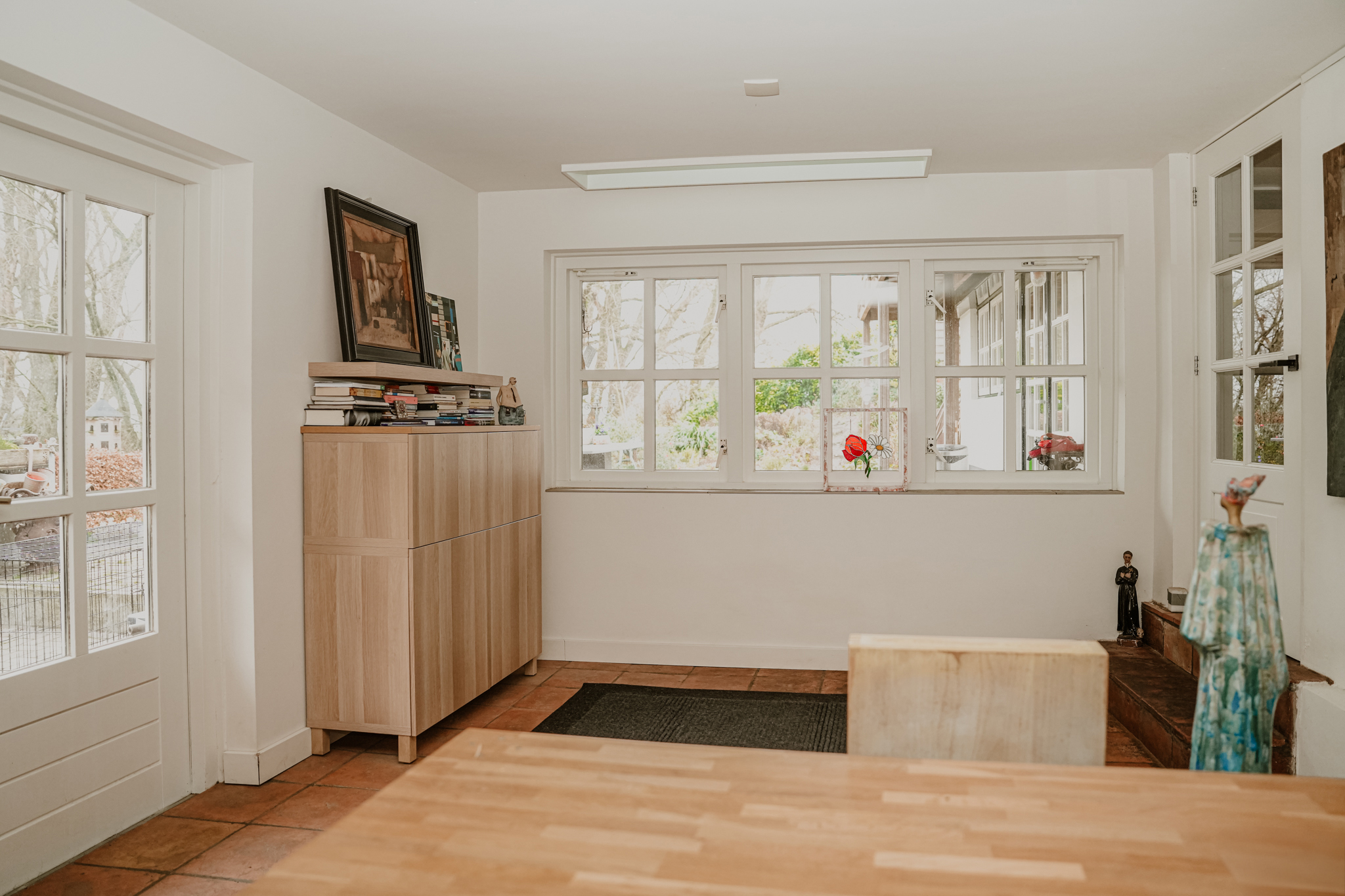 The garden room is located in the extension of the property and has French doors with six-pane division opening to a second terrace. The current owner uses this room as an office, but it could also serve as a cozy TV or playroom. The floor is largely laid with antique red abbey tiles and features underfloor heating.
