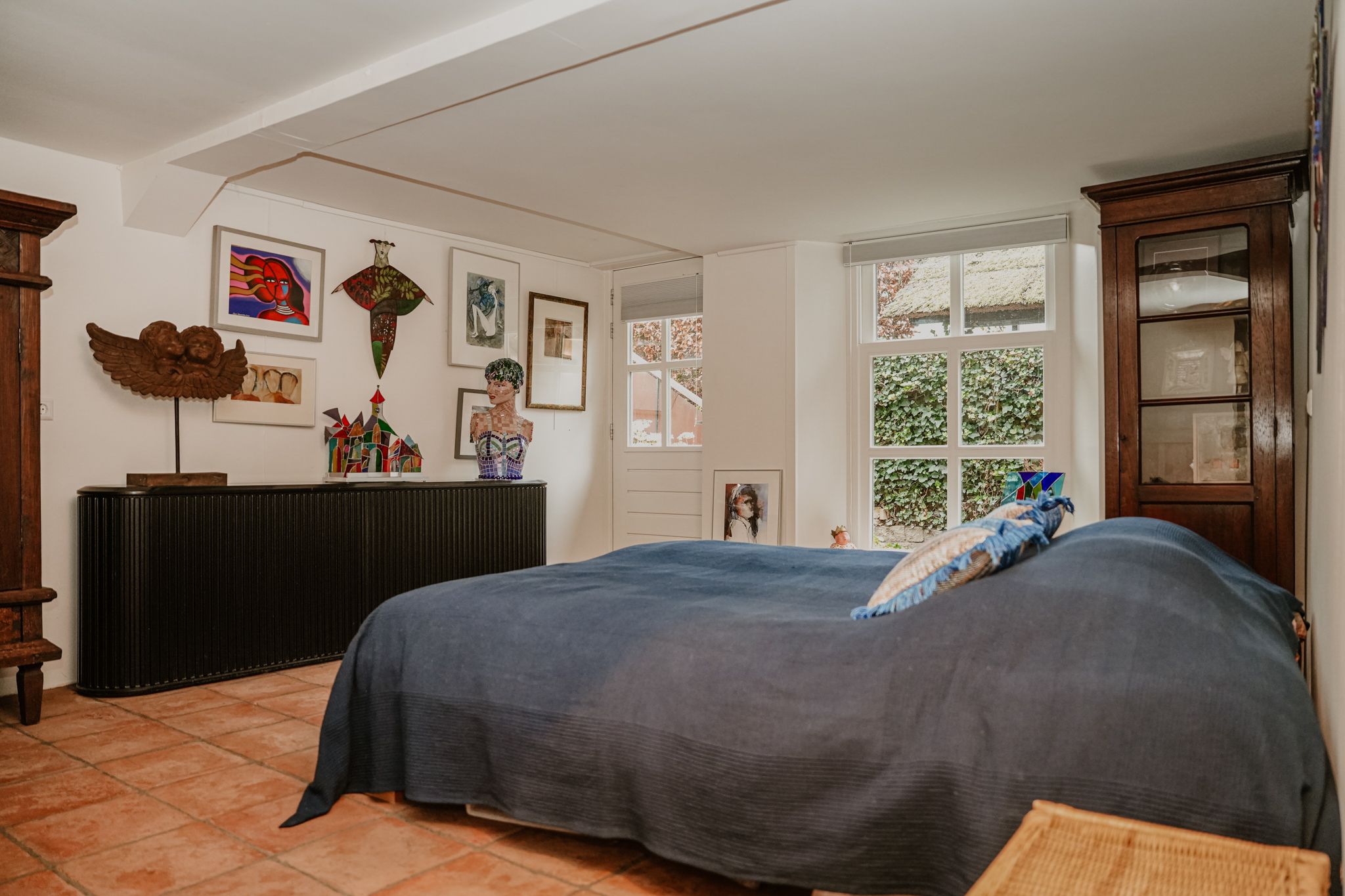 The bedroom, accessible via a second dike staircase on the west side of the house, is ideal as a practice space or guest room due to its private entrance.