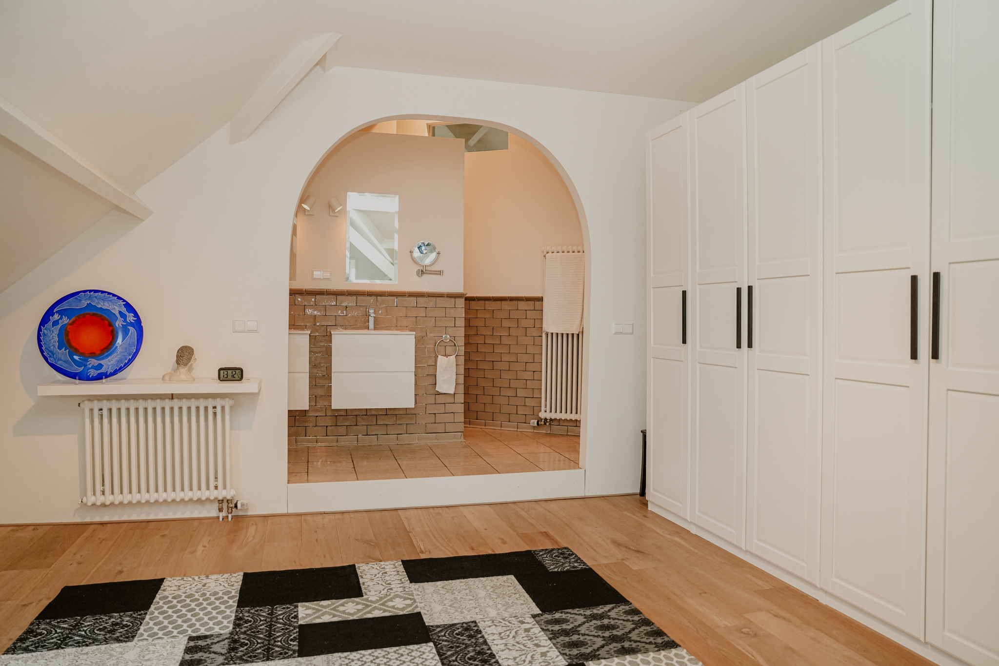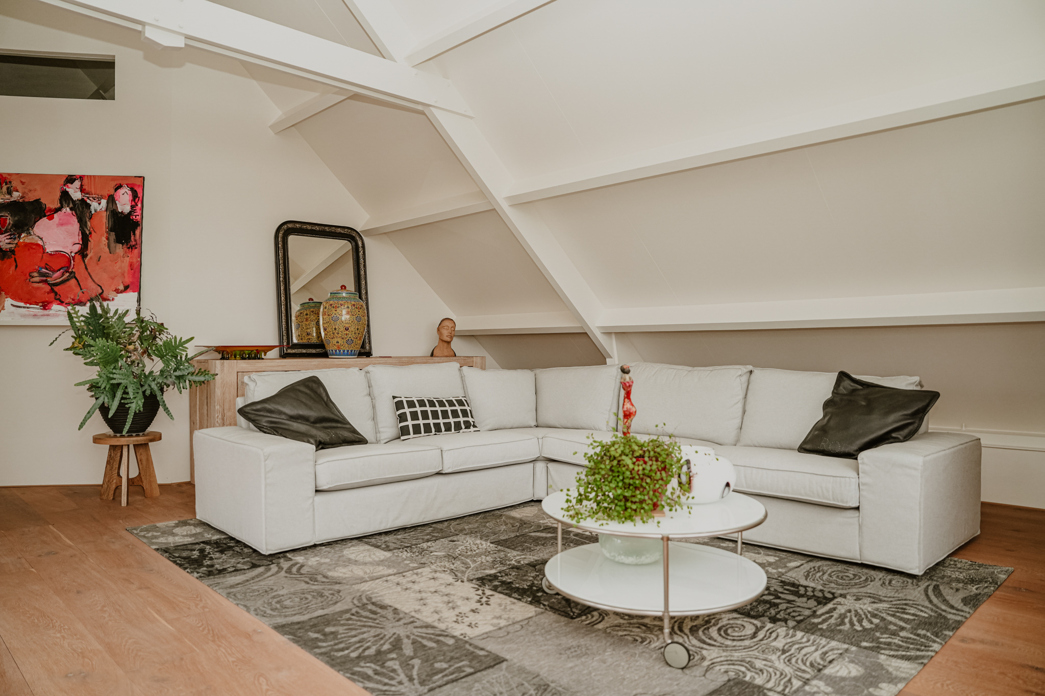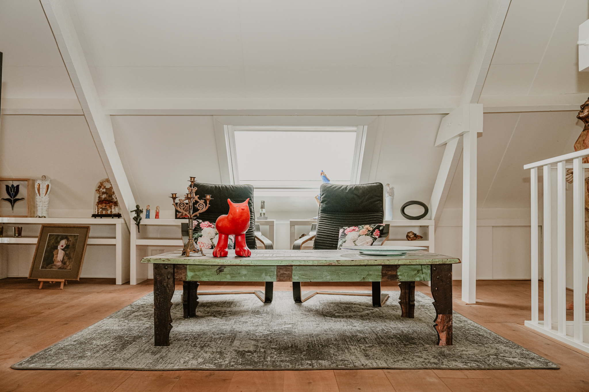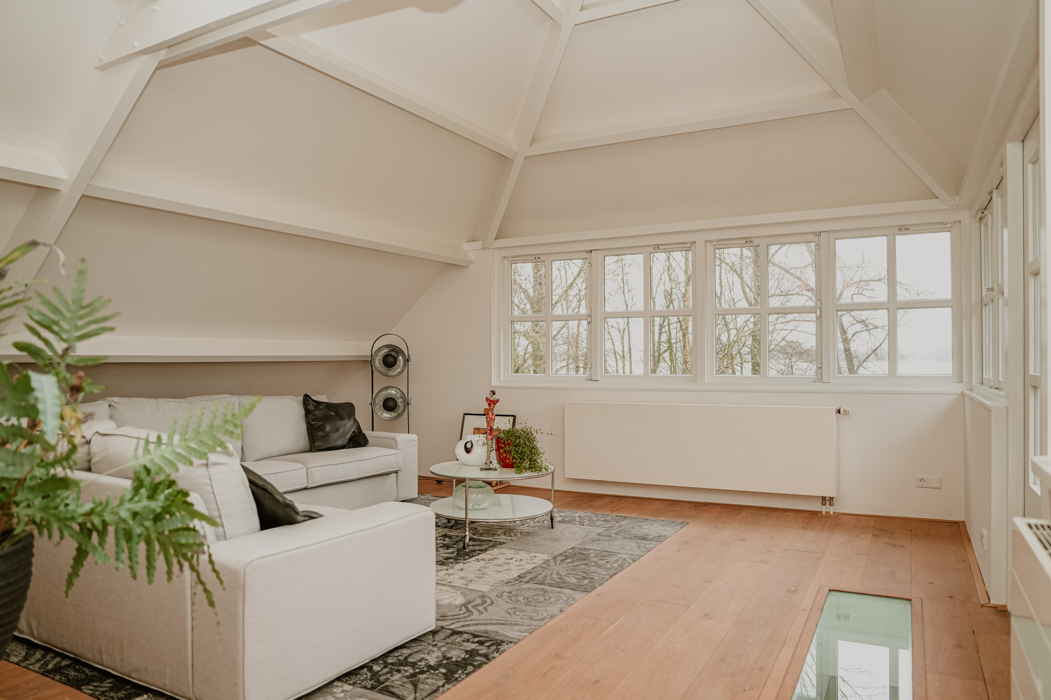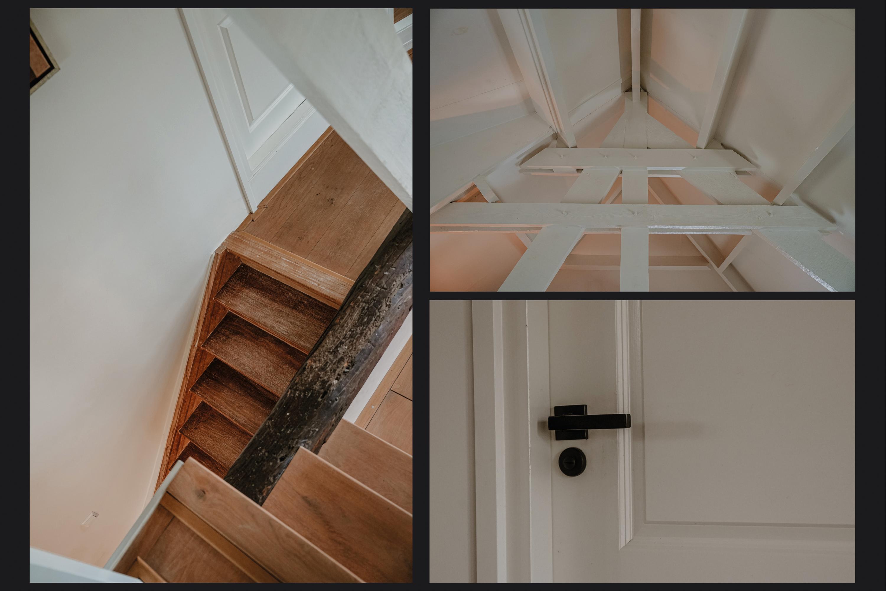 Upon reaching the first floor, you are greeted by a surprising amount of space, light, and breathtaking views. The area in the original dike house is designed as a work/lounge space, with the exposed beams remaining visible. French doors with six-pane division open onto the river-facing roof terrace. At the rear, in the 2003 extension, there is a second living space with additional French doors and numerous windows, offering stunning views of the River Waal. This inspiring space is perfect as an atelier or additional bedroom.