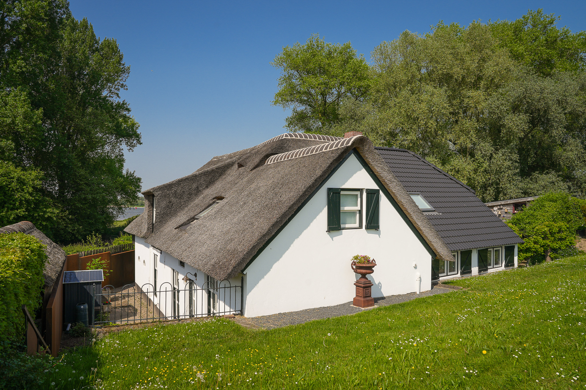 This property is known locally as “The Old Smithy,” as it was the village blacksmith’s house until 1964. From the dike, the house resembles a classic dike house commonly found along the River Waal. However, the rear boasts the appearance of a luxury villa, thanks to the clapboard extension, thatched roof, and French doors.