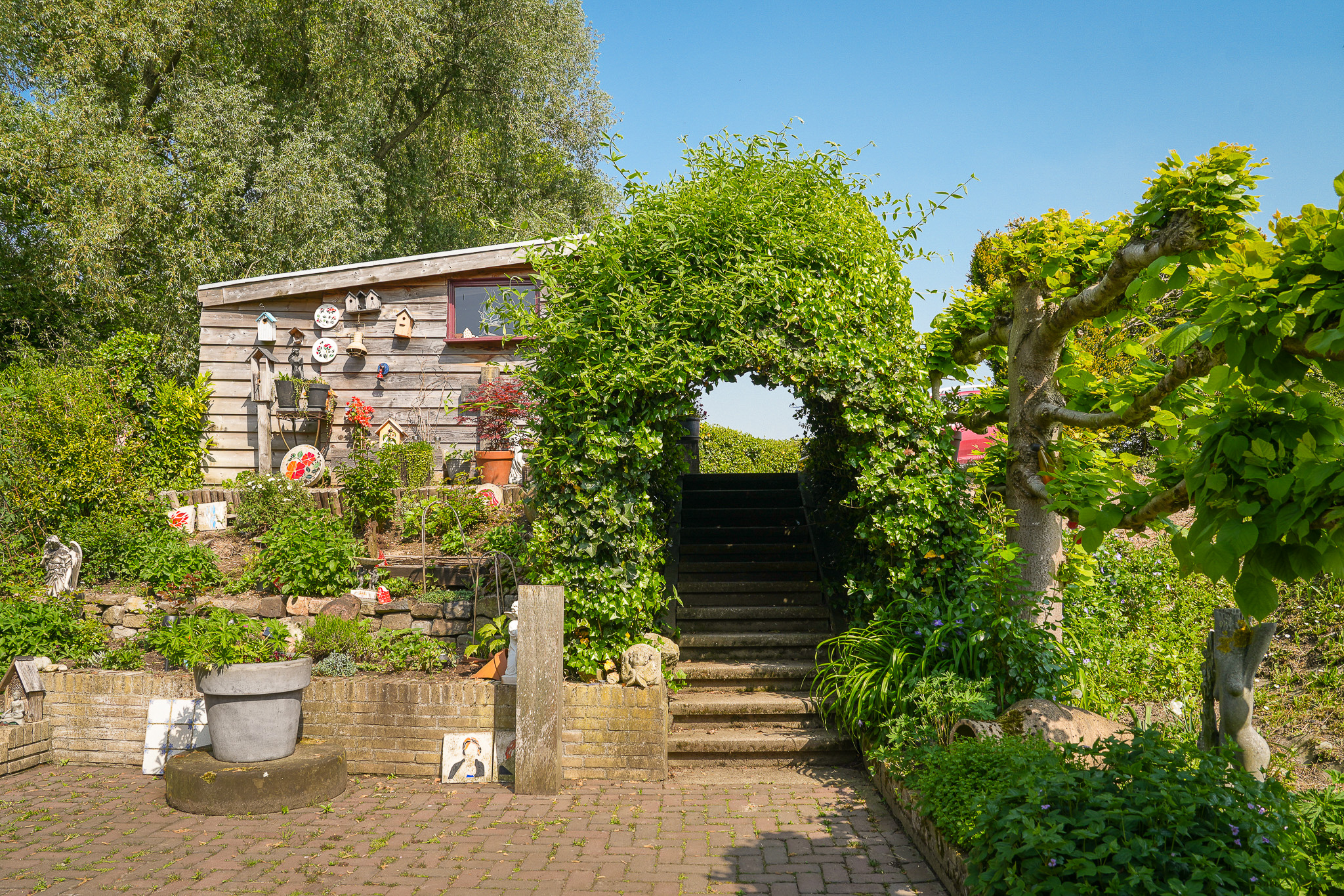 The garden, with various terraces, a wood storage area, lovely beech hedges, and an old high-stem fruit tree, is planted to withstand potential river flooding in winter. The solid retaining wall installed by the owners ensures safety while living near the water.