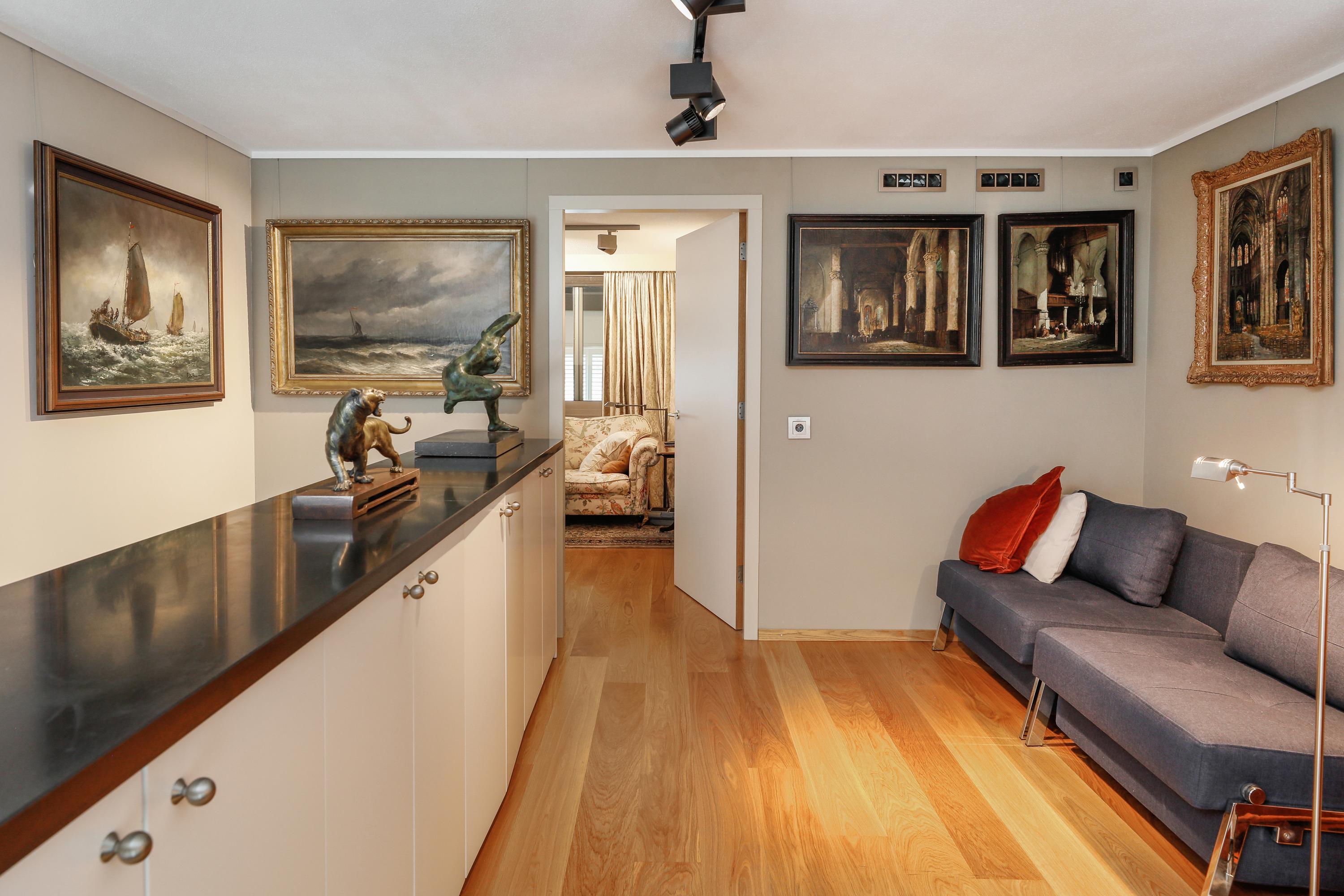 Aan de straatzijde vindt u de bibliotheek. Ook hier weer een prachtig hoog plafond. Op een wat bewolkte dag is het hier licht, maar als de zon gaat schijnen weet u niet wat u mee-maakt, maar kan overvloedig licht getemperd worden met houten Jasno jaloezieën. Er is een mooie klassieke schouw met bio-ethanol haard, aangesloten op centrale afzuiging via een regelklep. Met wat aanpassingen is van deze bibliotheekruimte ook een geweldige slaapkamer te maken. Gelijkvloers met de leefruimte. Maar de woning biedt voor iedere leeftijd en mobiliteit, voldoende mogelijk-heden om er lang te kunnen blijven wonen.