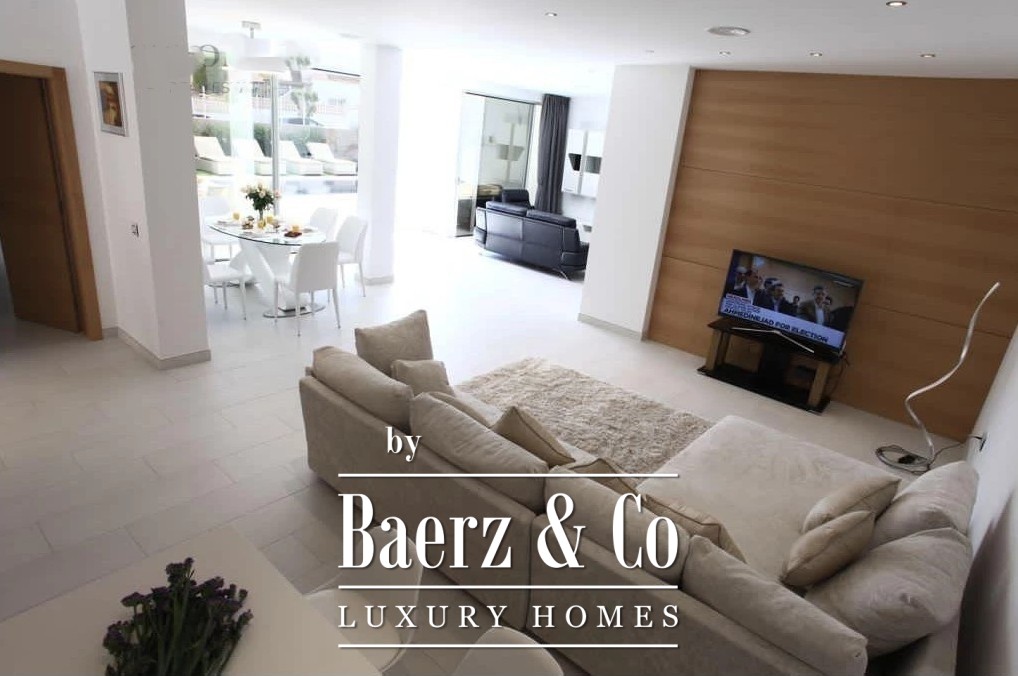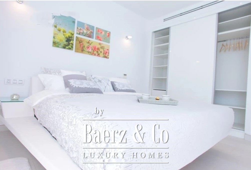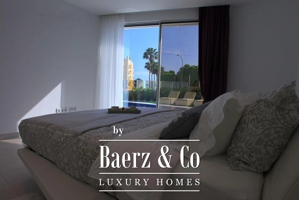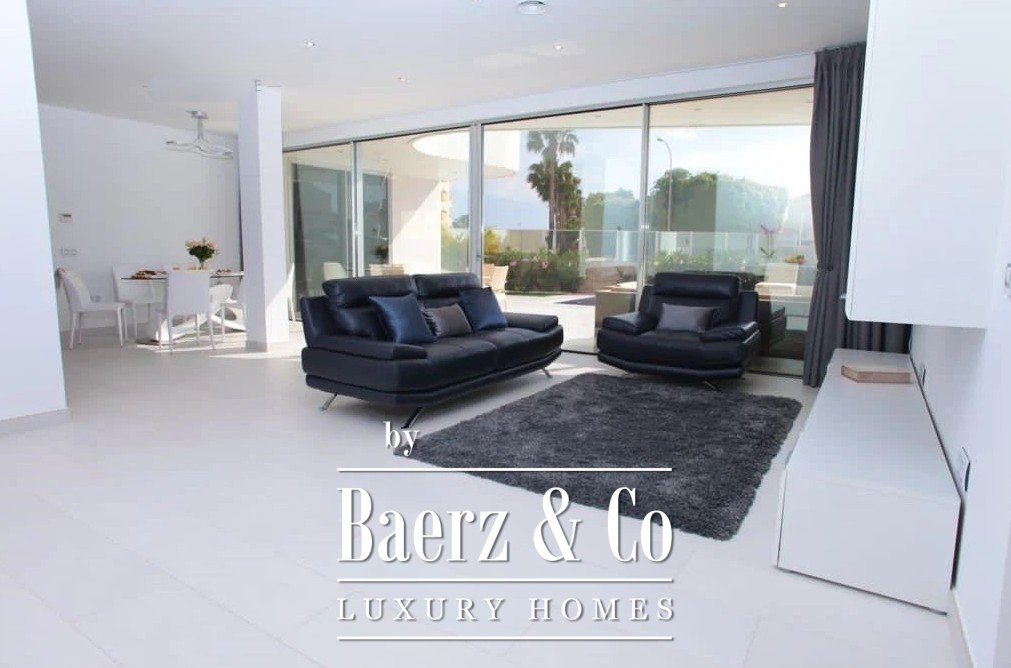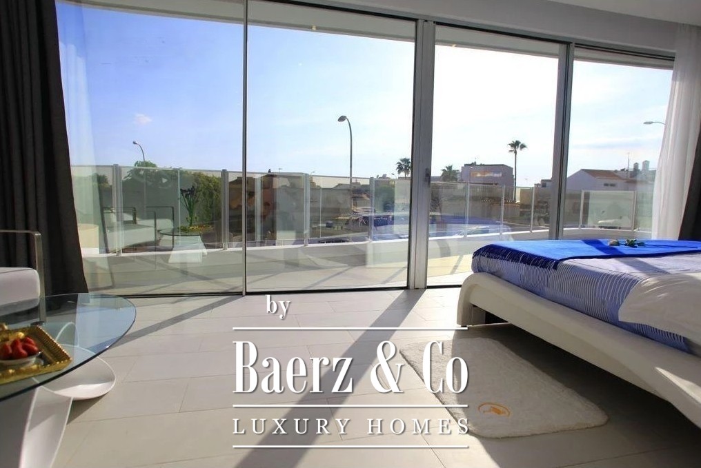 De begane grond beschikt over een ruime open woon- en eetkamer, een strakke, volledig uitgeruste keuken en twee elegante slaapkamers met en-suite badkamers. Grote glazen deuren openen naar zonnige terrassen die leiden naar een verwarmd zwembad van 8 x 3 m, waardoor de perfecte binnen-buitenflow ontstaat om het hele jaar door te genieten.