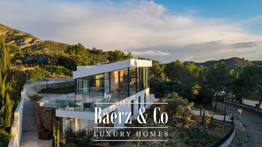 Moderne villa Alcúdia belichaamt ingetogen luxe in Paraiso de Bonaire, voltooid in 2024 en gelegen op een perceel van 1.153 m². De woning beschikt over 312 m² verfijnde leefruimte, verdeeld over drie verdiepingen met kamerhoge ramen die een panoramisch uitzicht op de baai en de bergen omlijsten.