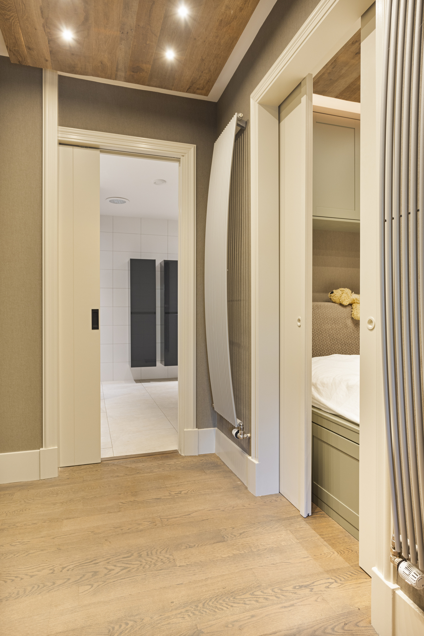 De living heeft een schitterende vloer; het is een oude kasteelvloer uit het Franse chateau van de vorige eigenaars. De huidige bewoners hebben hem mooi laten opschuren en gecoat met een verfijnde grijze vloerolie, waardoor ze naadloos in het eigentijdse interieur passen. De muziekkamer is een ruimte en-suite, gescheiden van de living middels schuifdeuren, en heeft nu de rol van een ouderwets kunstkabinet, maar dan wél eentje waarvan het binnenklimaat geheel naar wens aan te passen is. Heeft u nu geen Steinway of kunstcollectie om hier tentoon te stellen, dan is dit een heerlijke werkkamer, bibliotheek, bioscoop of eetkamer. Aansluitend links, met zicht op de tuin en het zijterras, de opkamer, die de gashaard deelt met de living. Een heerlijk hoekje om weg te kruipen met een goed boek.