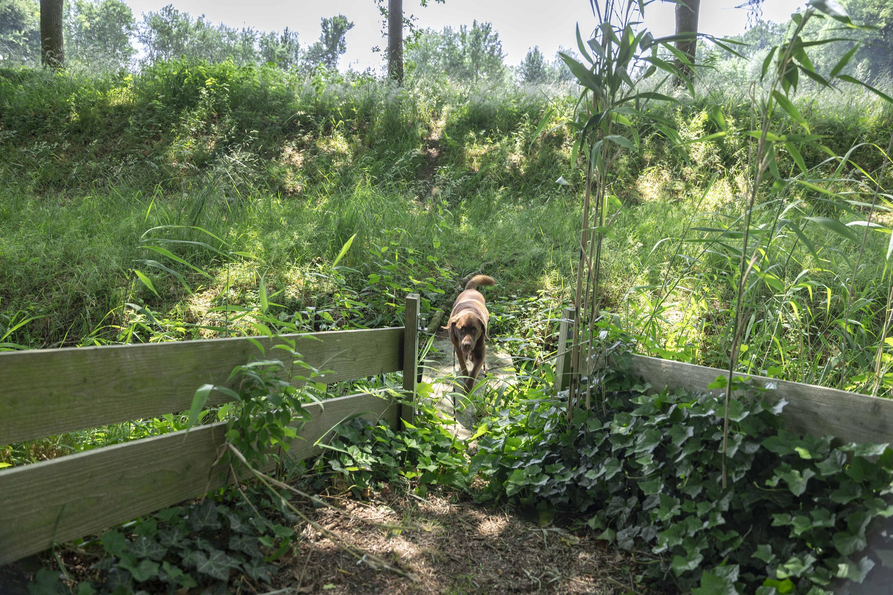Het weiland tussen het Twentekanaal en de tuin is aangeplant met jonge fruitbomen.