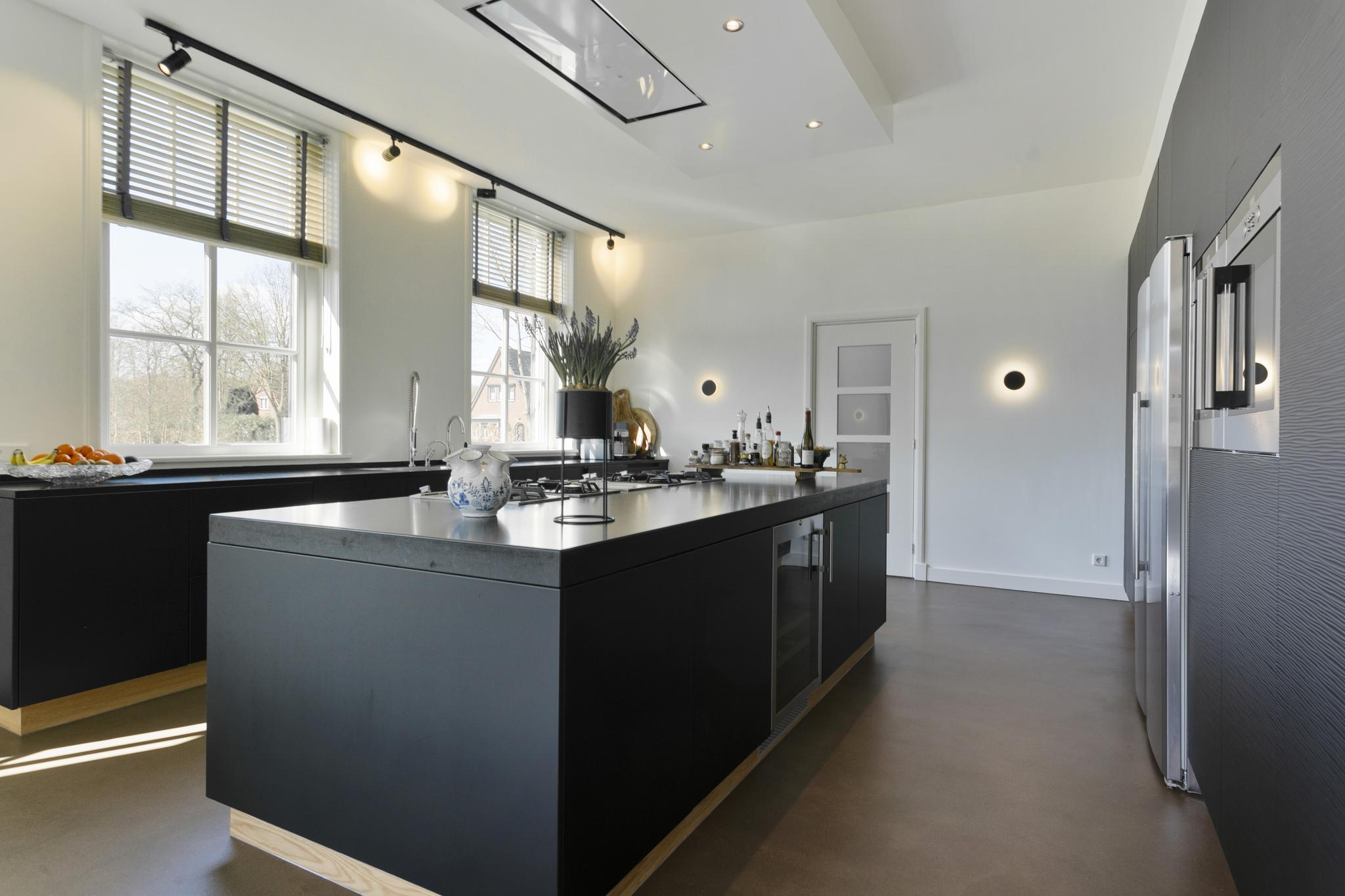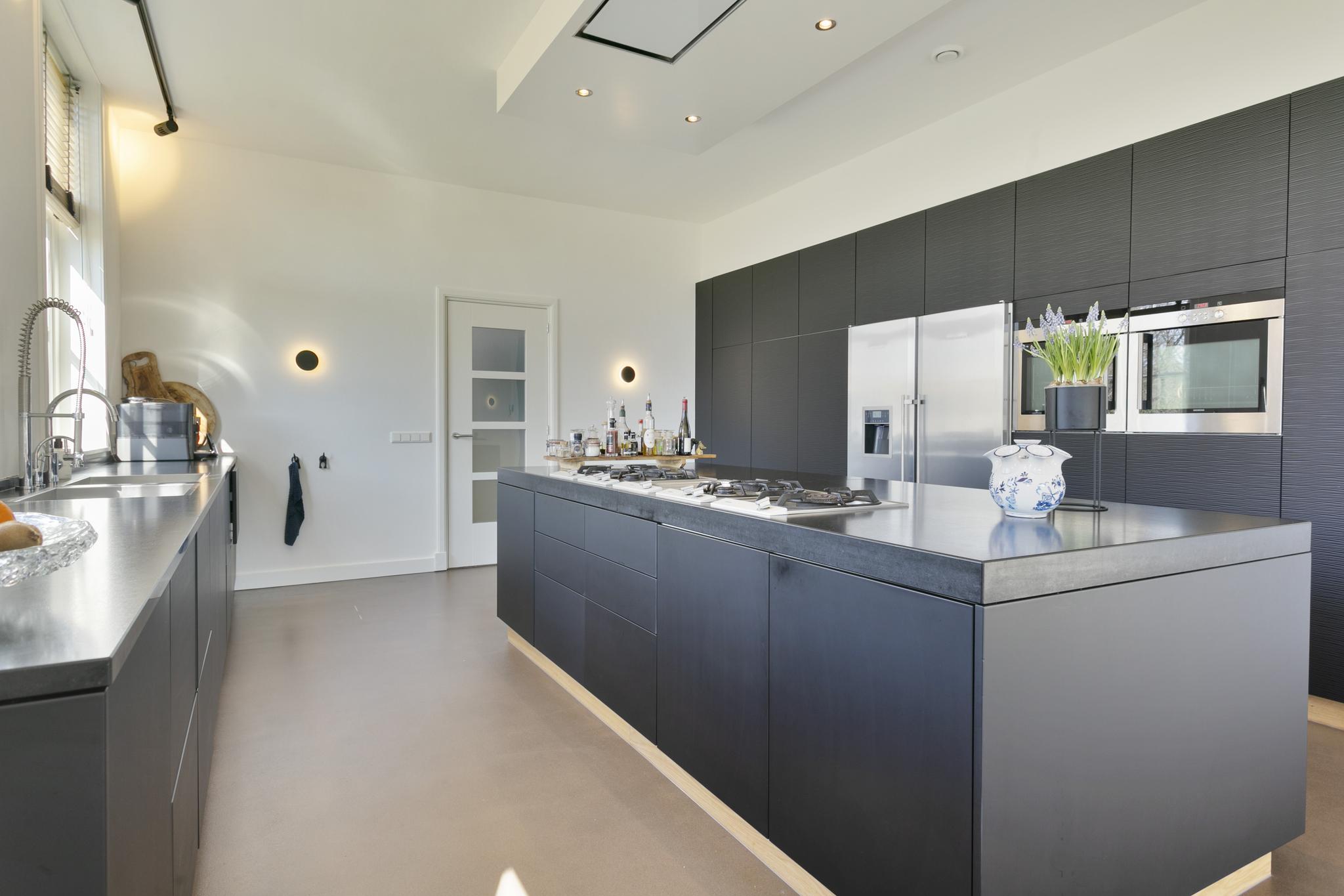 Aan de rechterkant meteen de heerlijke woonkeuken, een parel en meteen het warmlopende hart van dit huis; modern en strak, met antracietkleurige fronten, dito composiet werkbladen en qua inbouwapparatuur echt álles was een keukenprins of -prinses zich maar kan wensen: op het fornuis, op het kookeiland, bevinden zich vier gaspitten, twee wokbranders en een plancha (Gaggenau). Er zijn twee heteluchtovens (Siemens), een grote koelvriescombinatie in RVS (Samsung) en een afwasmachine (Miele). Het aanrecht biedt veel werkruimte, twee spoelbakken en een kokendwaterkraan (Quooker). Aan de achterzijde een heerlijke eethoek die royaal de ruimte biedt voor een grote eettafel. De beglaasde deuren openen naar de tuin.