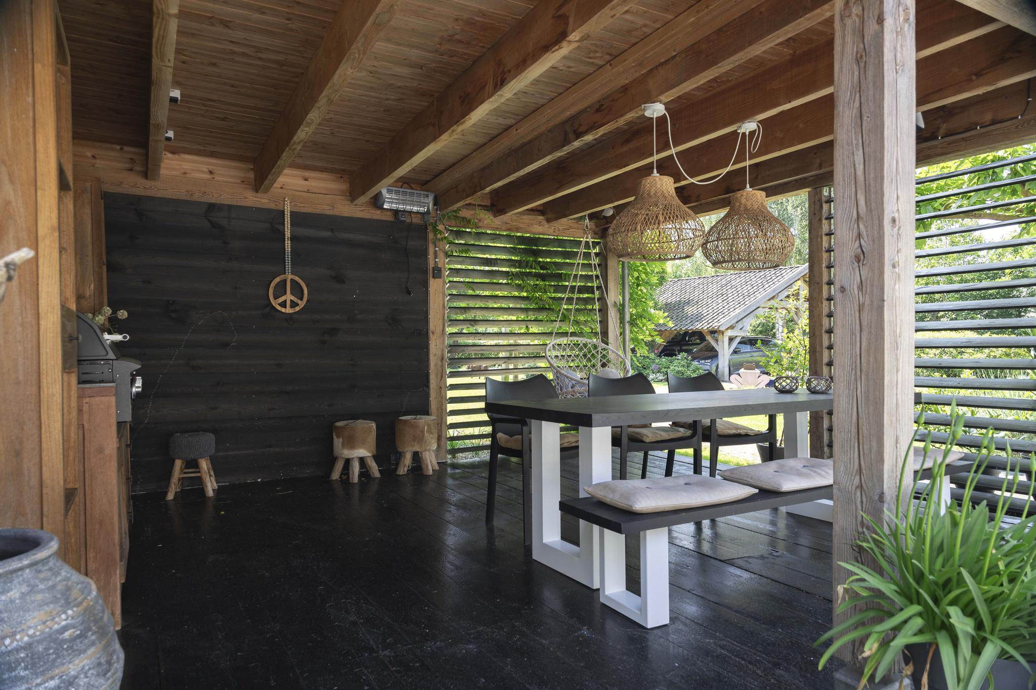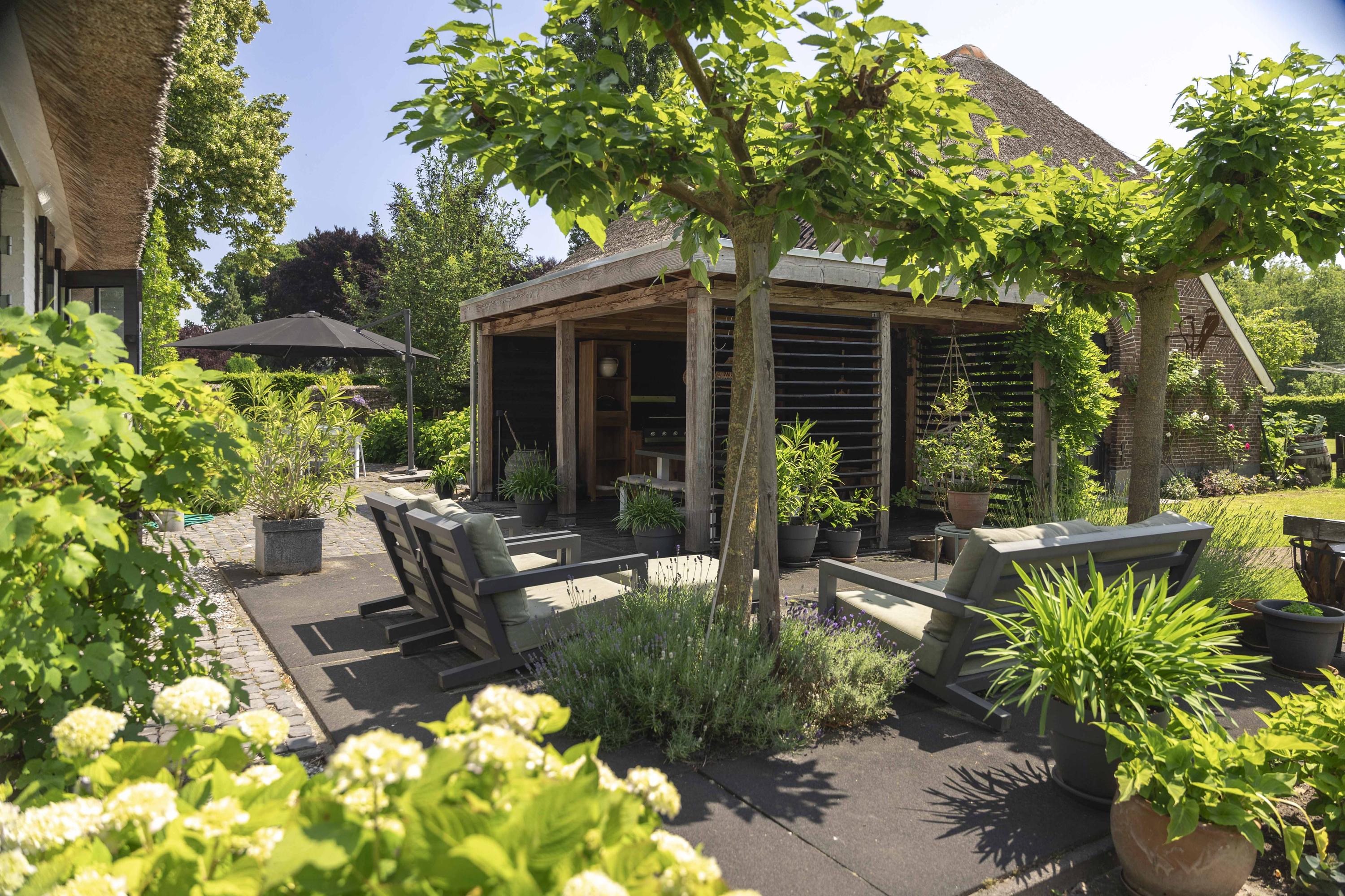 De bezonning is ideaal; de achtertuin ligt perfect op het zuiden gericht. Achter het huis, toegankelijk vanuit de woonkamer, keuken en bijkeuken, het heerlijke zonneterras. Onder de overkapping is een loungehoek ingericht met een leemkachel.