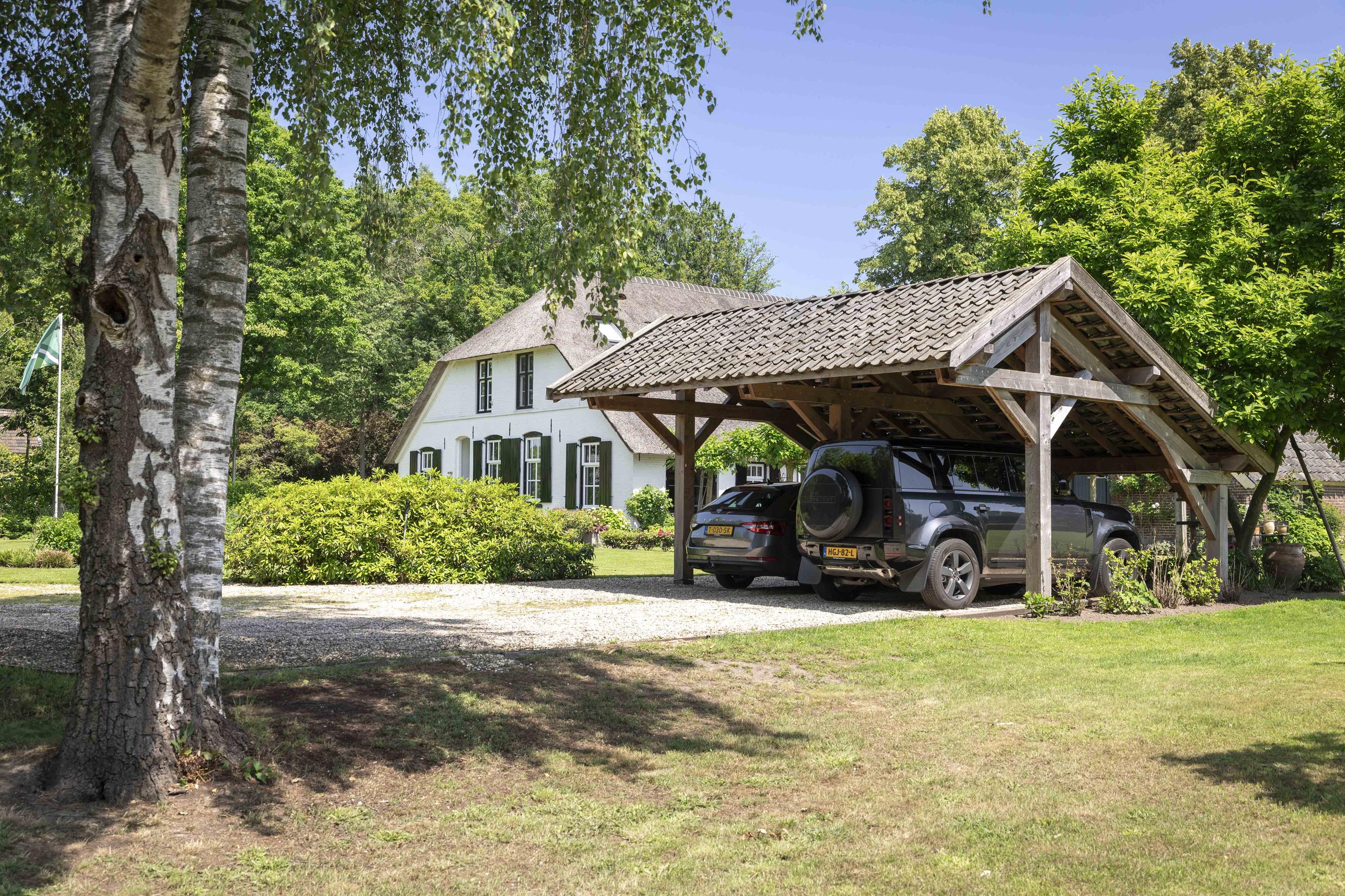 Rond het huis is een prachtige tuin aangelegd, omzoomd door een haag. De oprit wordt speels geflankeerd door rododendrons en aan het einde ervan staat een open kapschuur met ruimte voor twee auto’s. Door de tuin heen staan diverse volwassen bomen. Aan de achterzijde van de tuin is een zitje ingericht, waar u een magnifiek uitzicht hebt over uw erf.