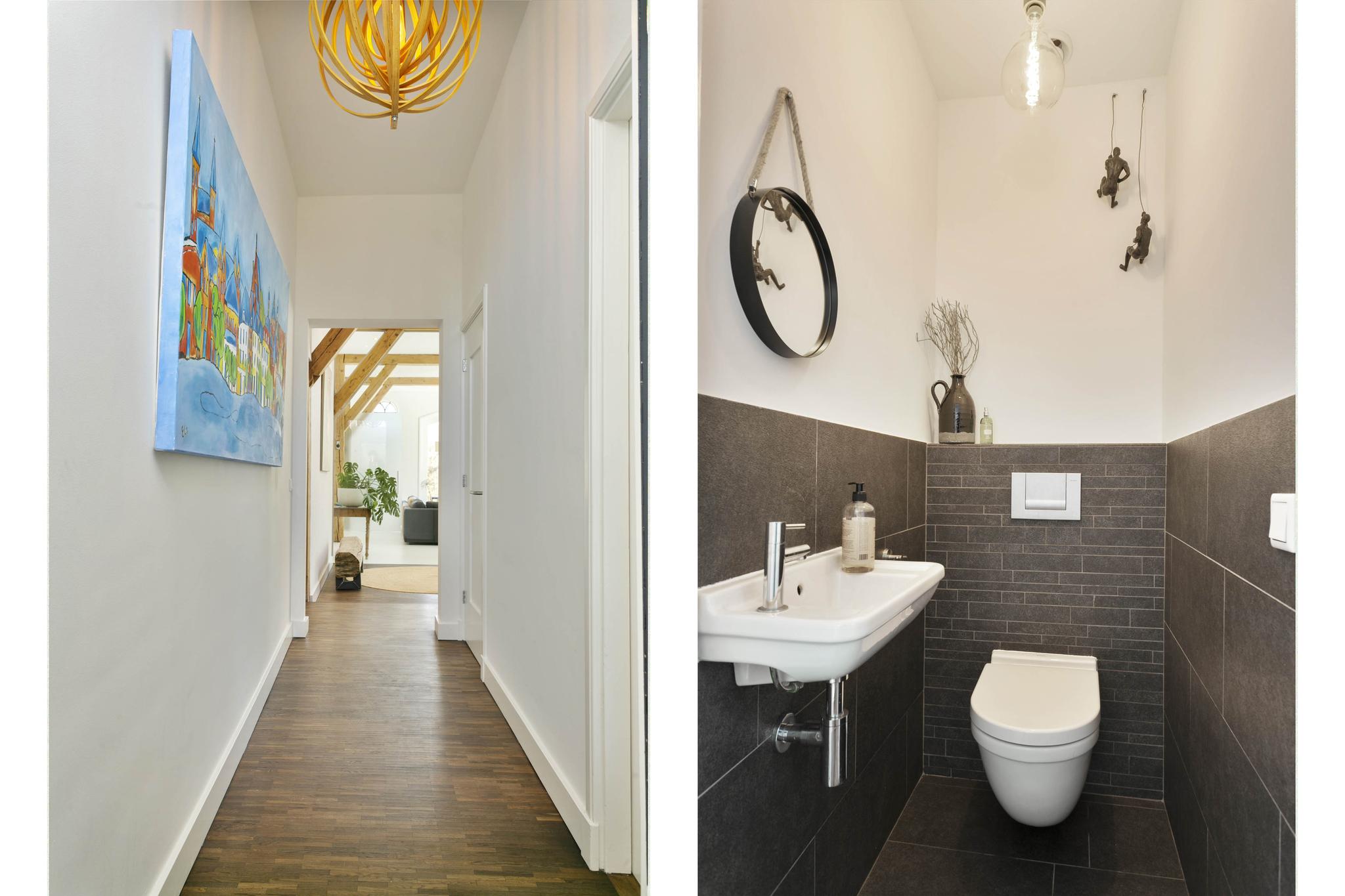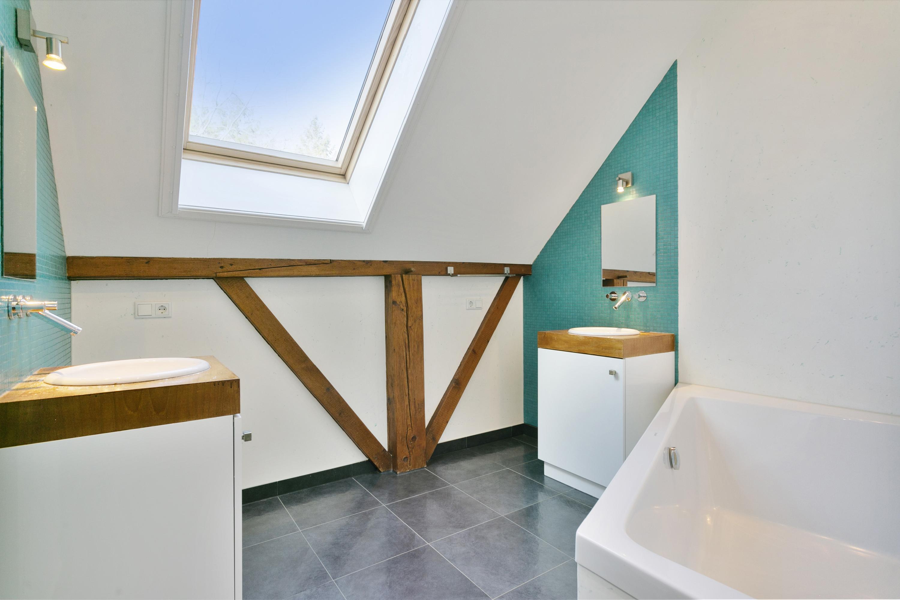 Links drie ruime slaapkamers en een badkamer met twee wastafels, een ligbad en een ruime inloopdouche. Het toilet bevindt zich in een aparte ruimte.
