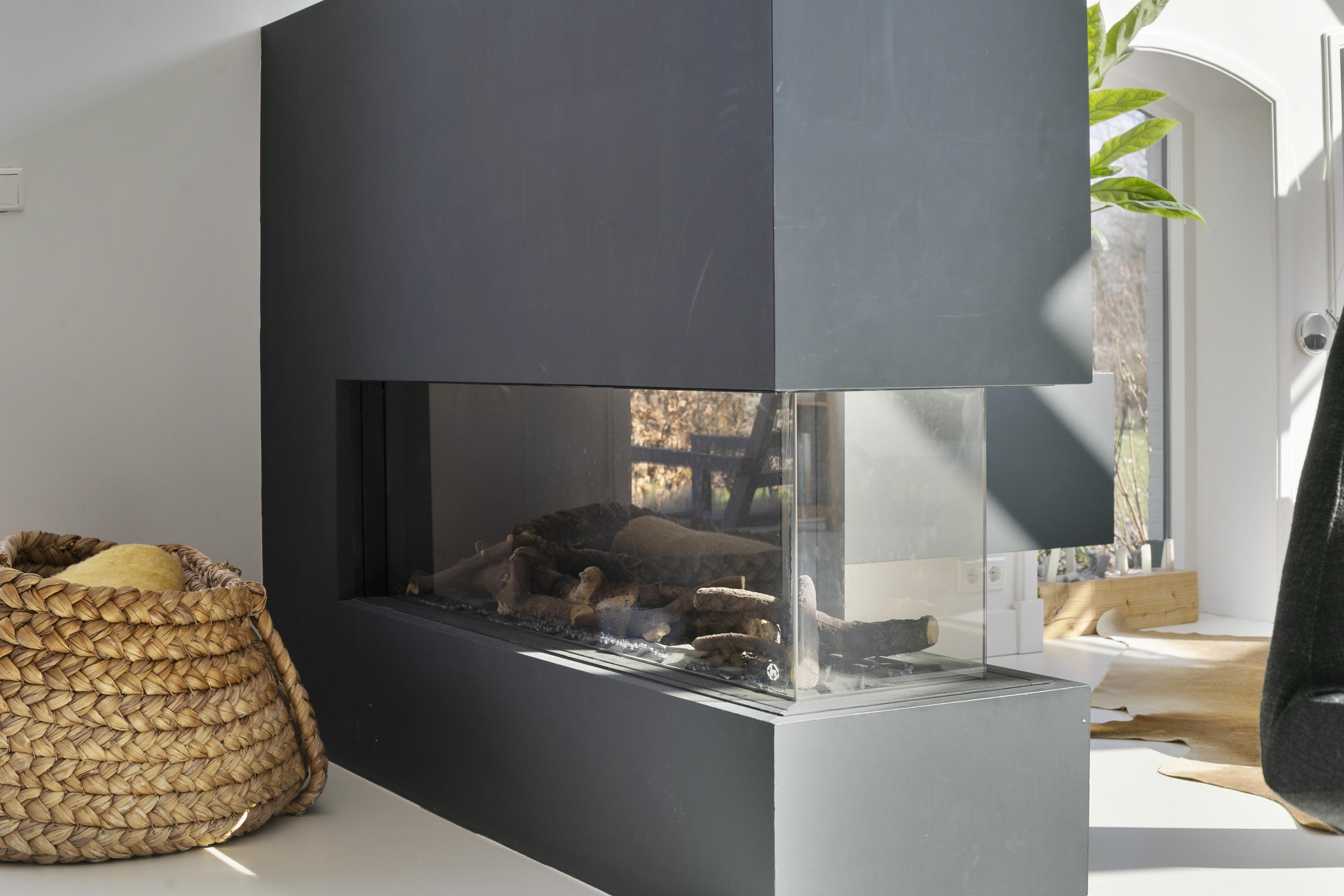 De voormalige deel is nu een riante leefruimte (70 m²). Aan de zuidzijde zijn zowel het zichtbare deel van het dak als de wanden ingevuld met glas, waardoor de ruimte baadt in daglicht. Op de vloer ligt een lichte gietvloer, die perfect samenwerkt met de vloerverwarming. De blikvanger in de kamer is de openhaard achter glas, die met één knop ervoor zorgt dat er een aangenaam vuurtje brandt.