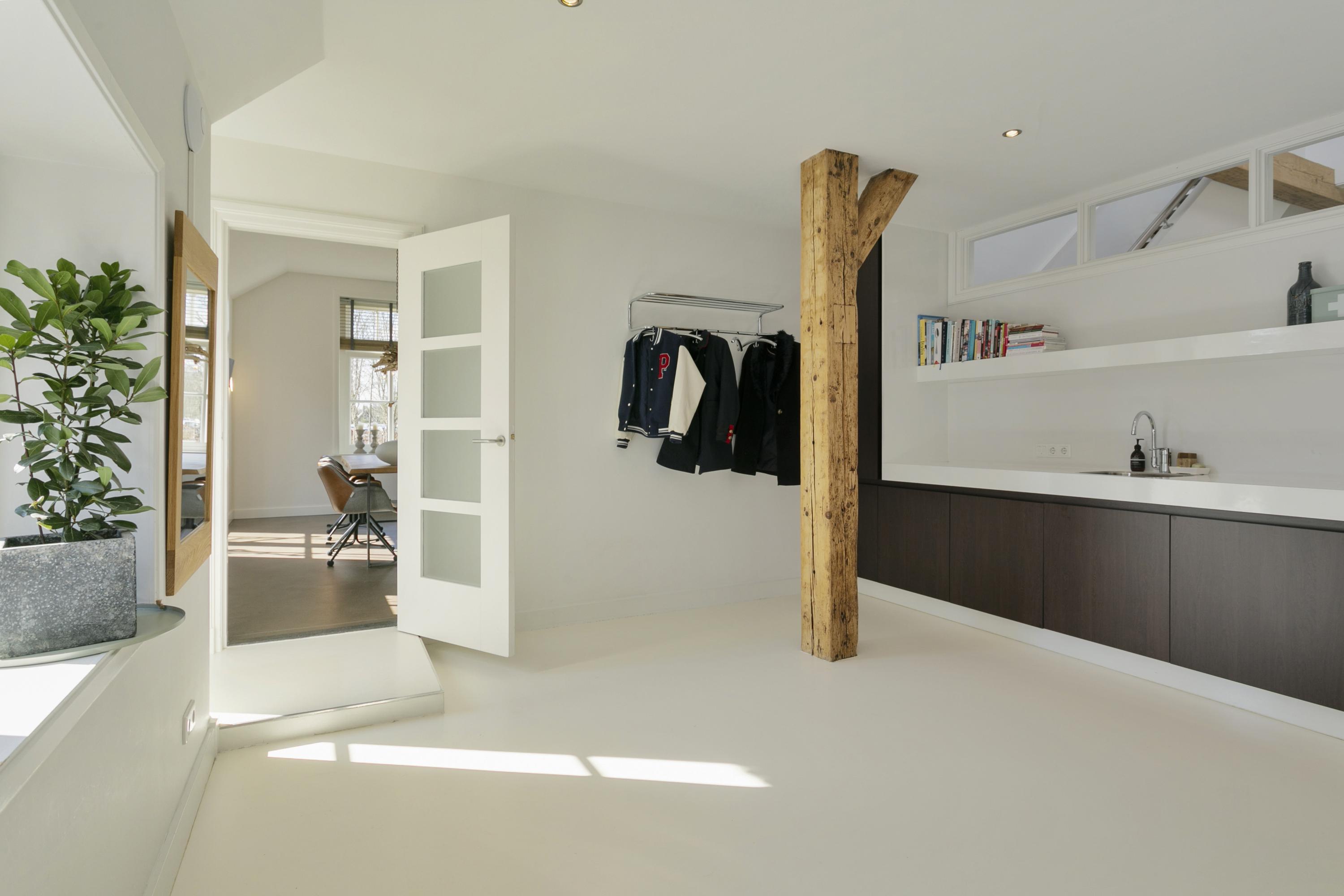 Aansluitend vanuit de centrale hal en de keuken toegang tot de bijkeuken/ tweede entree; een zee van licht, door de witte gietvloer, wanden en plafonds. Hier bevinden zich de garderobe, de pantry met spoelbak en de aansluitingen voor de wasmachine en -droger.
