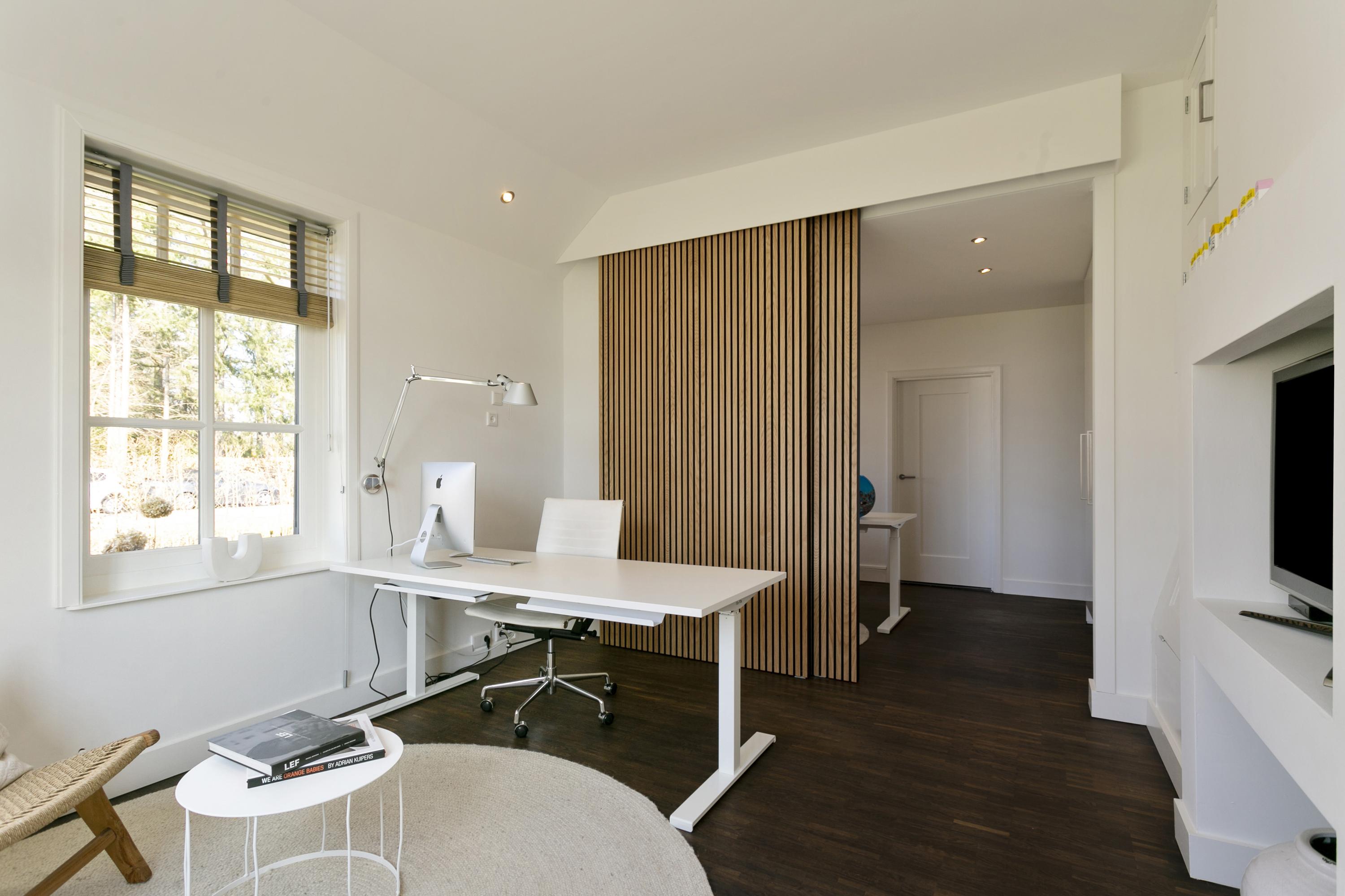 Vanuit de entree links een dubbele werkruimte, gescheiden door een geluiddempende wand, met aan de achterzijde een bergruimte.