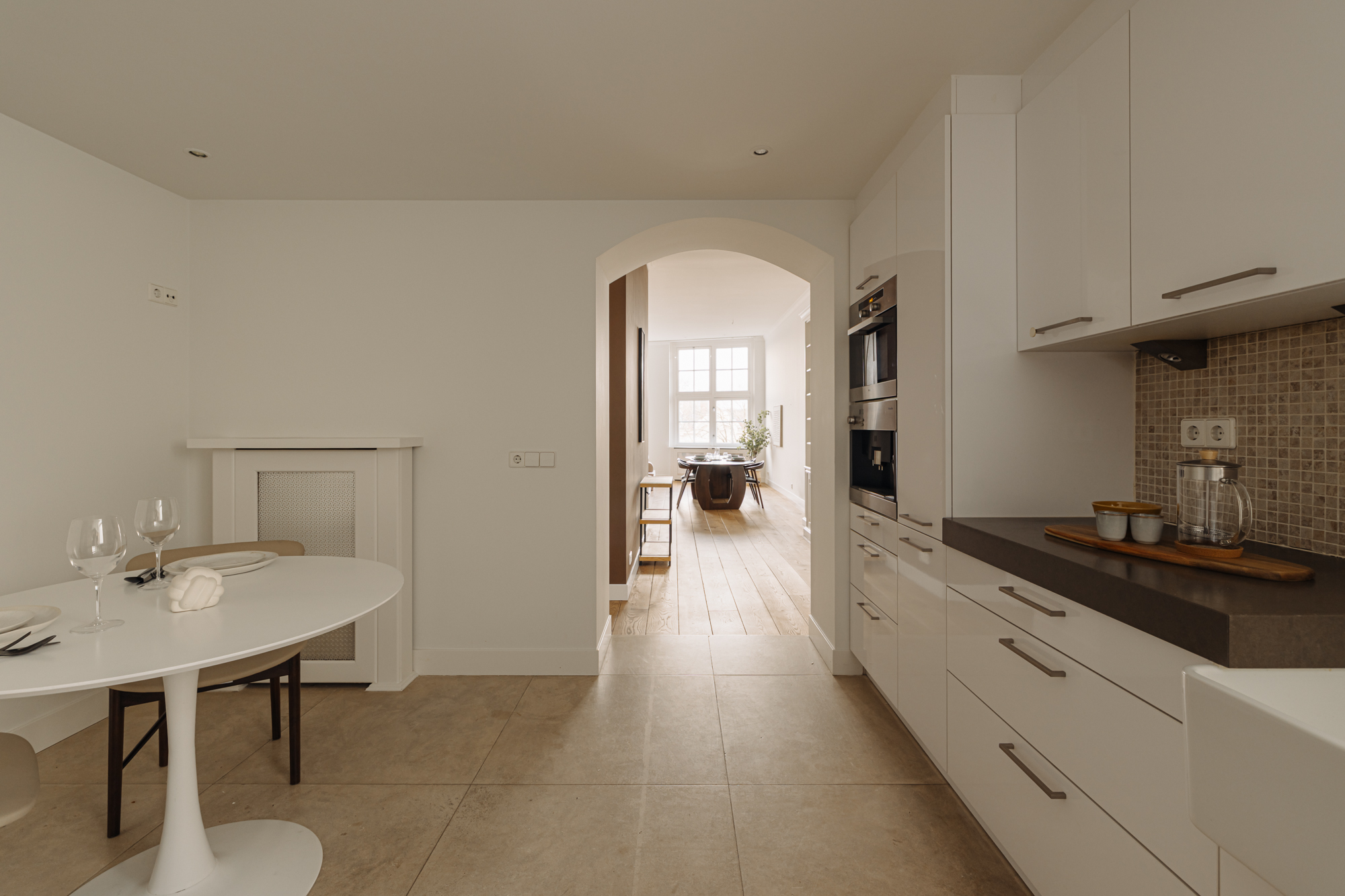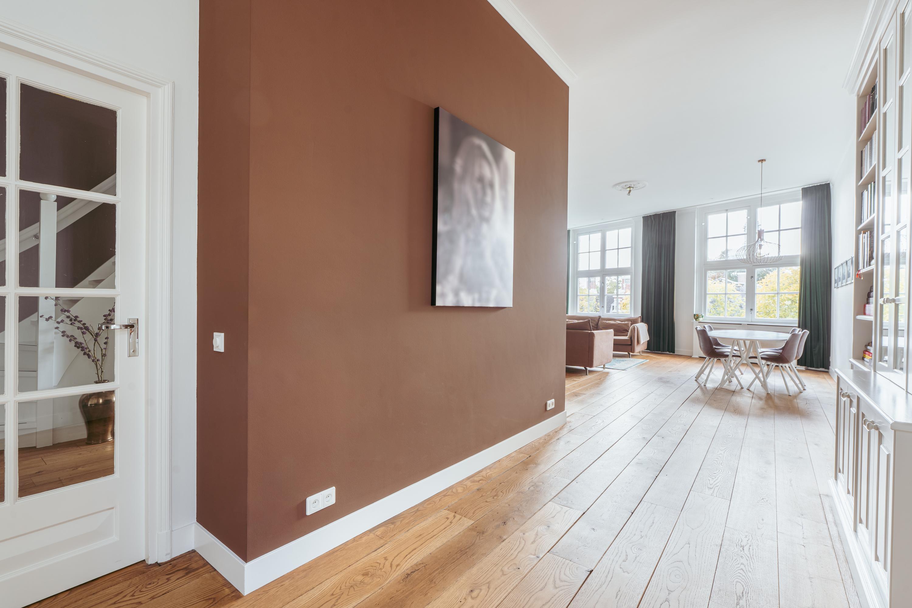 Via de imposante entree bereikt u het appartement op de derde verdieping. U komt naar boven via het verzorgde trappenhuis of met één van de twee liften. Bij binnenkomst betreedt u de centrale hal, vanwaar u middels dubbele openslaande deuren toegang heeft tot de royale woonkamer. Deze indrukwekkende ruimte is gelegen aan de voorzijde en voorzien van grote raampartijen, waardoor er een overvloed aan natuurlijk licht binnenvalt en u geniet van een prachtig uitzicht over de grachten.