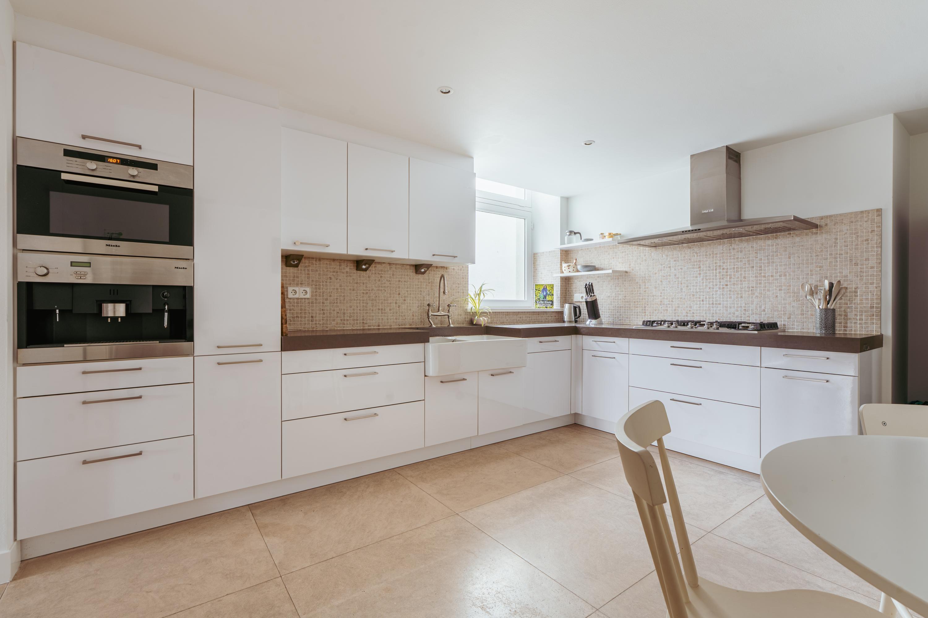 De woonkamer biedt ruimschoots plaats voor een royale zithoek en een comfortabel eetgedeelte. Daarnaast is er een fraaie ingebouwde open haard aanwezig en bevindt zich om de hoek een ideale werkplek met op maat gemaakte kastenwanden. Aan de achterzijde treft u de sfeervolle woonkeuken, uitgerust met een 5-pits gasfornuis met afzuigkap, oven, koffieapparaat, dubbele spoelbak en een koel-/vriescombinatie. Vanuit de keuken heeft u tevens toegang tot de centrale hal. Hier bevinden zich een separaat toilet met fontein en een praktische garderobekast.