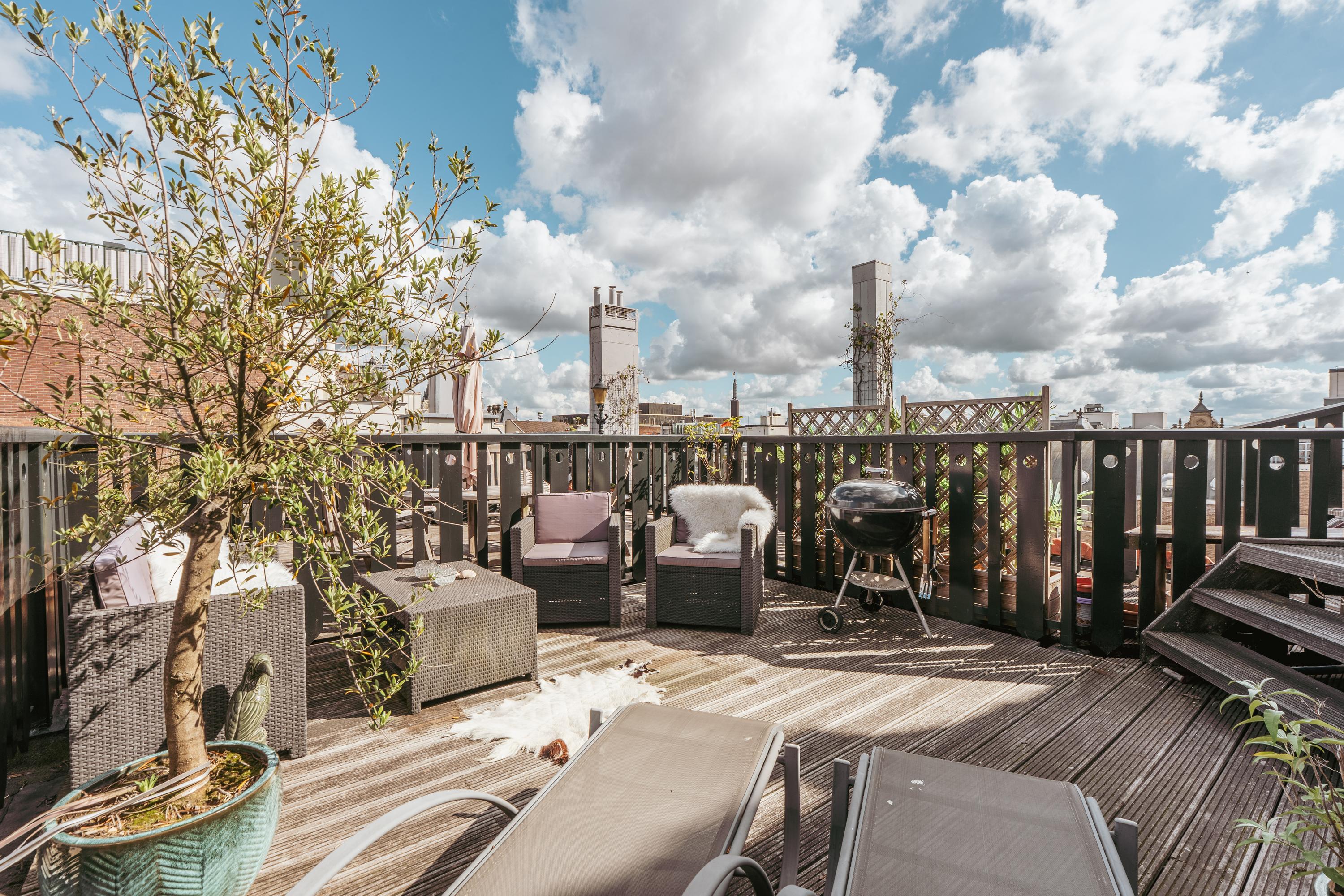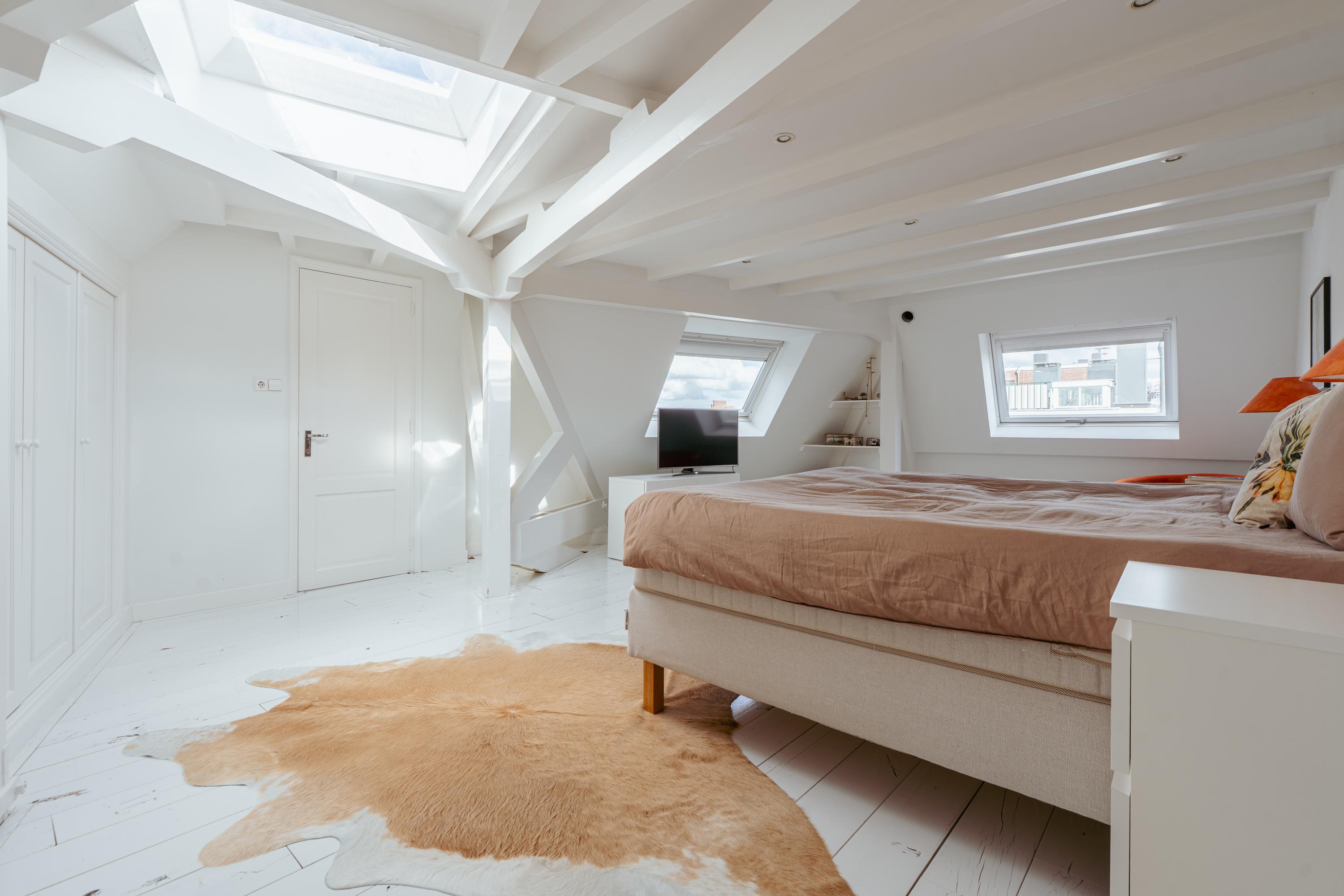 De eerste slaapkamer bevindt zich op de vierde verdieping en beschikt over een ingebouwd bureau en een handige bergkast. Via dubbele openslaande deuren heeft u toegang tot het riante dakterras (ca. 23 m²).
