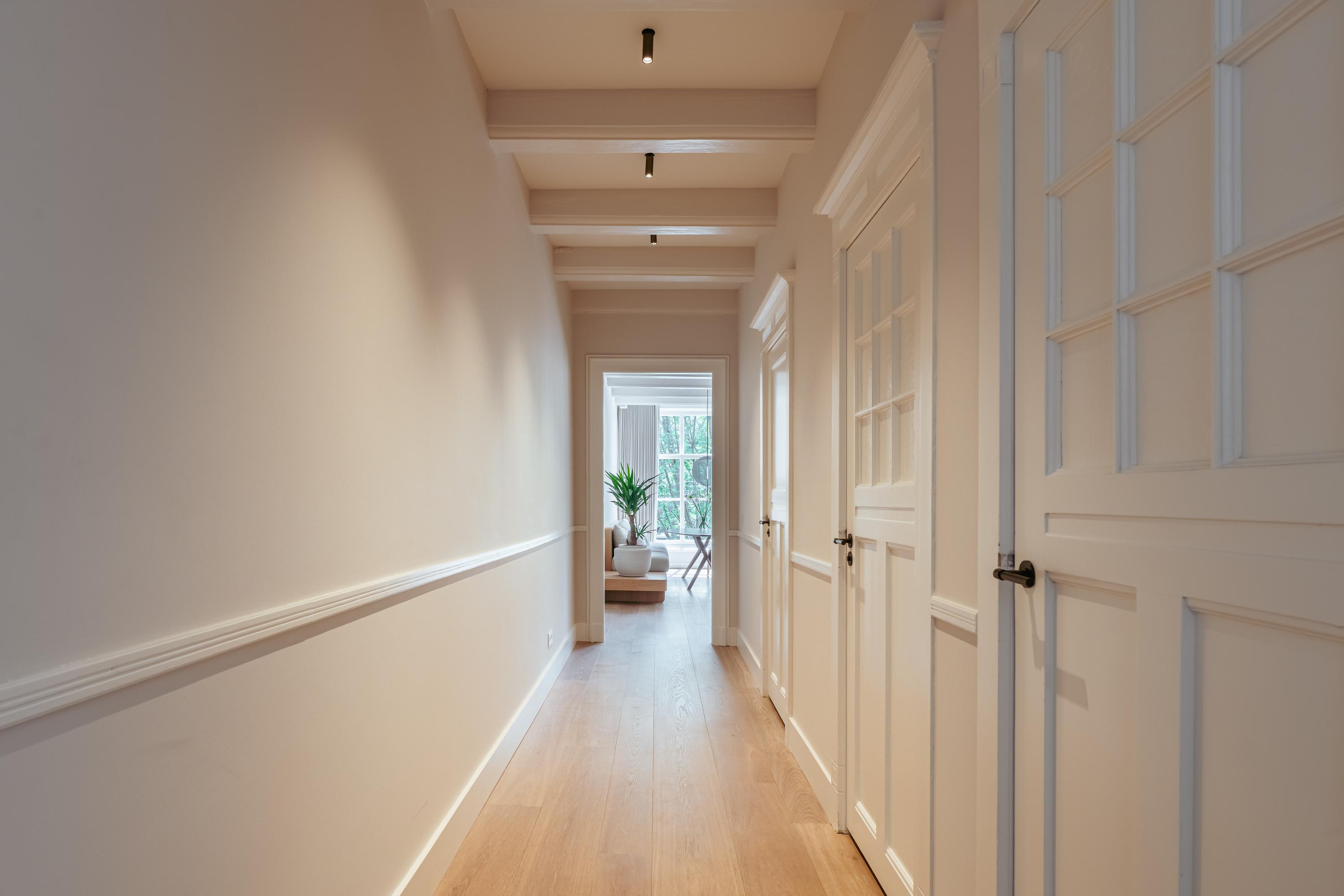 Middels het gemeenschappelijke trappenhuis bereikt u de entree van dit indrukwekkende appartement. De woning is in 2022 volledig en hoogwaardig verbouwd door architecten, waarbij klassieke details en moderne luxe op sublieme wijze zijn gecombineerd. Dankzij de aanwezigheid van onder meer domotica en vloerverwarming is het wooncomfort van een hoog niveau.