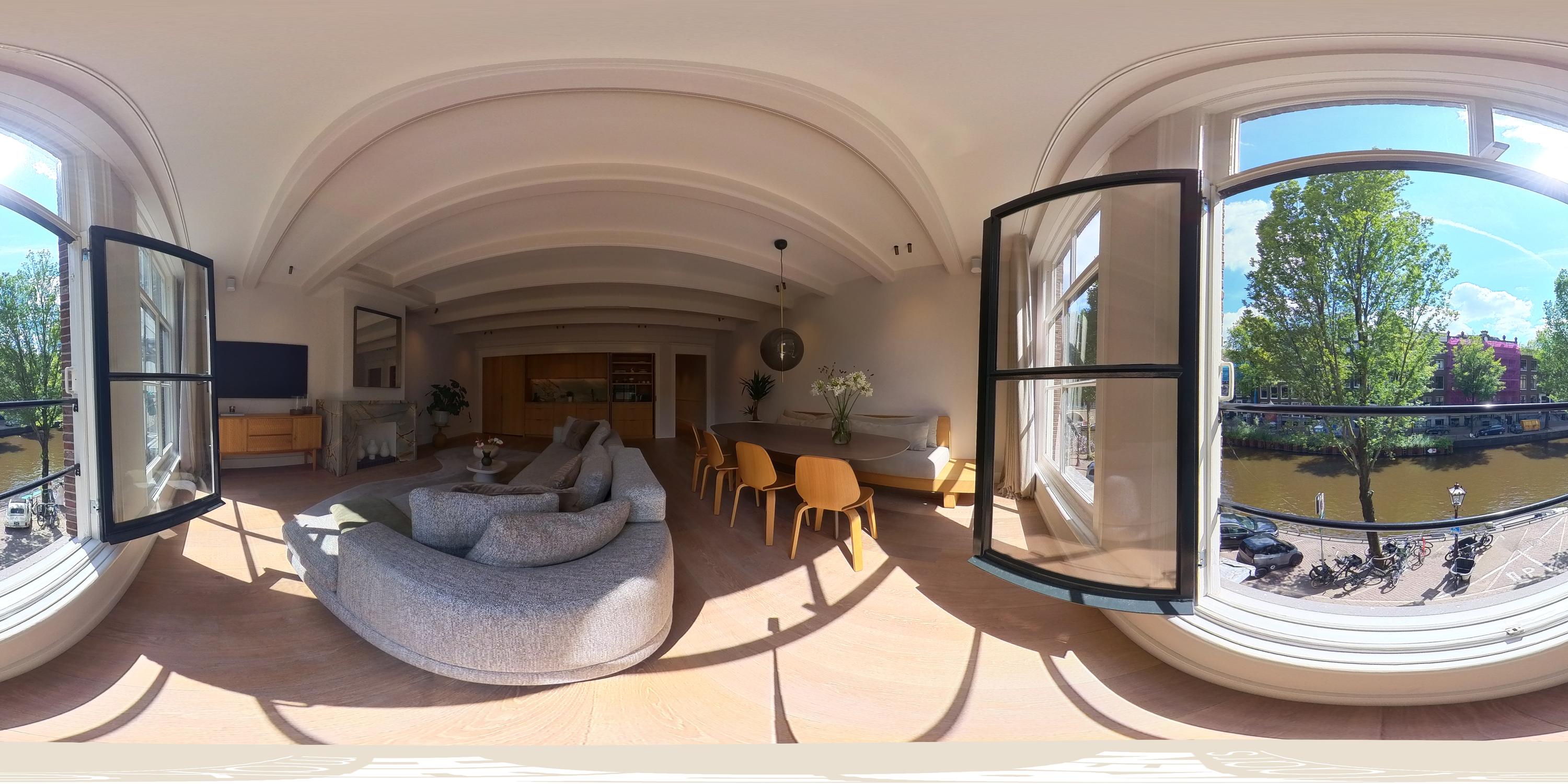 Aan de voorzijde bevindt zich de prachtige en breed opgezette woonkamer met grote raampartijen en fenomenaal uitzicht over de Herengracht. De ruimte wordt gekenmerkt door veel lichtinval en een bijzonder detail: de schouw en de achterwand in de keuken zijn uitgevoerd in hetzelfde kleurrijke marmer, wat zorgt voor een luxe en stijlvolle uitstraling.