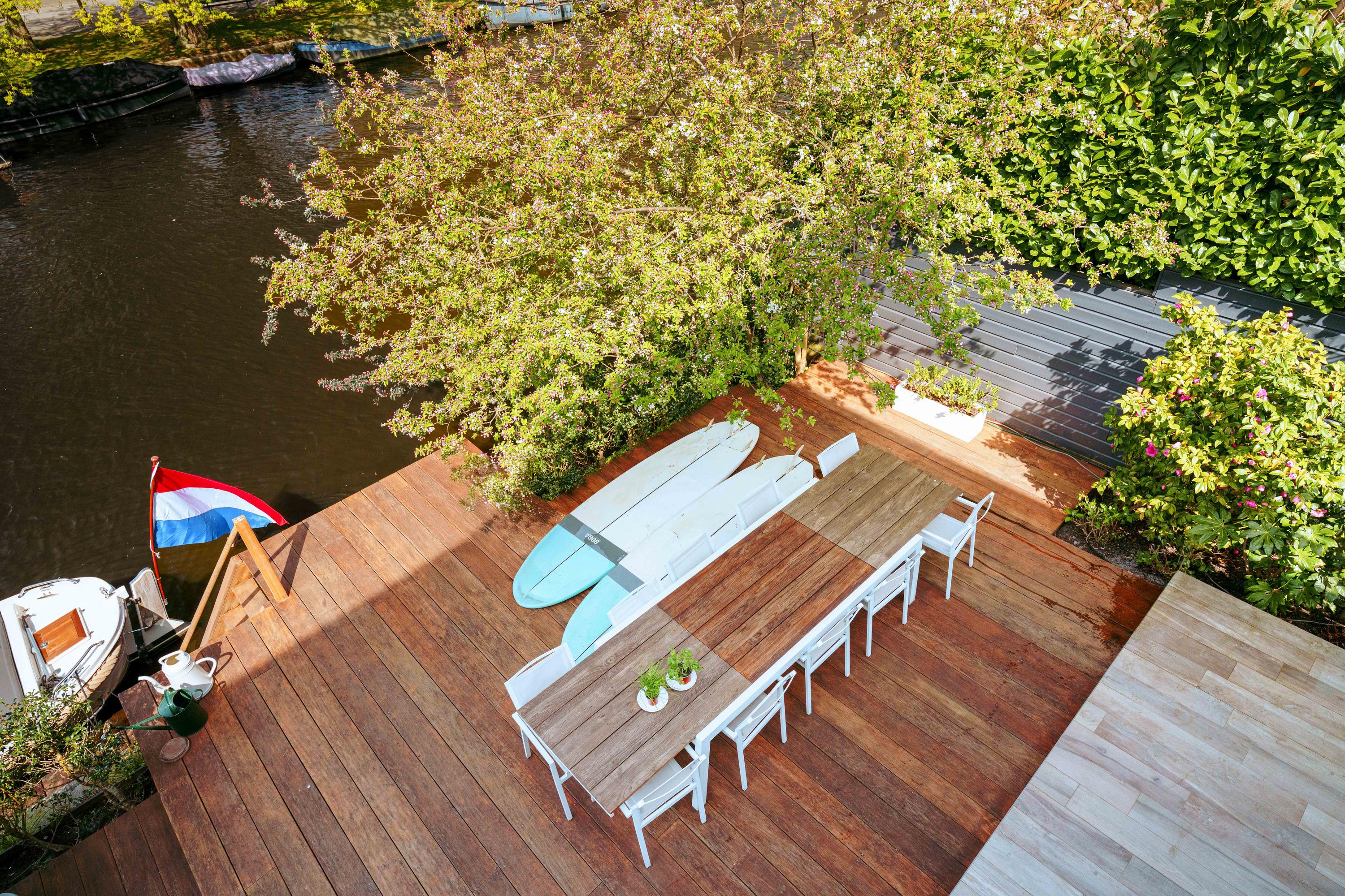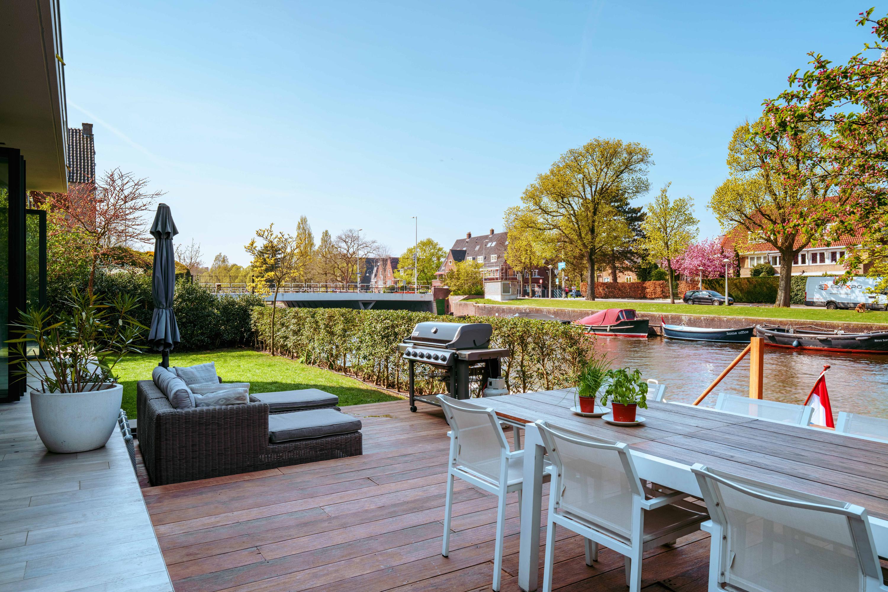 - Ruime en zonnige tuin rondom de gehele woning van ca. 441 m², met directe toegang tot een aanlegsteiger;