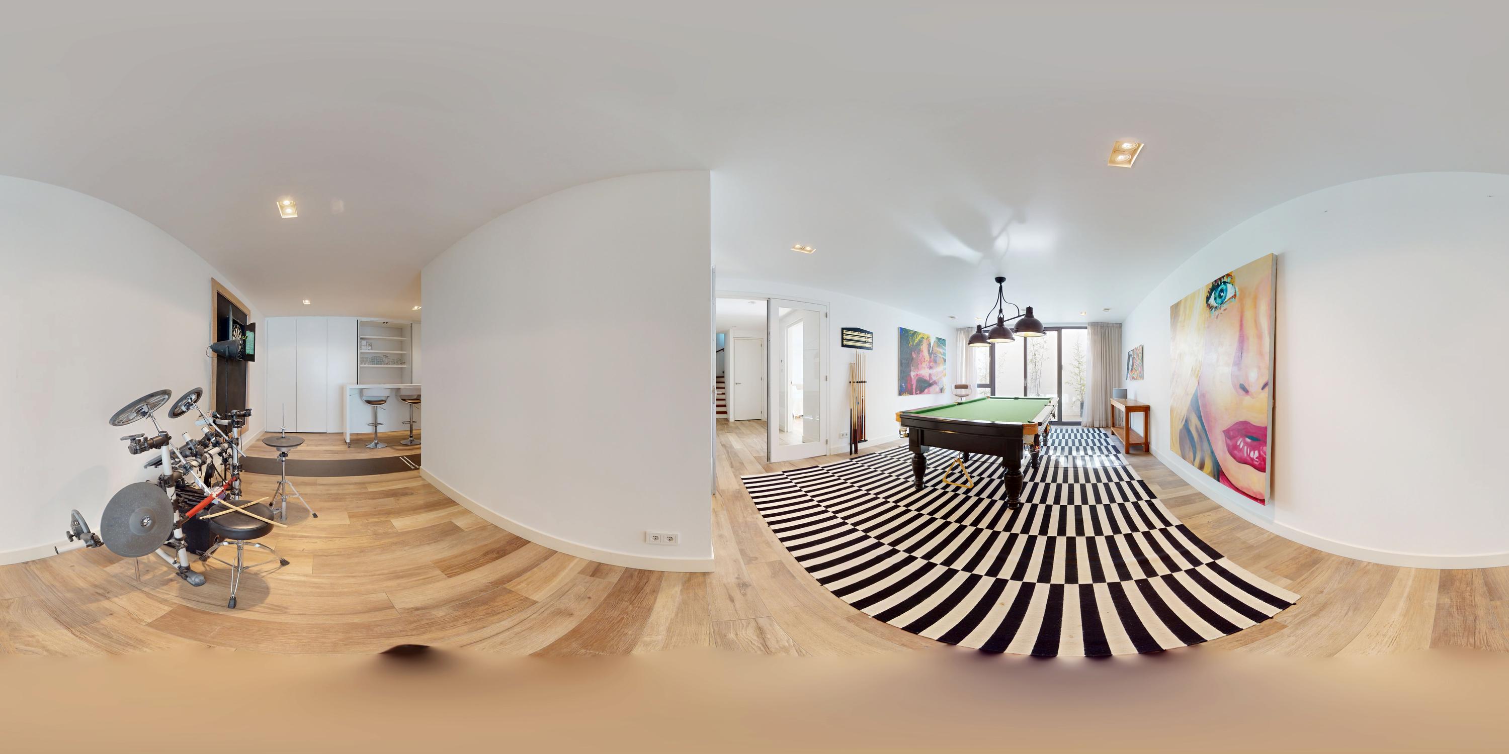 - Souterrain met hoge plafonds, royale bergruimte, thuisbioscoop en bar;