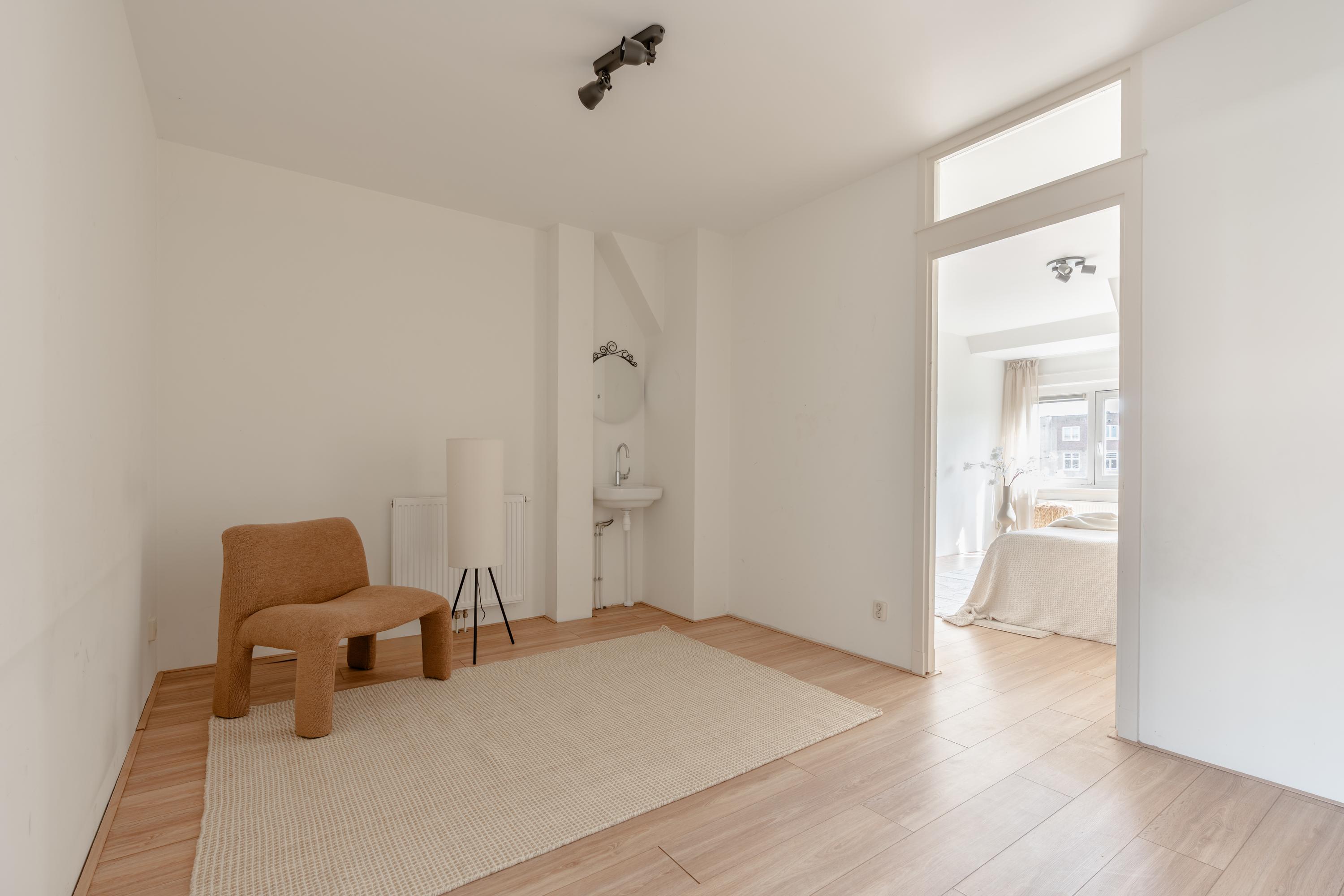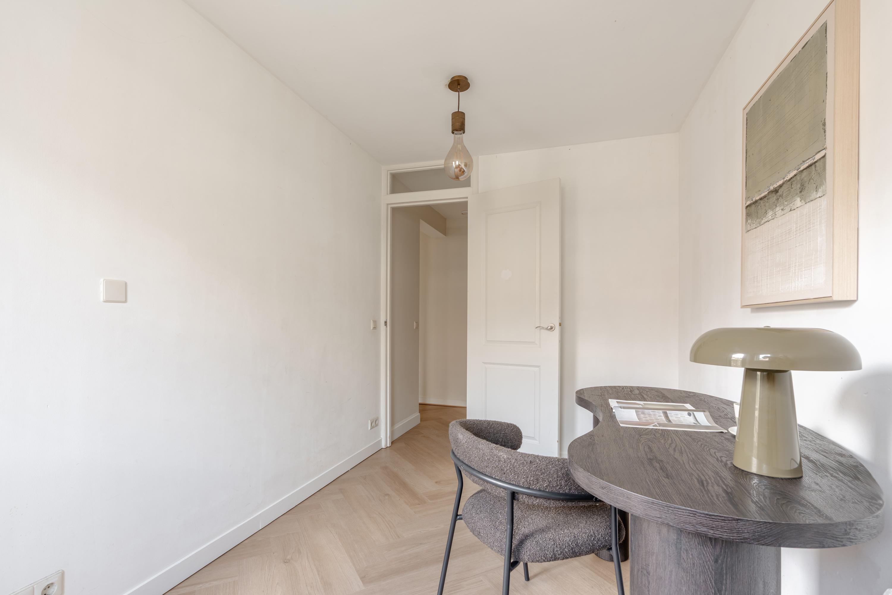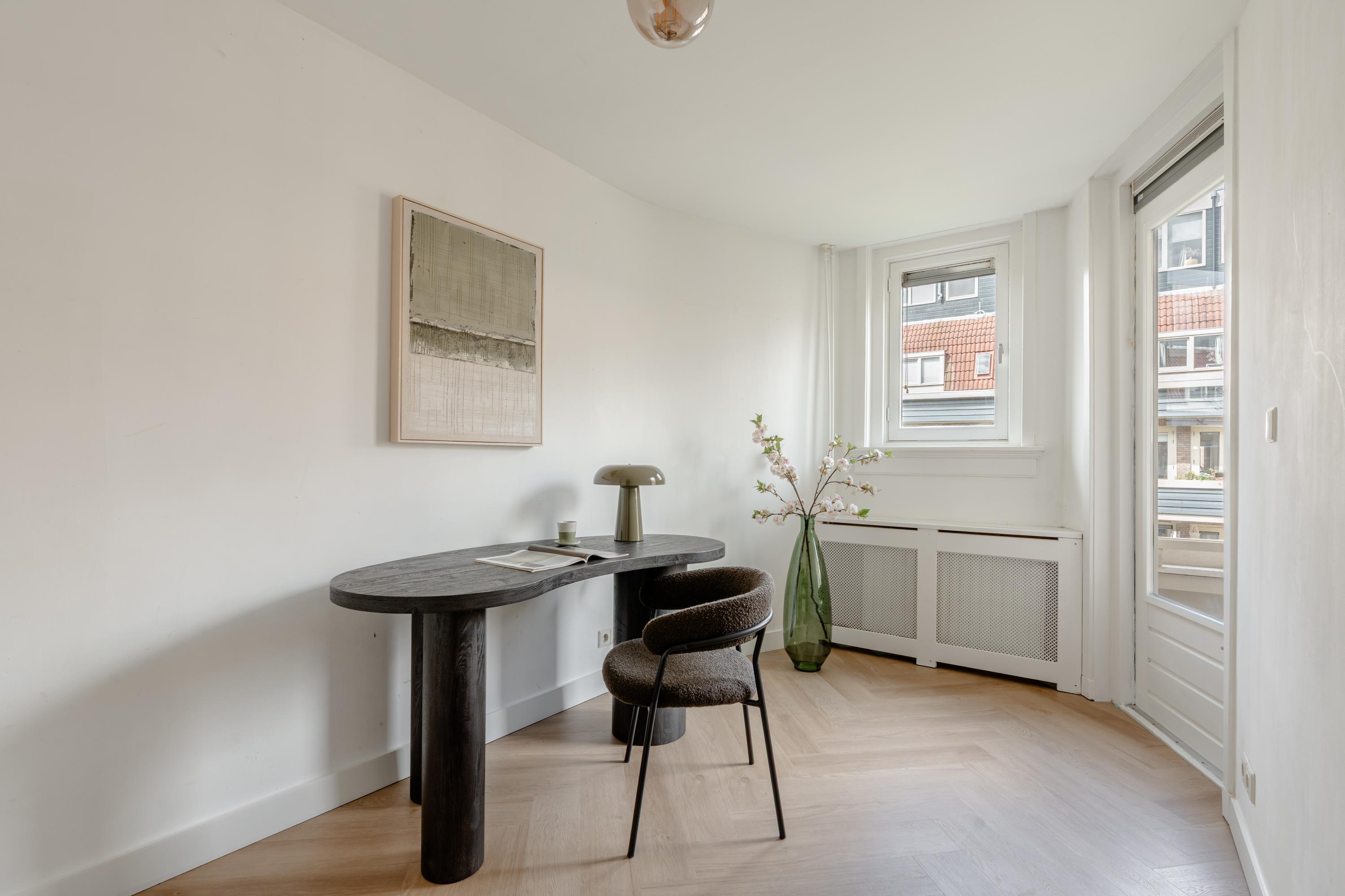 De woonkamer aan de voorzijde biedt volop ruimte voor het creëren van een comfortabel zitgedeelte. De sfeervolle erker met openslaande ramen zorgt voor een fijn lichtinval en biedt een prettig uitzicht over de Jozef Israëlskade en het water. Aan de achterzijde bevindt zich de keuken, gesitueerd in een fijne open ruimte maar afgescheiden van de woonkamer. Dit maakt het een ideale plek om in alle rust te koken en gezellig te dineren. Dankzij de drie openslaande deuren naar het balkon is deze ruimte uitzonderlijk licht. De keuken is compleet uitgerust met onder andere een koelkast, vriezer, vaatwasser en een 4-pits gasfornuis. Het brede balkon, gelegen op het noordwesten, kijkt uit over de rustige binnentuin en vormt een heerlijke plek om te ontspannen. Aansluitend aan de keuken bevindt zich een slaapkamer met eveneens toegang tot het balkon. Deze ruimte is flexibel in te richten, bijvoorbeeld als werk-, studie- of kinderkamer. Op deze woonlaag bevindt zich tevens de badkamer, die is voorzien van een ligbad, toilet, inloopdouche en wastafel.