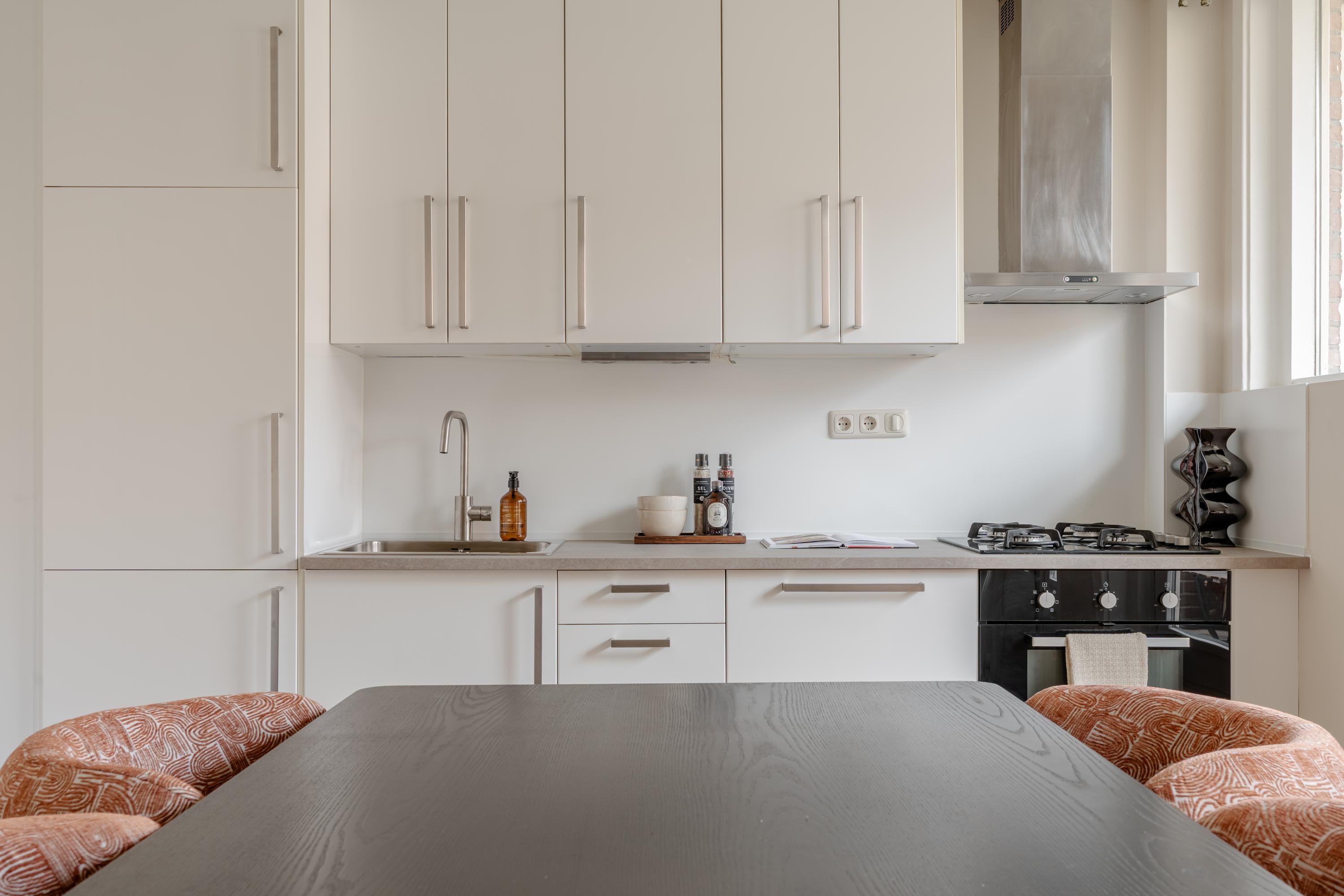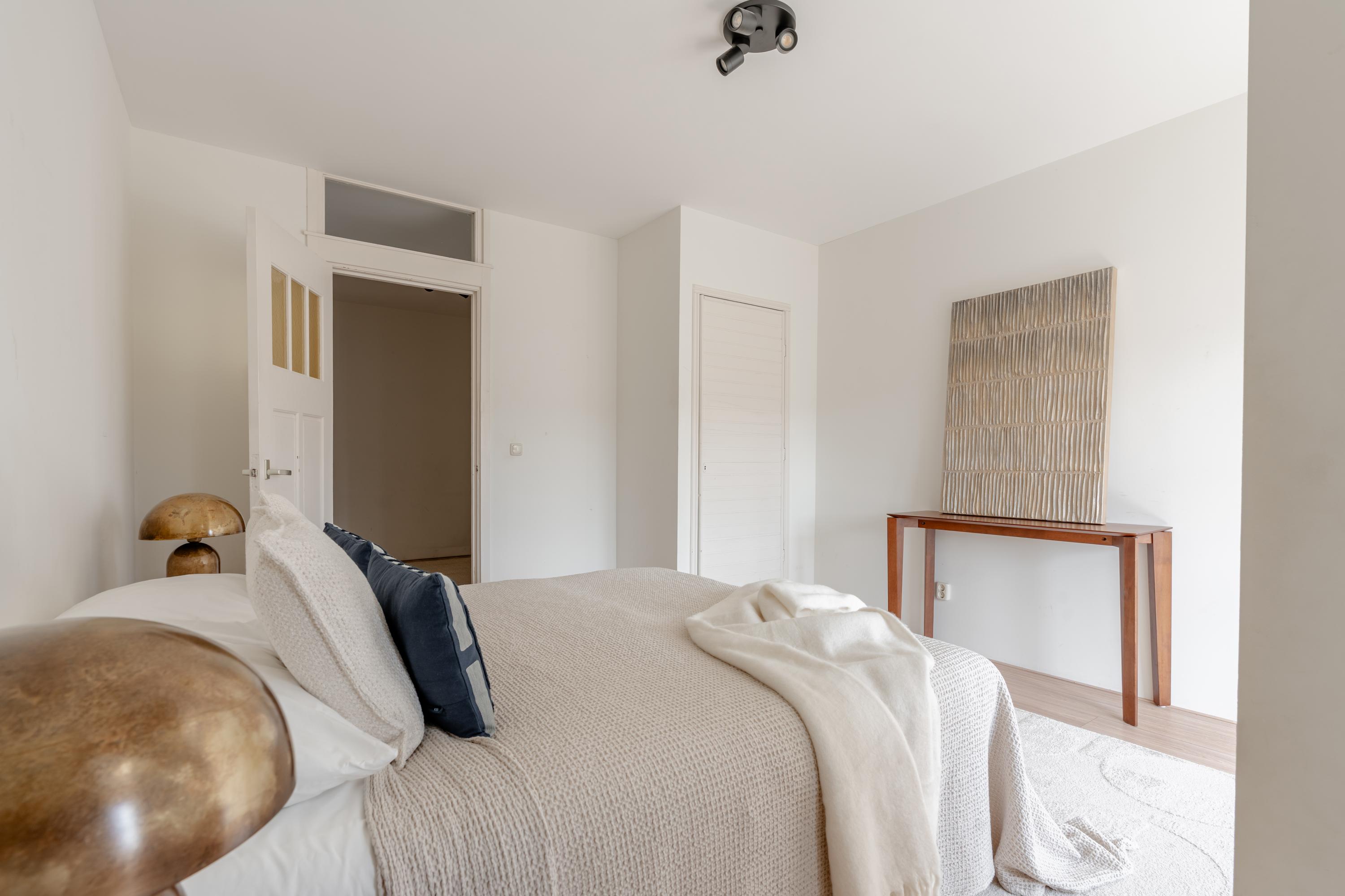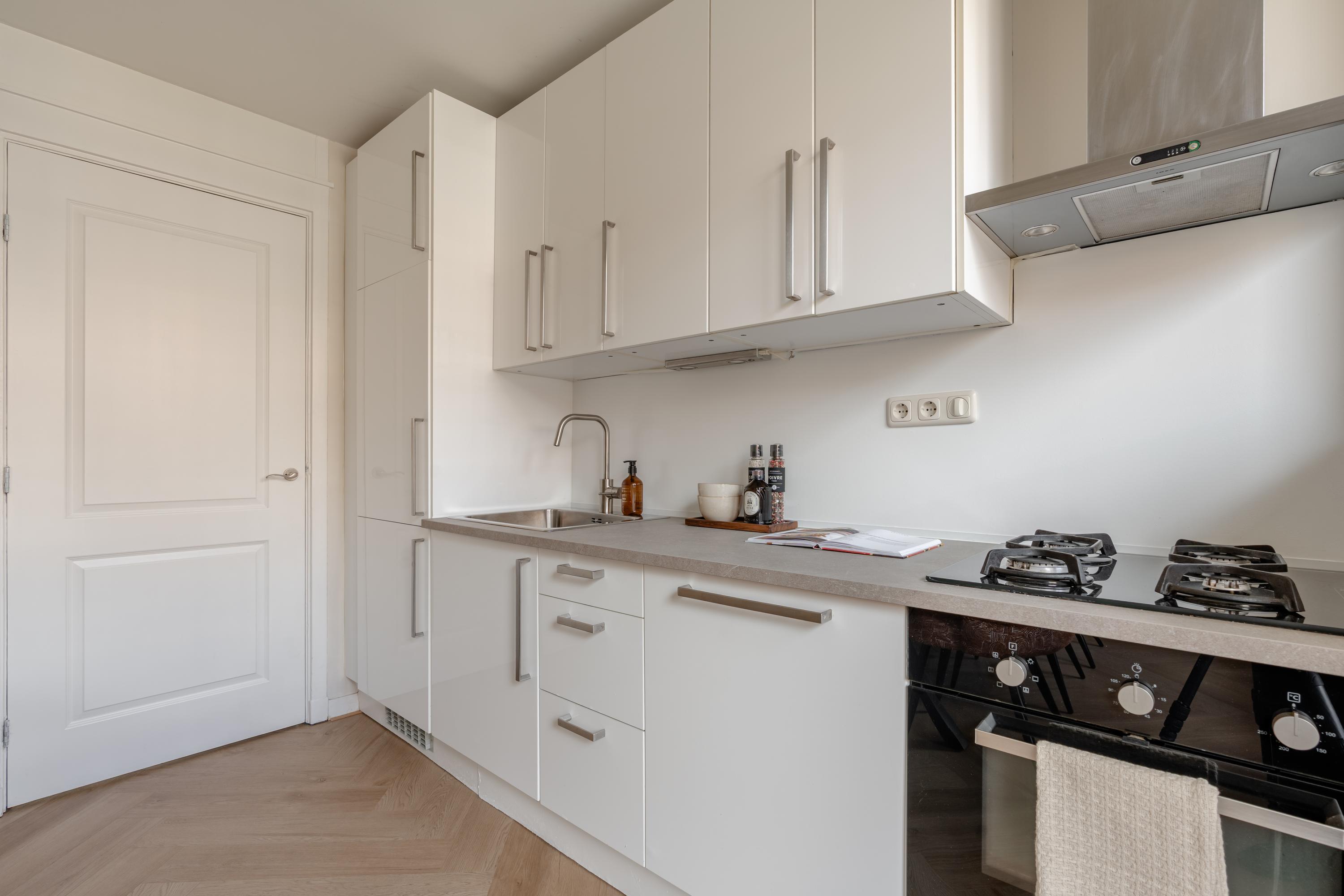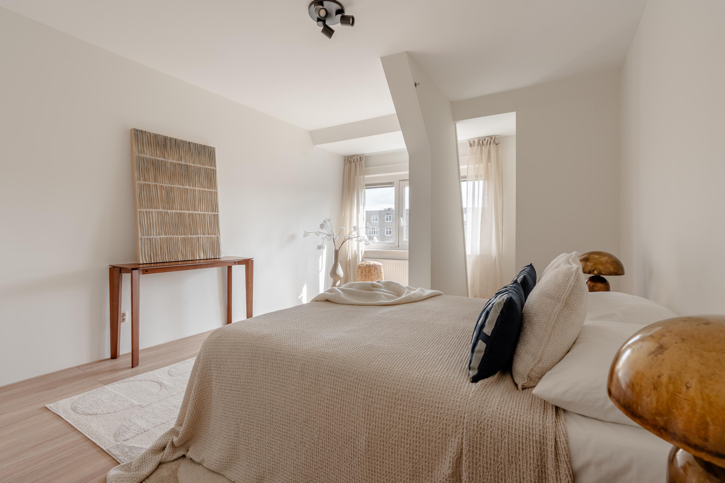 De woonkamer aan de voorzijde biedt volop ruimte voor het creëren van een comfortabel zitgedeelte. De sfeervolle erker met openslaande ramen zorgt voor een fijn lichtinval en biedt een prettig uitzicht over de Jozef Israëlskade en het water. Aan de achterzijde bevindt zich de keuken, gesitueerd in een fijne open ruimte maar afgescheiden van de woonkamer. Dit maakt het een ideale plek om in alle rust te koken en gezellig te dineren. Dankzij de drie openslaande deuren naar het balkon is deze ruimte uitzonderlijk licht. De keuken is compleet uitgerust met onder andere een koelkast, vriezer, vaatwasser en een 4-pits gasfornuis. Het brede balkon, gelegen op het noordwesten, kijkt uit over de rustige binnentuin en vormt een heerlijke plek om te ontspannen. Aansluitend aan de keuken bevindt zich een slaapkamer met eveneens toegang tot het balkon. Deze ruimte is flexibel in te richten, bijvoorbeeld als werk-, studie- of kinderkamer. Op deze woonlaag bevindt zich tevens de badkamer, die is voorzien van een ligbad, toilet, inloopdouche en wastafel.