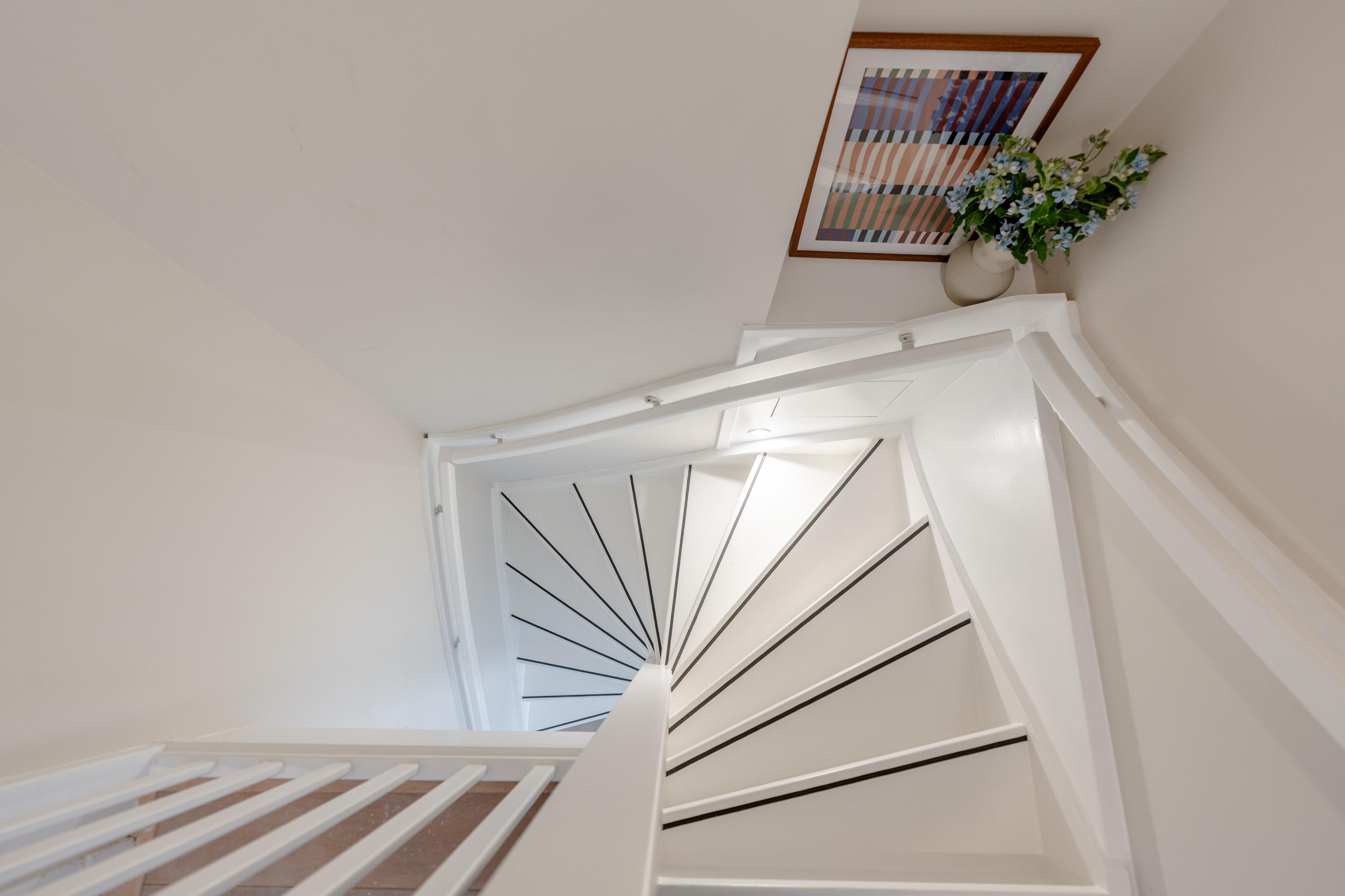 Via de trap in de hal bereikt u de tweede woonlaag. Hier bevinden zich drie slaapkamers die vanaf de overloop toegankelijk zijn: twee aan de achterzijde en één aan de voorzijde. Twee van de slaapkamers zijn royaal van formaat en profiteren van veel natuurlijk licht dankzij de grote raampartijen, wat zorgt voor een aangename en lichte sfeer in alle vertrekken.