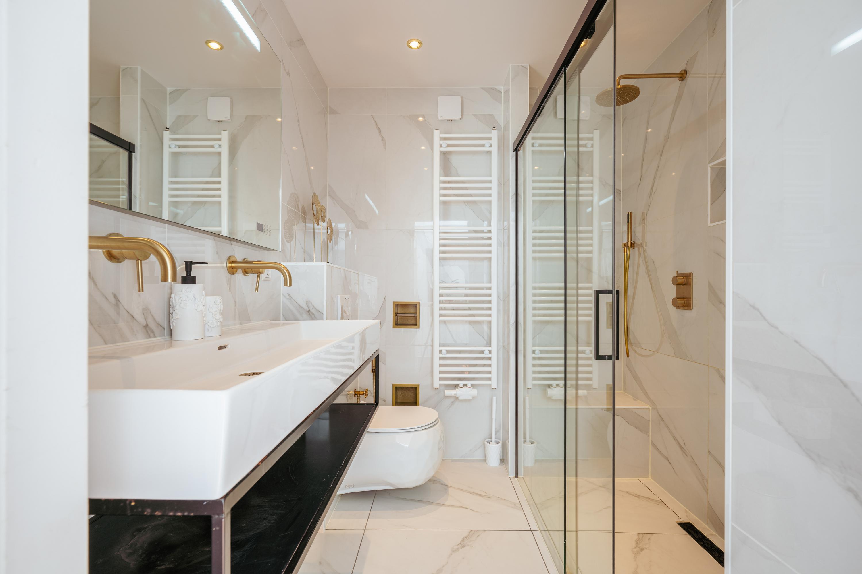 Op de bovenste verdieping bevinden zich nog eens twee royale slaapkamers, eveneens verdeeld over de voor- en achterzijde. De tweede badkamer is centraal geplaatst en uitgerust met een dubbele wastafel met meubel, een dubbele regendouche en een toilet – ideaal voor grotere gezinnen of gasten.