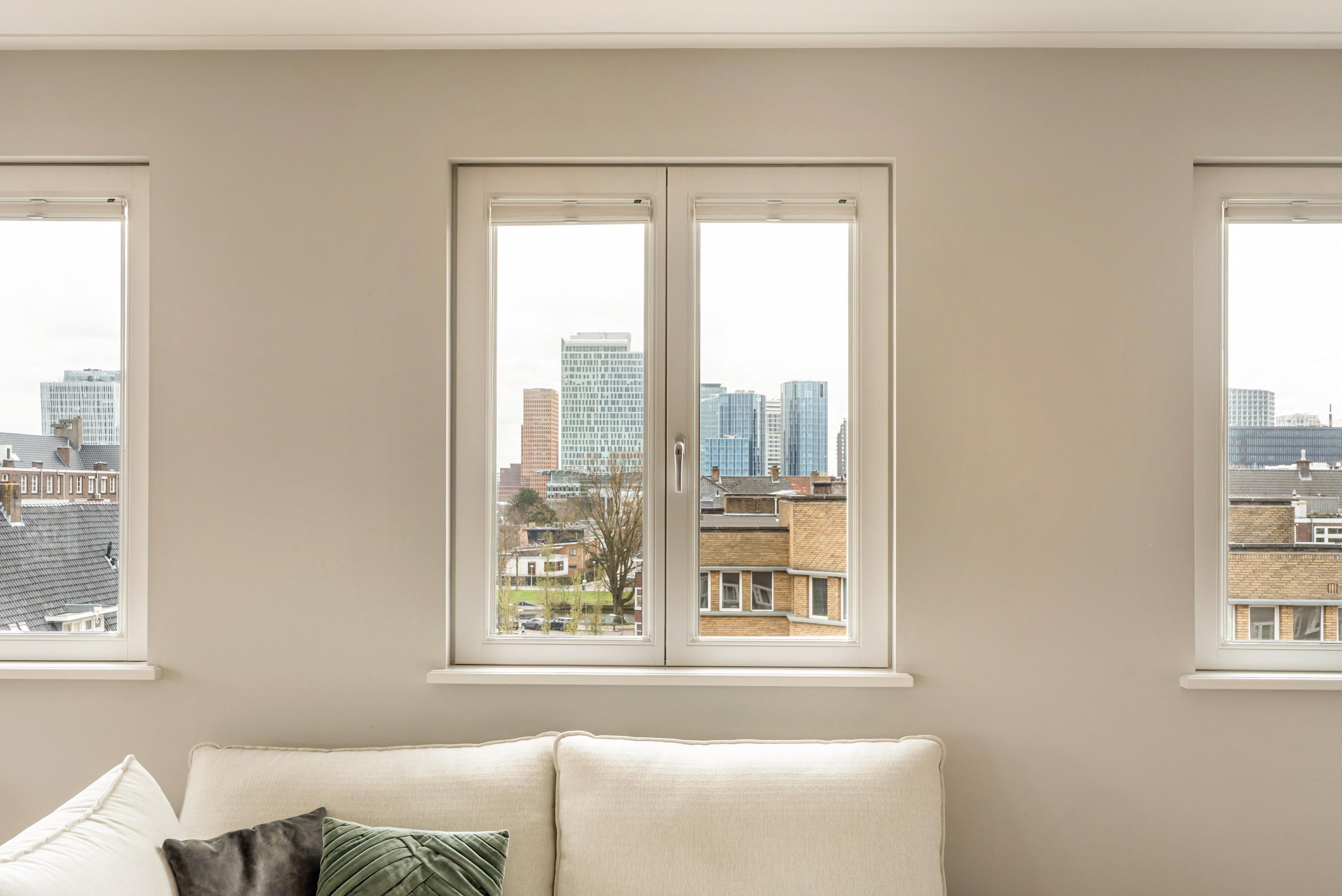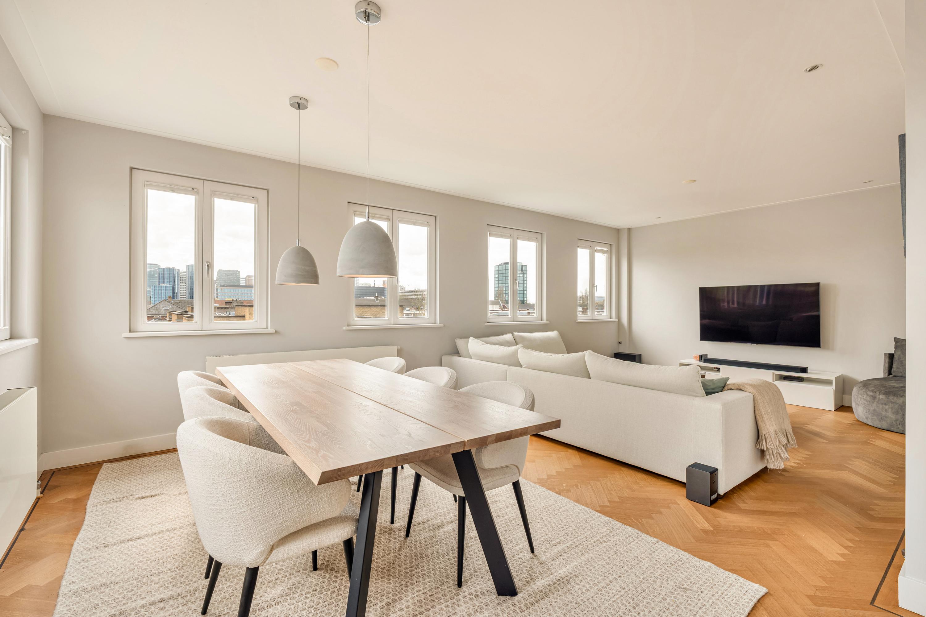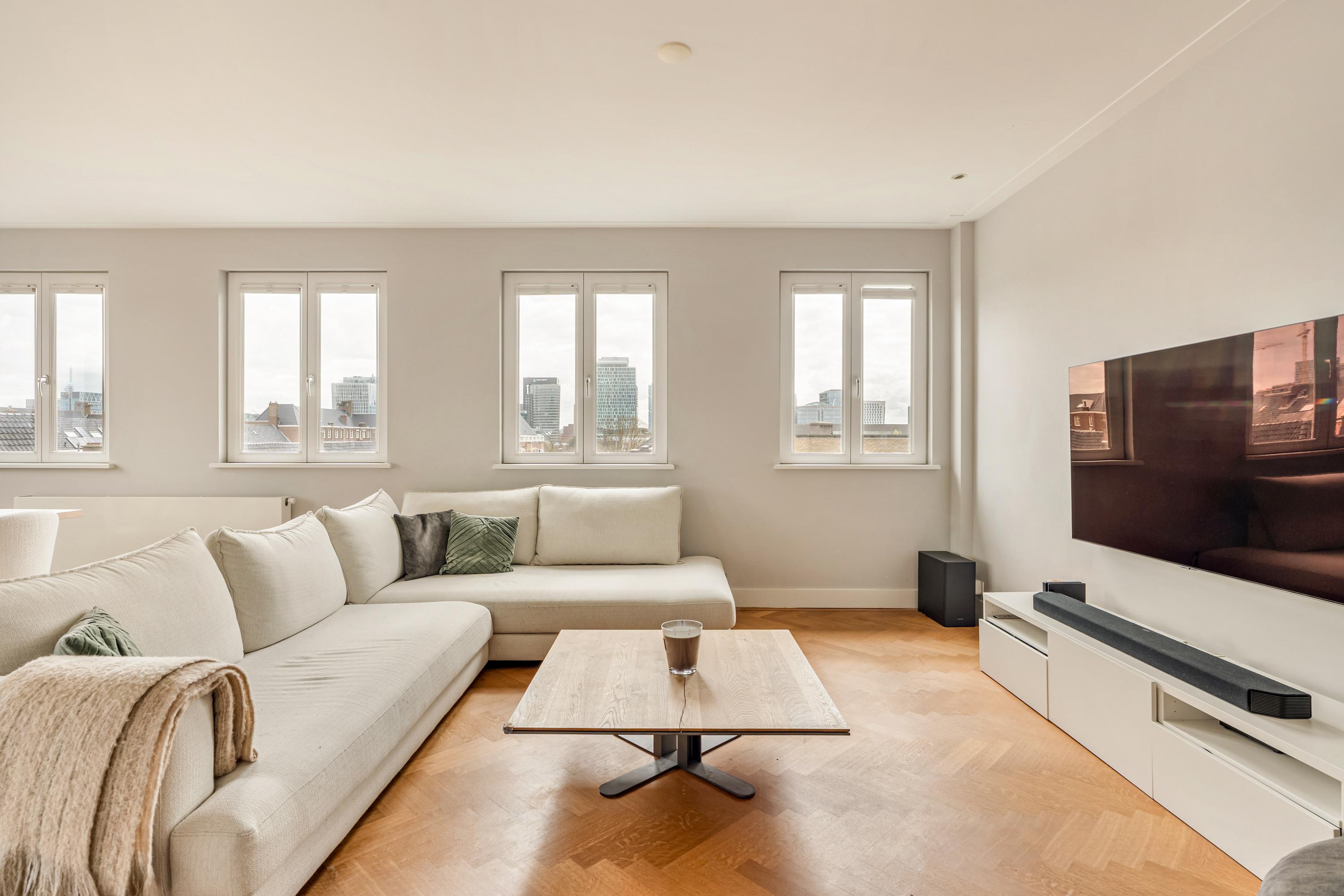 De aangrenzende woonkamer profiteert optimaal van de hoekligging en is dankzij maar liefst acht raampartijen uitzonderlijk licht. Het vrije uitzicht over het Minervaplein, de Michelangelostraat en de skyline van de Zuidas is indrukwekkend en met name in de avond bijzonder sfeervol.