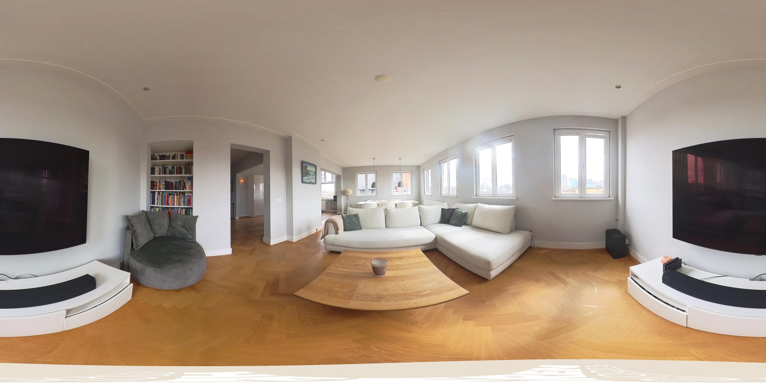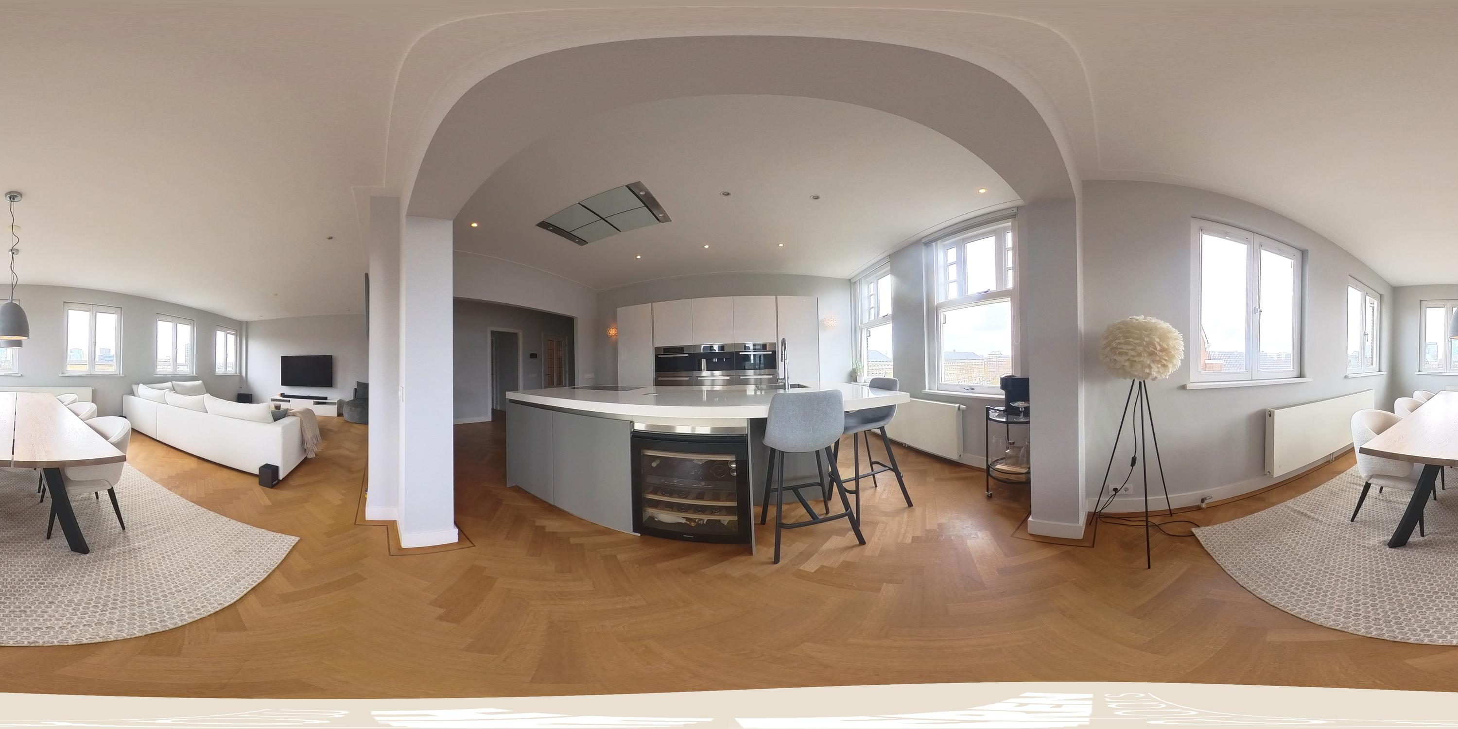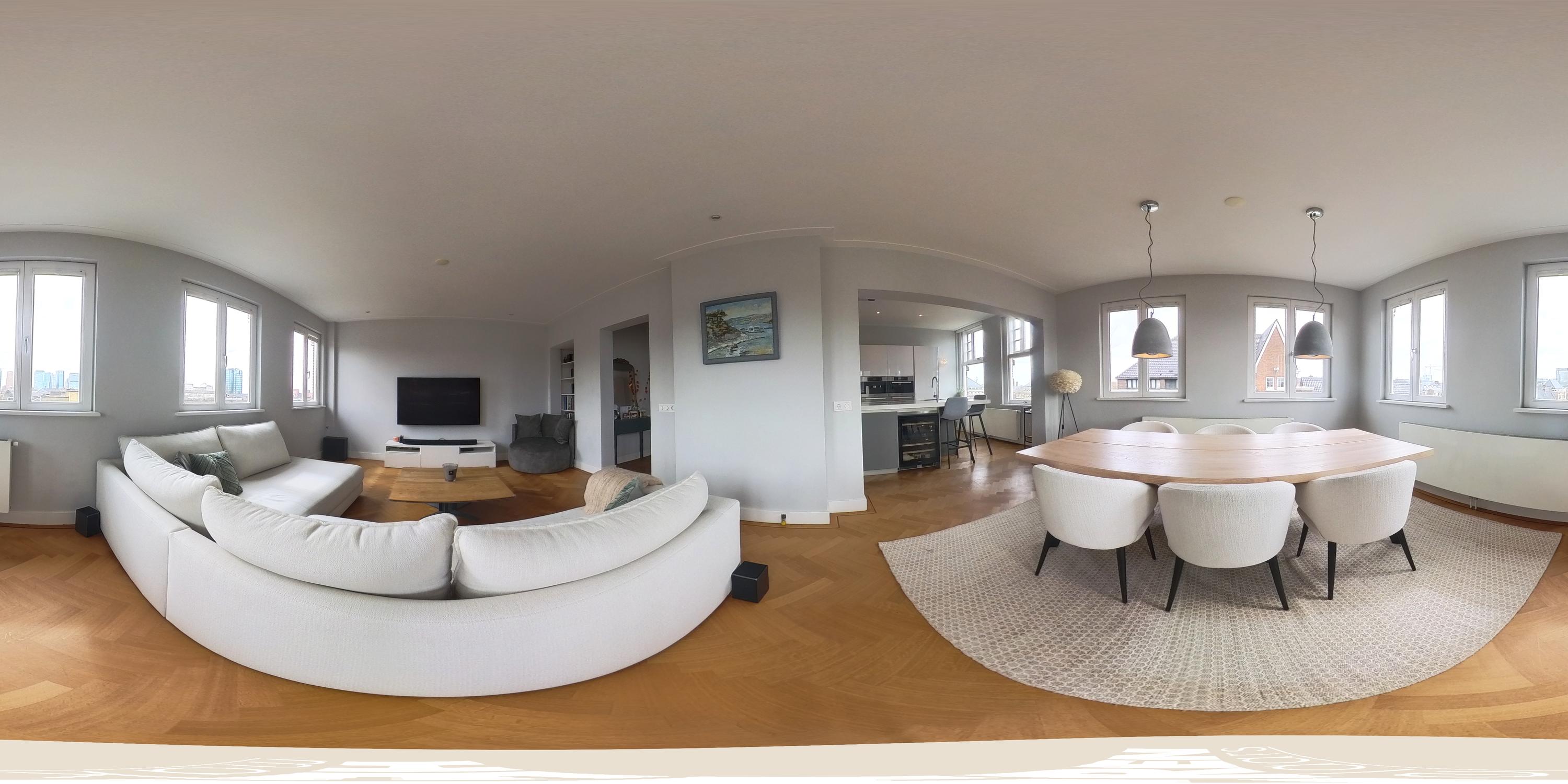 De aangrenzende woonkamer profiteert optimaal van de hoekligging en is dankzij maar liefst acht raampartijen uitzonderlijk licht. Het vrije uitzicht over het Minervaplein, de Michelangelostraat en de skyline van de Zuidas is indrukwekkend en met name in de avond bijzonder sfeervol.