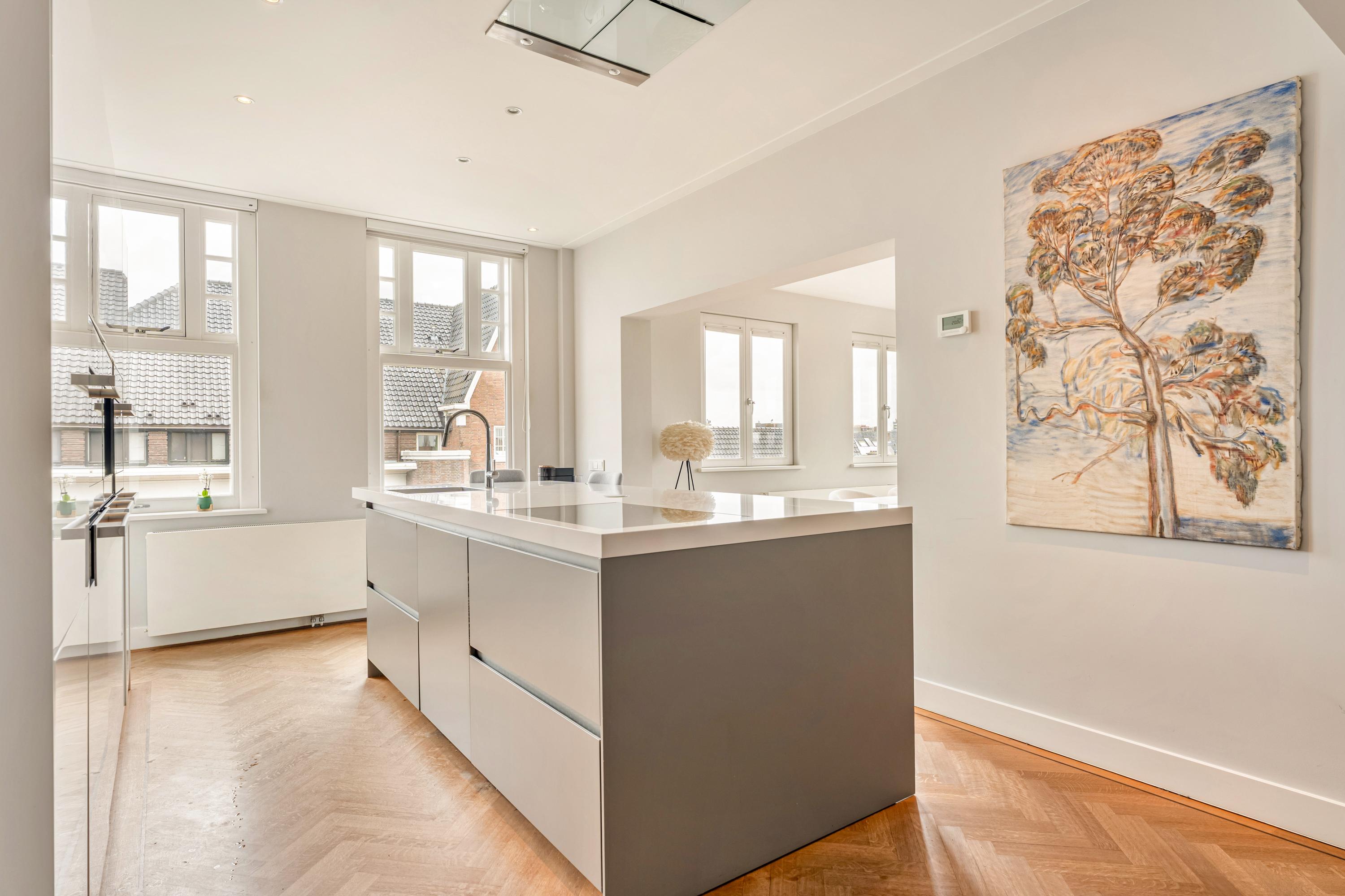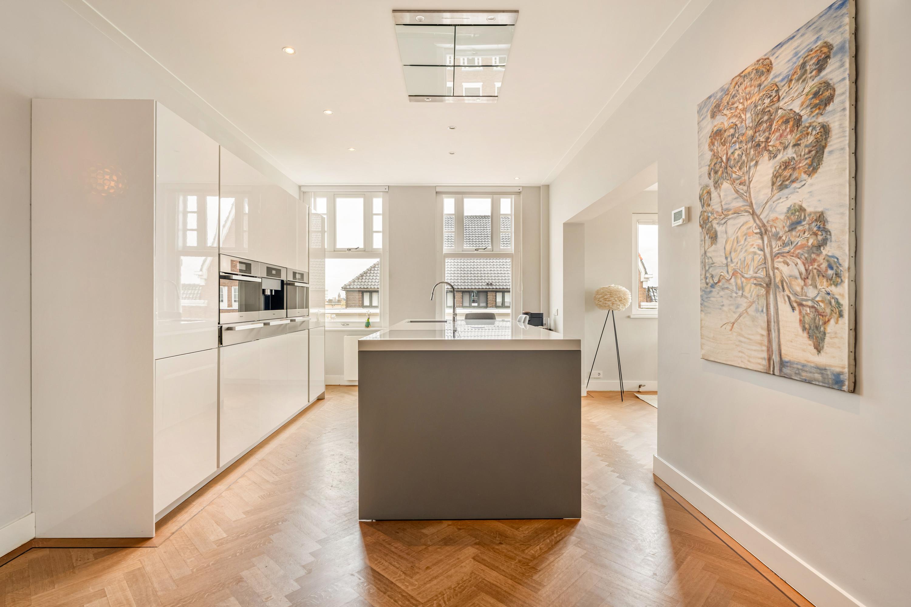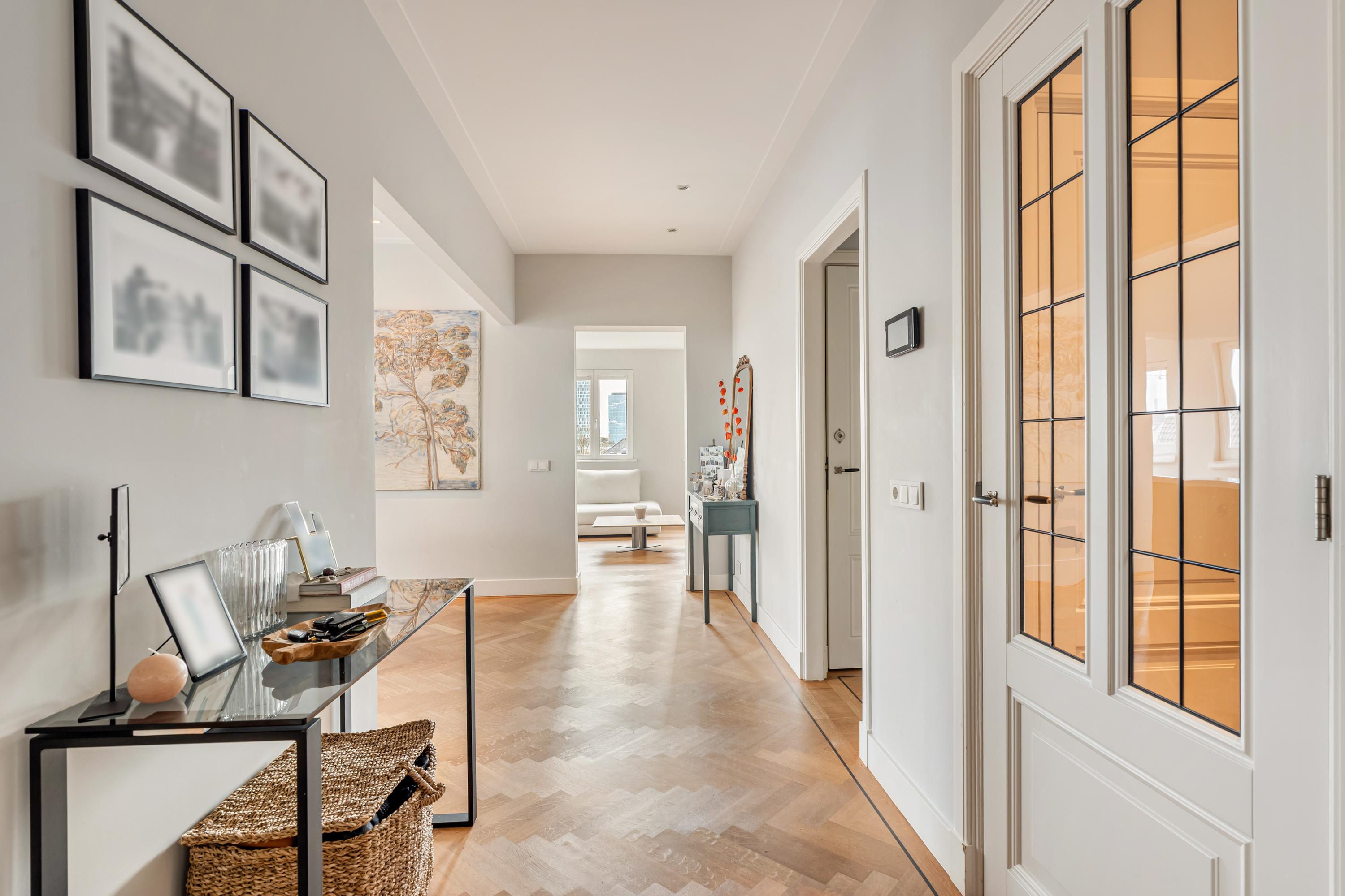 Het appartement is afgewerkt met een fraaie houten visgraatvloer en alle kozijnen zijn vernieuwd en uitgevoerd in hardhout met HR++ beglazing, waarbij het karakteristieke schuifraamsysteem is behouden en gemoderniseerd.