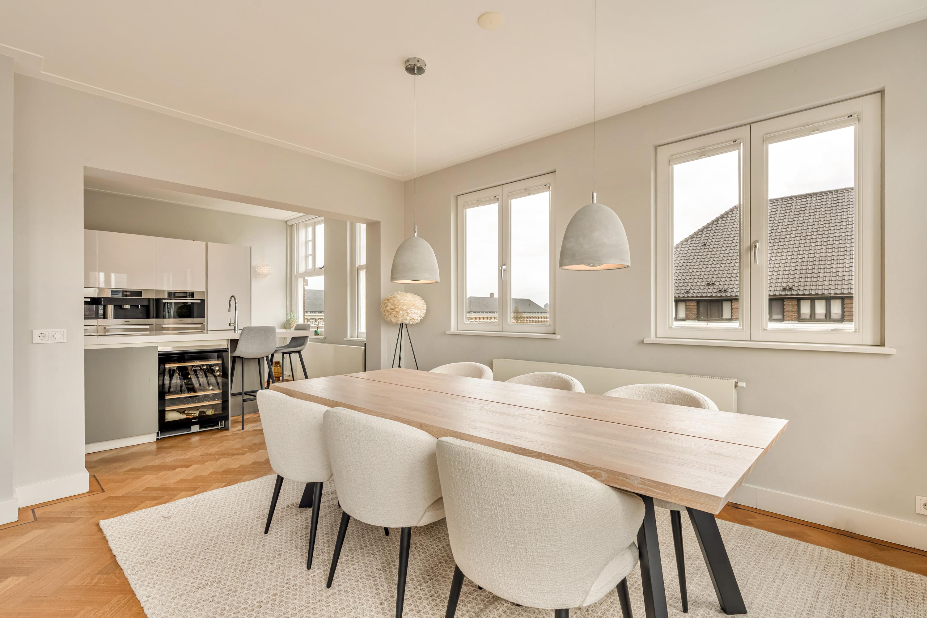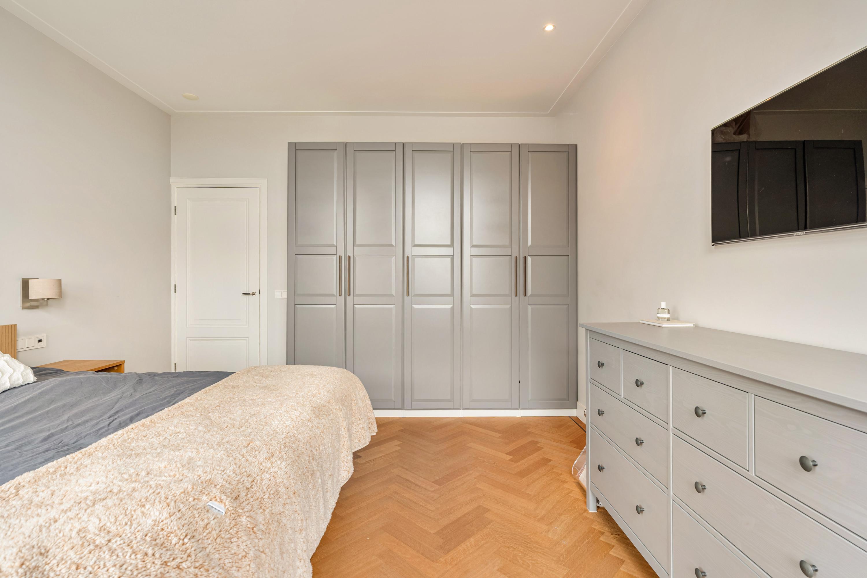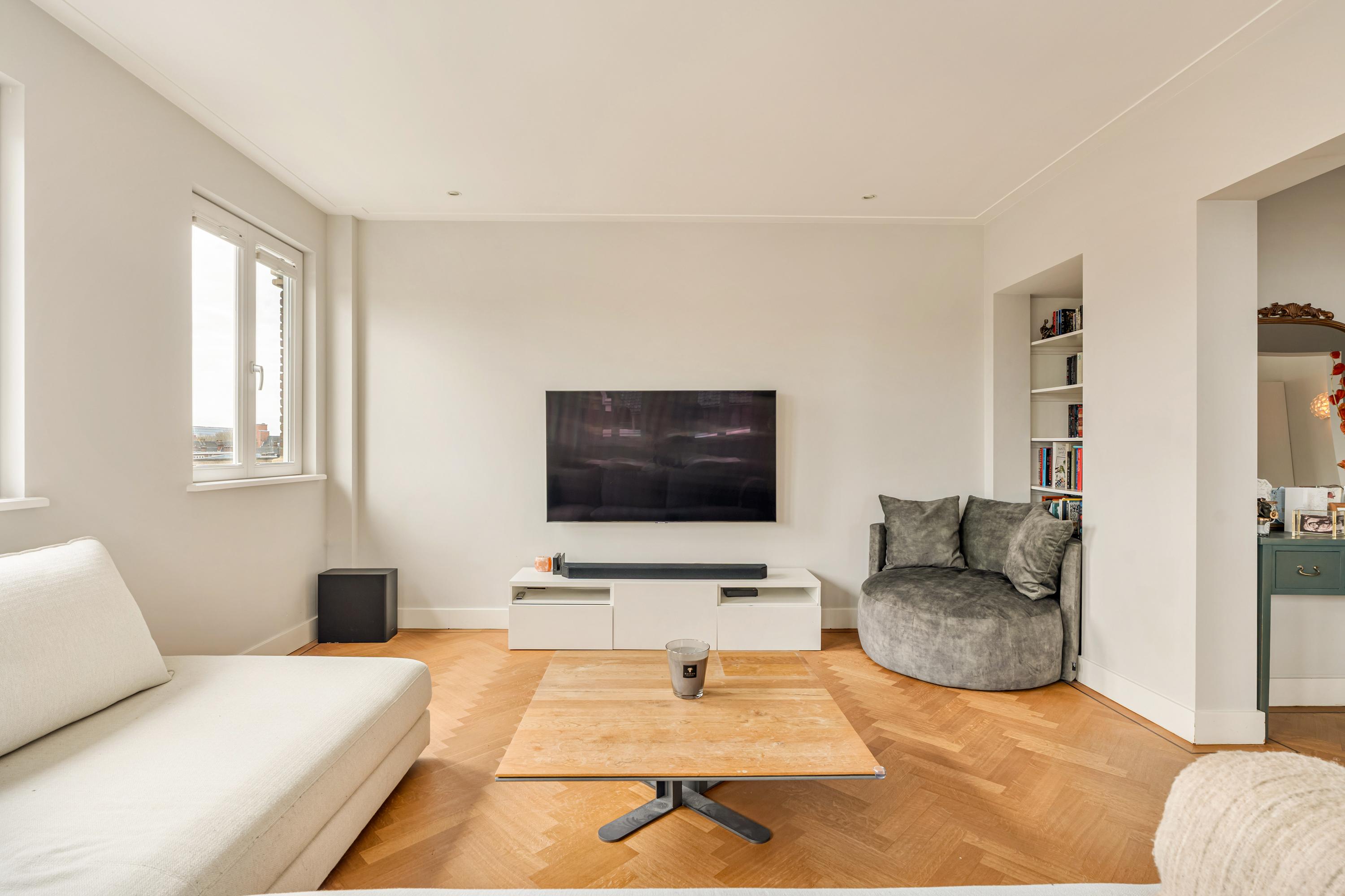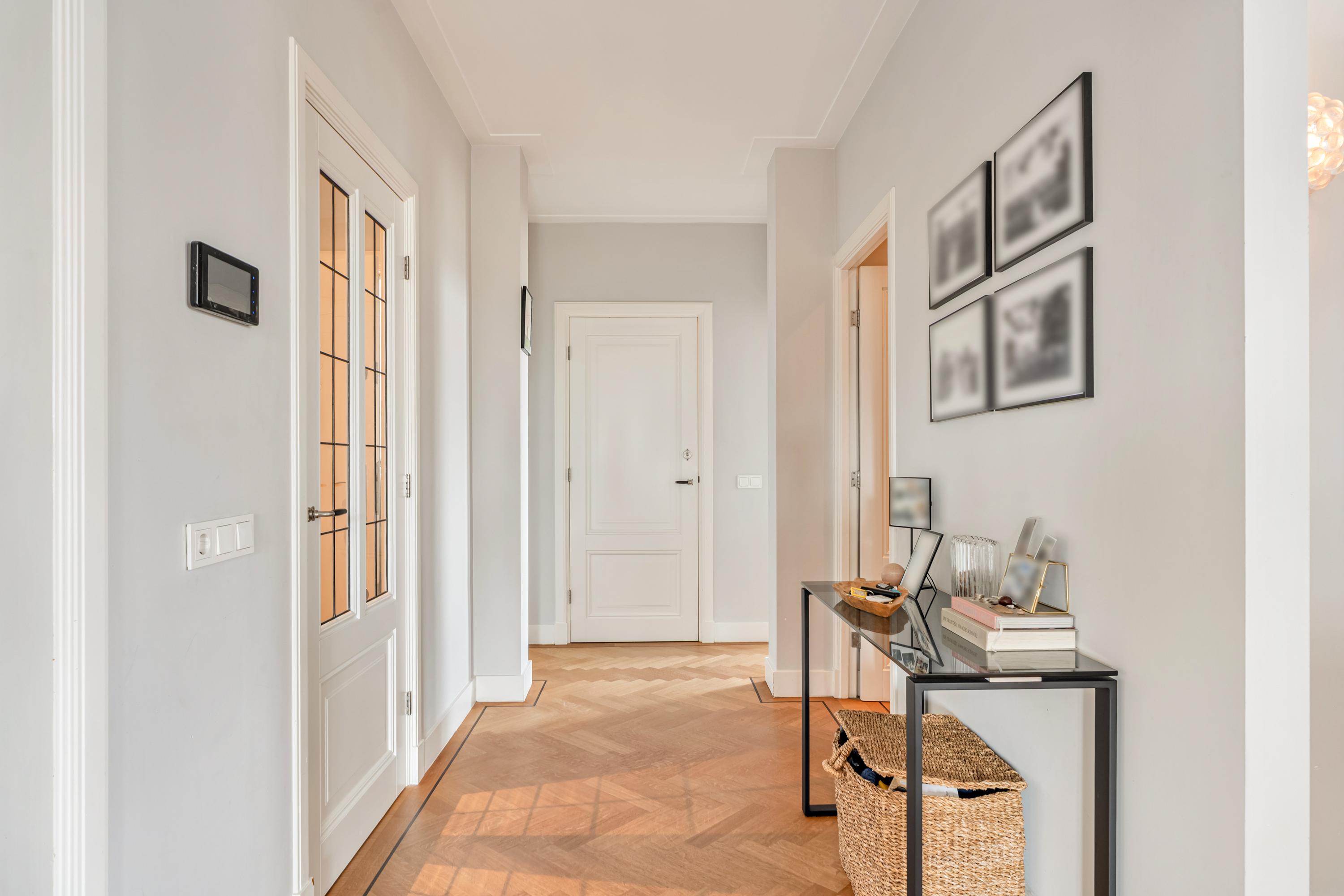Het appartement is afgewerkt met een fraaie houten visgraatvloer en alle kozijnen zijn vernieuwd en uitgevoerd in hardhout met HR++ beglazing, waarbij het karakteristieke schuifraamsysteem is behouden en gemoderniseerd.