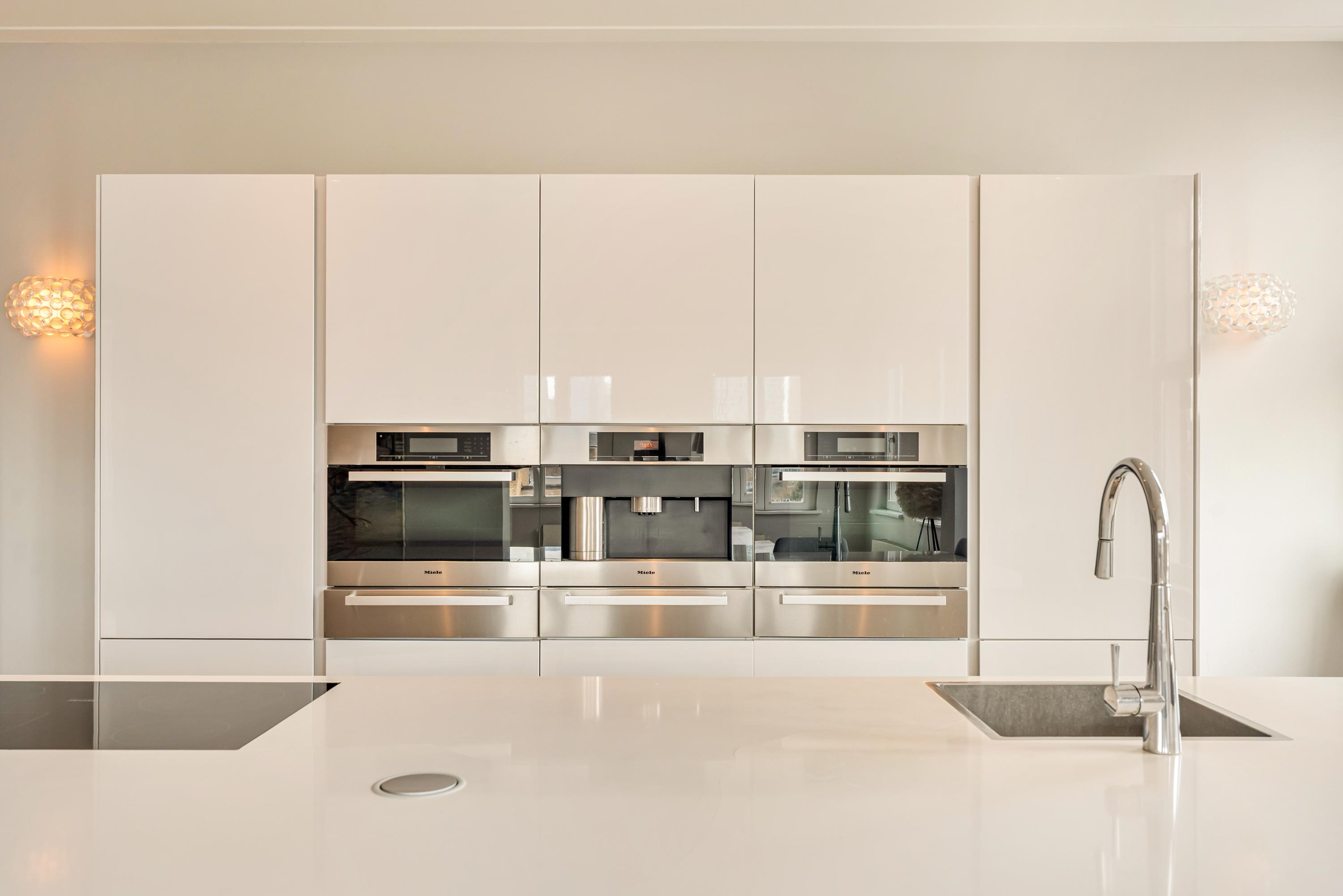 Entree met garderoberuimte en toegang tot de centrale hal, die alle vertrekken met elkaar verbindt. De luxe woonkeuken met kookeiland vormt het hart van de woning en is voorzien van hoogwaardige Miele inbouwapparatuur, waaronder een inductiekookplaat, (combi) stoomoven, heteluchtoven met warmtelades, koffiemachine, koelkast, vriezer, vaatwasser en wijnklimaatkast. Het eiland beschikt tevens over een comfortabel bargedeelte.